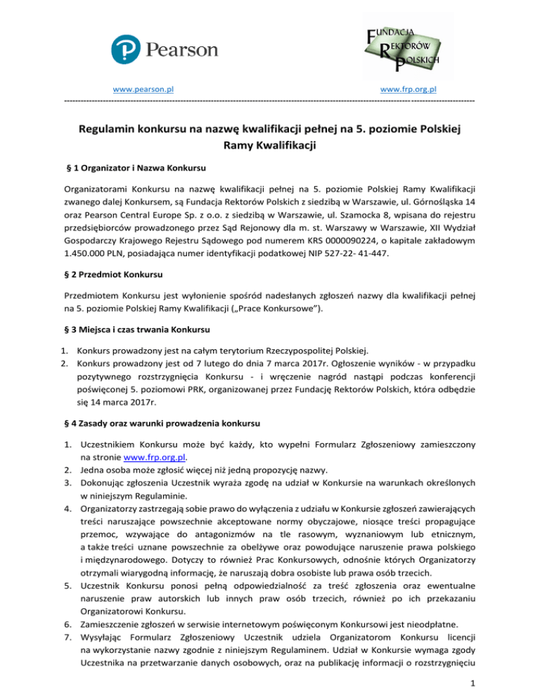 www.pearson.pl www.frp.org.pl ---------------------------------------------------------------------------------------------------------------------------------------------------- Regulamin konkursu na nazwę kwalifikacji pełnej na 5. poziomie Polskiej Ramy Kwalifikacji § 1 Organizator i Nazwa Konkursu Organizatorami Konkursu na nazwę kwalifikacji pełnej na 5. poziomie Polskiej Ramy Kwalifikacji zwanego dalej Konkursem, są Fundacja Rektorów Polskich z siedzibą w Warszawie, ul. Górnośląska 14 oraz Pearson Central Europe Sp. z o.o. z siedzibą w Warszawie, ul. Szamocka 8, wpisana do rejestru przedsiębiorców prowadzonego przez Sąd Rejonowy dla m. st. Warszawy w Warszawie, XII Wydział Gospodarczy Krajowego Rejestru Sądowego pod numerem KRS 0000090224, o kapitale zakładowym 1.450.000 PLN, posiadająca numer identyfikacji podatkowej NIP 527-22- 41-447. § 2 Przedmiot Konkursu Przedmiotem Konkursu jest wyłonienie spośród nadesłanych zgłoszeń nazwy dla kwalifikacji pełnej na 5. poziomie Polskiej Ramy Kwalifikacji („Prace Konkursowe”). § 3 Miejsca i czas trwania Konkursu 1. Konkurs prowadzony jest na całym terytorium Rzeczypospolitej Polskiej. 2. Konkurs prowadzony jest od 7 lutego do dnia 7 marca 2017r. Ogłoszenie wyników - w przypadku pozytywnego rozstrzygnięcia Konkursu - i wręczenie nagród nastąpi podczas konferencji poświęconej 5. poziomowi PRK, organizowanej przez Fundację Rektorów Polskich, która odbędzie się 14 marca 2017r. § 4 Zasady oraz warunki prowadzenia konkursu 1. Uczestnikiem Konkursu może być każdy, kto wypełni Formularz Zgłoszeniowy zamieszczony na stronie www.frp.org.pl. 2. Jedna osoba może zgłosić więcej niż jedną propozycję nazwy. 3. Dokonując zgłoszenia Uczestnik wyraża zgodę na udział w Konkursie na warunkach określonych w niniejszym Regulaminie. 4. Organizatorzy zastrzegają sobie prawo do wyłączenia z udziału w Konkursie zgłoszeń zawierających treści naruszające powszechnie akceptowane normy obyczajowe, niosące treści propagujące przemoc, wzywające do antagonizmów na tle rasowym, wyznaniowym lub etnicznym, a także treści uznane powszechnie za obelżywe oraz powodujące naruszenie prawa polskiego i międzynarodowego. Dotyczy to również Prac Konkursowych, odnośnie których Organizatorzy otrzymali wiarygodną informację, że naruszają dobra osobiste lub prawa osób trzecich. 5. Uczestnik Konkursu ponosi pełną odpowiedzialność za treść zgłoszenia oraz ewentualne naruszenie praw autorskich lub innych praw osób trzecich, również po ich przekazaniu Organizatorowi Konkursu. 6. Zamieszczenie zgłoszeń w serwisie internetowym poświęconym Konkursowi jest nieodpłatne. 7. Wysyłając Formularz Zgłoszeniowy Uczestnik udziela Organizatorom Konkursu licencji na wykorzystanie nazwy zgodnie z niniejszym Regulaminem. Udział w Konkursie wymaga zgody Uczestnika na przetwarzanie danych osobowych, oraz na publikację informacji o rozstrzygnięciu 1 Konkursu. Odpowiednie klauzule zgody zamieszczone zostały przez Organizatora pod Formularzem Zgłoszeniowym na stronie www.frp.org.pl. Dodatkowo Uczestnik może wyrazić zgodę na przetwarzanie jego danych osobowych w celach marketingowych przez Pearson Central Europe Sp. z o.o. z siedzibą w Warszawie oraz na przesyłanie przez Pearson Central Europe Sp. z o.o. z siedzibą w Warszawie informacji handlowej za pomocą środków komunikacji elektronicznej. Administratorem danych osobowych zebranych na potrzeby przeprowadzenia Konkursu oraz, w przypadku wyrażenia odrębnej zgody przez Uczestnika, w celu marketingowym, będzie Pearson Central Europe Sp. z o.o. z siedzibą w Warszawie przy ul. Szamockiej 8, wpisana do rejestru przedsiębiorców prowadzonego przez Sąd Rejonowy dla m. st. Warszawy w Warszawie, XII Wydział Gospodarczy Krajowego Rejestru Sądowego pod numerem KRS 0000090224. § 5 Rozstrzygnięcie Konkursu, nagrody, ogłoszenie wyników Konkursu 1. Propozycje nazwy dla kwalifikacji na 5. poziomie PRK można zgłaszać do dnia 7 marca 2017r. Do dnia 14 marca 2017r. odbędzie się posiedzenie Komisji Konkursowej, które wyłoni w toku obrad zwycięzców Konkursu, wybierając nagrodzone zgłoszenia nazw. 2. Kryteria oceny Prac Konkursowych obejmują trafność, innowacyjność, adekwatność nazw. 3. W skład Komisji Konkursowej obradującej pod przewodnictwem Prezesa FRP, wejdą członkowie Zarządu Fundacji oraz dwaj reprezentanci Pearson Central Europe. 4. W konkursie przyznana zostanie jedna nagroda główna. Organizatorzy dopuszczają przyznanie do trzech wyróżnień. 5. Warunkiem otrzymania nagrody jest podpisanie przez zwycięzcę lub zwycięzców umowy o przeniesienie praw autorskich do nazwy z Organizatorami Konkursu w takim zakresie, w jakim jest to niezbędne dla korzystania z nazwy i używania jej dla oznaczania kwalifikacji pełnej na 5. poziomie Polskiej Ramy Kwalifikacji. 6. Nagrodą będzie statuetka oraz dyplom. Dyplom zostanie przyznany osobie zgłaszającej zwycięską nazwę oraz reprezentowanej przez nią instytucji (o ile zostanie wskazana w zgłoszeniu konkursowym). 7. Laureaci Konkursu nie mogą przenieść prawa do uzyskania nagrody na osoby trzecie. 8. Organizatorzy zastrzegają prawo do przedstawienia zwycięskiej nazwy przedstawicielom Ministerstwa Edukacji Narodowej lub innych instytucji zaangażowanych w Zintegrowany Rejestr Kwalifikacji oraz Polską Ramę Kwalifikacji, jako propozycję nazwy dla kwalifikacji pełnej na 5. poziomie PRK. 9. Zwycięskie nazwy wraz z listą imion, nazwisk nagrodzonych Uczestników Konkursu zostaną opublikowane na stronie internetowej www.frp.org.pl nie później niż do 15 marca 2017r. W tym zakresie dane osobowe uczniów przetwarzane będą przez Fundację Rektorów Polskich z siedzibą w Warszawie, ul. Górnośląska 14. Podanie danych osobowych i wyrażenie zgody jest dobrowolne, ale konieczne do wzięcia udziału w Konkursie. Uczestnikom przysługuje prawo dostępu do treści danych