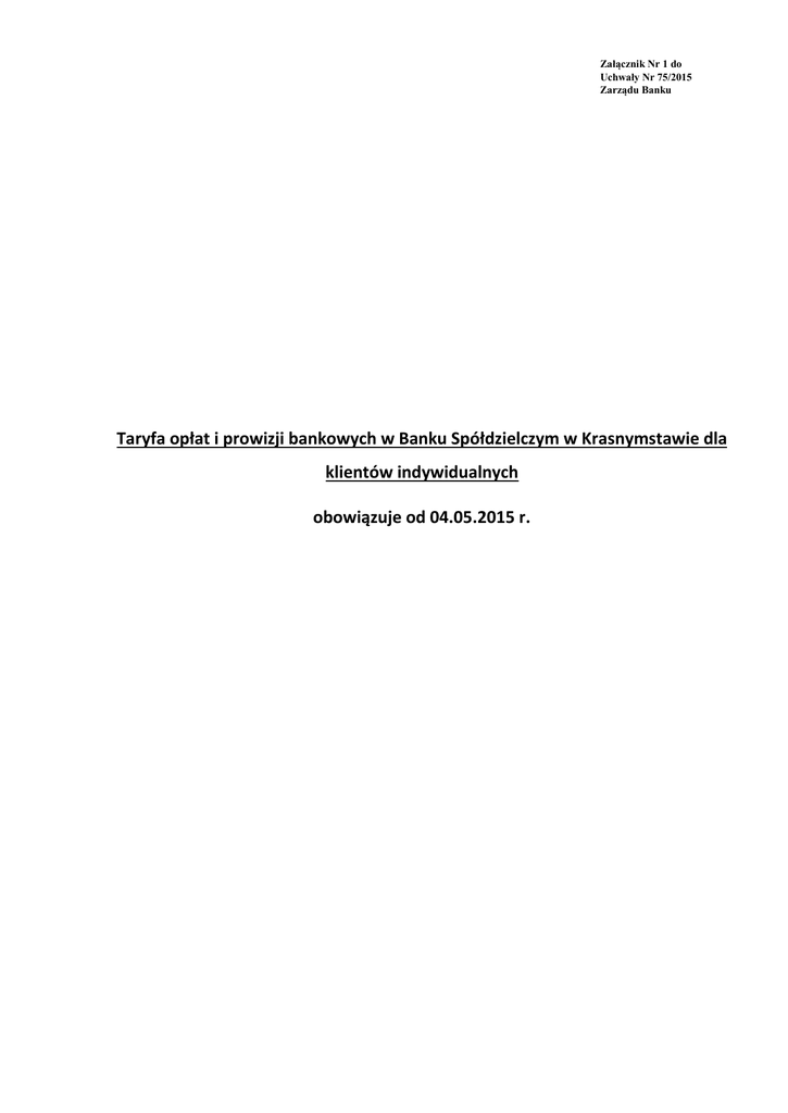 Załącznik Nr 1 do Uchwały Nr 75/2015 Zarządu Banku Taryfa opłat i prowizji bankowych w Banku Spółdzielczym w Krasnymstawie dla klientów indywidualnych obowiązuje od 04.05.2015 r. BANK SPÓŁDZIELCZY W KRASNYMSTAWIE 22-300 Krasnystaw ul. Mostowa 25 Zarejestrowany w Sądzie Rejonowym Lublin-Wschód w Lublinie z siedzibą w Świdniku, VI Wydział Gospodarczy KRS pod numerem 0000104200, NIP 5640001749, tel. (082) 576 27 65; 576 37 35; 576 17 18; fax (082) 576 31 67 e-mail: [email protected] www:bskrasnystaw.pl Zasady pobierania opłat i prowizji 1. 2. 3. 4. 5. 6. 7. 8. 9. 10. 11. 12. 13. 14. 15. 16. 17. Taryfa opłat i prowizji bankowych w Banku Spółdzielczym w Krasnymstawie dla Klientów Indywidualnych ma zastosowanie do czynności bankowych realizowanych w placówkach Banku Spółdzielczego w Krasnymstawie, zwanego dalej Bankiem, oraz przeprowadzanych za pośrednictwem bankowości internetowej. W przypadku transakcji wyrażonych w walutach obcych podstawę ustalenia opłat i prowizji stanowi równowartość w złotych kwoty transakcji. Opłaty i prowizje ustalane i pobierane są w złotych polskich, a jeżeli wnoszone są w walucie obcej dokonuje się ich przeliczenia zgodnie z średnim kursem NBP obowiązującym w dniu pobrania za wyjątkiem: a) operacji wykonywanych przy użyciu kart płatniczych – przeliczanych zgodnie z zawartymi umowami. Opłaty i prowizje pobierane są w następujących okresach: a) pobierane miesięcznie – ostatniego dnia miesiąca kalendarzowego lub w ostatnim dniu obowiązywania umowy, b) ustalone indywidualnie – w terminach określonych w umowie, c) przelewy, polecenia zapłaty, zlecenia stałe, monity – w chwili wykonania czynności, d) za pozostałe usługi – w chwili przyjęcia dyspozycji lub na koniec dnia, w którym złożono dyspozycję. W przypadku kosztów pośredniczących instytucji zagranicznych wyrażonej w walucie innej niż waluta transakcji, przeliczenie następuje według kursu średniego NBP z dnia pobrania kosztów. Koszty opłat i prowizji ponosi zleceniodawca transakcji chyba, że umowa stanowi inaczej lub Bank wyrazi zgodę na taka formę. Posiadacz rachunku zobowiązany jest zapewnić w terminach wymienionych w pkt 4 środki pieniężne niezbędne na pokrycie opłat i prowizji, a w przypadku braku środków Bank pobierze zaległe opłaty i prowizje z pierwszych wpływów na rachunek. Kwoty pobieranych opłat i prowizji podlegają zaokrągleniu według zasad ogólnych. Za czynności i usługi bankowe wykonywane na podstawie umów zawartych przez BS Krasnystaw z instytucjami lub podmiotami gospodarczymi, na zlecenie których dokonywane są operacje, Bank pobiera prowizję lub opłatę w wysokości określonej w umowie. Za wykonywanie czynności zleconych przez inny bank, BS Krasnystaw pobiera prowizję lub opłatę w wysokości uzgodnionej z tym bankiem w umowie. W przypadku operacji dewizowych pobiera się dodatkowo opłaty i prowizje podane przez banki pośredniczące i inne podmioty finansowe przy wykonaniu zlecenia oraz poniesione koszty kurierskie i telekomunikacyjne. Nie pobiera się prowizji i opłat od: a) wpłat darowizn na cele charytatywne, b) wpłat na poczet spłat odsetek i kredytów zaciągniętych w Banku, oraz od wypłat kredytów realizowanych z rachunków kredytowych oraz spłatę innych zobowiązań wobec Banku. Nie pobiera się opłaty za miesiąc, w którym nastąpiło otwarcie rachunku i za miesiąc, w którym rachunek zamknięto. Nie pobiera się opłaty za miesiąc, w którym nastąpiło wydanie karty i za miesiąc, w którym karta została zastrzeżona. Za wykonanie na wniosek Klienta usług niewymienionych w niniejszej Taryfie, Bank pobiera opłatę w wysokości uzgodnionej z Klientem. Bank nie realizuje transakcji walutowych w bilonie. W przypadku kwot niższych niż najniższy nominał banknotu w danej walucie, wypłata następuje w formie równowartości w złotych polskich. Wypłaty gotówkowe powyżej kwoty 50 tys. zł lub równe tej kwocie dokonywane są bezpłatnie pod warunkiem awizowania przez Klienta wypłaty w placówce Banku. Zgłoszenia należy dokonać najpóźniej do godziny 12.00 dnia roboczego poprzedzającego dzień, w którym ma nastąpić wypłata. 2 BANK SPÓŁDZIELCZY W KRASNYMSTAWIE 22-300 Krasnystaw ul. Mostowa 25 Zarejestrowany w Sądzie Rejonowym Lublin-Wschód w Lublinie z siedzibą w Świdniku, VI Wydział Gospodarczy KRS pod numerem 0000104200, NIP 5640001749, tel. (082) 576 27 65; 576 37 35; 576 17 18; fax (082) 576 31 67 e-mail: [email protected] www:bskrasnystaw.pl TARYFA OPŁAT I PROWIZJI BANKOWYCH DLA KLIENTÓW INDYWIDUALNYCH I. OBSŁUGA KASOWA I SKARBCOWA 1. WPŁATY GOTÓWKOWE 1) na rachunki prowadzone w Banku Spółdzielczym w Krasnymstawie 2) wpłaty obce na rachunek Przedsiębiorstwa Gospodarki Komunalnej 3) na rachunki prowadzone w innych bankach za usługi telekomunikacyjne, gaz, energię elektryczną, składki ubezpieczeniowej na rzecz KRUS, ZUS 4) wpłaty na rzecz US w Krasnymstawie 5) pozostałe na rachunki prowadzone w innych bankach 6) wypłat z rachunków prowadzonych przez inne banki spółdzielcze będące stroną Porozumienie w sprawie wzajemnej zastępczej obsługi czeków gotówkowych oraz książeczek oszczędnościowych z wkładami płatnymi na każde żądanie w Zrzeszeniu BPS S.A 7) ustalenie salda w innym Banku w związku z wypłatami, o których mowa w pkt 6) 2. CZYNNOŚCI SKARBCOWE 1) za zmianę krajowych znaków pieniężnych jednego nominału na inne nominały 2) za przyjęcie do przechowania kasety 3) depozyt złożony przez Posiadacza rachunku 4) depozyt złożony przez pozostałych klientów 5) depozyt złożony jako zabezpieczenie wierzytelności Banku Spółdzielczego w Krasnymstawie 3. OBSŁUGA WEKSLOWA 1) przedstawienie weksla do zapłaty (opłata pobierana od głównego dłużnika wekslowego Tryb pobierania Opłata PK Rudnik, Filia Izbica PK Urząd Skarbowy w Krasnymstawie za każdą dyspozycję 0 zł 0 zł 0 zł za każdą dyspo