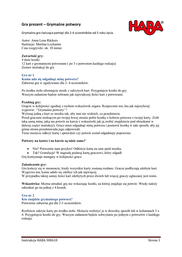 Gra prezent – Grymaśne potwory Grymaśna gra ćwicząca pamięć dla 2-4 uczestników od 5 roku życia. Autor: Anna Lena Räckers Ilustracje: Martina Leykamm Czas rozgrywki: ok. 10 minut Zawartość gry: 4 duże kostki 12 kart z grymaśnymi potworami ( po 3 z potworem każdego rodzaju) Zestaw instrukcji do gry Gra nr 1 Komu uda się odgadnąć minę potwora? Zabawna gra w zgadywanie dla 2- 4 uczestników. Po środku stołu uformujcie stosik z zakrytych kart. Przygotujcie kostki do gry. Waszym zadaniem będzie zebranie jak największej ilości kart z potworami. Przebieg gry: Grajcie w kolejności zgodnej z ruchem wskazówek zegara. Rozpocznie ten, kto jak najszybciej wypowie: ‘’Grymaśne potwory’’! Wylosuj jedną z kart ze stosiku tak, aby inni nie widzieli, co przedstawia. Przed graczem siedzącym po twojej lewej stronie połóż kostkę o kolorze potwora z twojej karty. Zrób taką samą minę, jaką ma potwór na karcie ( wskazówki jak ją zrobić znajdziecie pod obrazkami w dalszej części instrukcji). Gracz musi odgadnąć minę potwora i postawić kostkę w taki sposób, aby jej górna strona przedstawiała jego odpowiedź. Teraz możecie odkryć kartę i sprawdzić czy potwór został odgadnięty poprawnie. Potwory na kostce i na karcie są takie same? Nie? Potwornie nam przykro! Odłóżcie kartę na sam spód stosiku. Tak? Gratulacje! W nagrodę podaruj kartę graczowi, który odgadł. Grę kontynuuje następny w kolejności gracz. Zakończenie gry: Gra kończy się w momencie, kiedy wszystkie karty zostaną rozdane. Gracze podliczają zdobyte kart. Wygrywa ten, komu udało się zdobyć ich jak najwięcej. W przypadku takiej samej ilości kart zdobytych przez dwóch lub więcej graczy ogłaszany jest remis. Wskazówka: Można utrudnić grę nie wskazując kostki, na której znajduje się potwór. Wtedy należy odszukać go na jednej z 4 kostek. Gra nr 2 Kto znajdzie grymaśnego potwora? Potwornie zabawna gra dla 2-3 uczestników. Rozłóżcie zakryte karty po środku stołu. Możecie rozłożyć je w dowolny sposób lub w kolumnach 3 x 4. Przygotujcie kostki do gry. Waszym zadaniem będzie schwytanie po jednym z potworów z każdego rodzaju. Instrukcja HABA 300610 Strona 1 Przebieg gry: Grajcie w kolejności zgodnej z ruchem wskazówek zegara. Rozpoczyna ten, komu uda się zrobić potwornie śmieszną minę. Wyrzuć jedną dowolną kostką. Przyjrzyj się uważnie potworowi na kostce i odkryj jedną z dowolnych kart. Porównaj potwora z karty z tym z kostki. Odkryłeś takiego samego potwora? Nie. Potwornie nam przykro. Zakryj od nowa kartę. Tak. Brawo! Zrób taką samą minę jak ma potwór ( wskazówki jak ją zrobić znajdziecie pod obrazkami w dalszej części instrukcji). Udało Ci się? W nagrodę możesz zatrzymać kartę. Uwaga: jeżeli potwór, którego szukasz jest już w posiadaniu jednego z graczy wskaż go i wyrzuć ponownie kostką. Możesz spróbować po raz drugi. Grę kontynuuje następny w kolejności gracz. Zakończenie gry: Gra kończy się w momencie, kiedy jednemu z graczy uda się zdobyć po jednym potworze z każdego rodzaju. Zostaje okrzykniętym najlepszym poszukiwaczem grymaśnych potworów! Grymaśne potwory: Do robienia min angażujemy przede wszystkim oczy, usta, buzię i język. W niektórych minach należy użyć również rąk, jeżeli przedstawia to ilustracja. Niebieski grymaśne potwory: Nałóż wargę górną na dolną. Podnieś dwa palce do góry. Skoncentruj wzrok, popatrz się na czubek swojego nosa. Wargę dolną nałóż na górną. Zamknij oczy i ułóż usta w dziubek, tak jakbyś chciał dać komuś całusa. Rozłóż ręce po bokach i zegnij je w łokciach. Palce u dłoni rozstaw szeroko. Instrukcja HABA 300610 Strona 2 Czarne grymaśne potwory: Skoncentruj wzrok, popatrz się na czubek swojego nosa. Wyciągnij język i przesuwaj nim dookoła po zębach dolnych i górnych. Podnieś jedną rękę i skoncentruj na niej swój wzrok. Przesuwaj językiem po górnej wardze od prawego do lewego kącika ust. Zamknij oczy i skrzyżuj ręce. Przesuwaj językiem po dolnej wardze od prawego do lewego kącika ust. Żółte grymaśne potwory: Zapleć za głową ręce. Spójrz w dół i jednocześnie wysuń język w kierunku podbródka. Instrukcja HABA 300610 Strona 3 Spójrz w górę. Spróbuj dotknąć językiem nosa. Podnieś rękę i wskaż palcem w górę. Zamknij oczy i przesuwaj językiem od środka do zewnątrz podniebienia. Czerwone grymaśne potwory: Skoncentruj wzrok, popatrz się na czubek swojego nosa. Wypełnij policzki powietrzem. Wysuń rękę tak jakbyś trzymał w niej sznurek od balonika. Spójrz w górę, zamknięte usta rozciągnij jak najszerzej, tak, aby nie było widać zębów. Zegnij ręce w łokciach, dłonie zwróć na zewnątrz i wysuń palce wskazujące. Dotknij językiem jednej z wewnętrznych części policzka i popatrz się w tym samym kierunku. Jednocześnie dotknij palcem przeciwnej ręki drugiej dłoni. Instrukcja HABA 300610 Strona 4