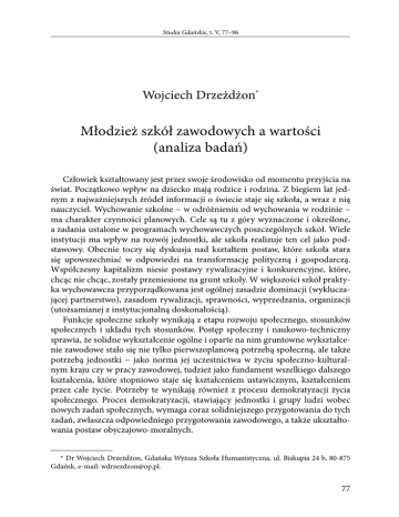 Studia Gdańskie, t. V, 77–96 Wojciech Drzeżdżon* Młodzież szkół zawodowych a wartości (analiza badań) Człowiek kształtowany jest przez swoje środowisko od momentu przyjścia na świat. Początkowo wpływ na dziecko mają rodzice i rodzina. Z biegiem lat jednym z najważniejszych źródeł informacji o świecie staje się szkoła, a wraz z nią nauczyciel. Wychowanie szkolne − w odróżnieniu od wychowania w rodzinie − ma charakter czynności planowych. Cele są tu z góry wyznaczone i określone, a zadania ustalone w programach wychowawczych poszczególnych szkół. Wiele instytucji ma wpływ na rozwój jednostki, ale szkoła realizuje ten cel jako podstawowy. Obecnie toczy się dyskusja nad kształtem postaw, które szkoła stara się upowszechniać w odpowiedzi na transformację polityczną i gospodarczą. Współczesny kapitalizm niesie postawy rywalizacyjne i konkurencyjne, które, chcąc nie chcąc, zostały przeniesione na grunt szkoły. W większości szkół praktyka wychowawcza przyporządkowana jest ogólnej zasadzie dominacji (wykluczającej partnerstwo), zasadom rywalizacji, sprawności, wyprzedzania, organizacji (utożsamianej z instytucjonalną doskonałością). Funkcje społeczne szkoły wynikają z etapu rozwoju społecznego, stosunków społecznych i układu tych stosunków. Postęp społeczny i naukowo-techniczny sprawia, że solidne wykształcenie ogólne i oparte na nim gruntowne wykształcenie zawodowe stało się nie tylko pierwszoplanową potrzebą społeczną, ale także potrzebą jednostki − jako norma jej uczestnictwa w życiu społeczno-kulturalnym kraju czy w pracy zawodowej, tudzież jako fundament wszelkiego dalszego kształcenia, które stopniowo staje się kształceniem ustawicznym, kształceniem przez całe życie. Potrzeby te wynikają również z procesu demokratyzacji życia społecznego. Proces demokratyzacji, stawiający jednostki i grupy ludzi wobec nowych zadań społecznych, wymaga coraz solidniejszego przygotowania do tych zadań, zwłaszcza odpowiedniego przygotowania zawodowego, a także ukształtowania postaw obyczajowo-moralnych. * Dr Wojciech Drzeżdżon, Gdańska Wyższa Szkoła Humanistyczna, ul. Biskupia 24 b, 80-875 Gdańsk, e-mail: [email protected]. 77 Wojciech Drzeżdżon Poznanie hierarchii wartości współczesnej młodzieży przez pedagogów, polityków, ekonomistów i specjalistów różnych dziedzin zajmujących się sprawami młodzieży ma wielorakie znaczenie. Pozwala lepiej zrozumieć cele i dążenia młodych ludzi oraz ułatwia analizę potrzeb życiowych, analizę potrzeb nastolatków. Służy również przewidywaniu dalszych dążeń i zachowań młodego pokolenia, co ma niebagatelne znaczenie dla prognozowania rozwoju społecznego. Praca stanowi podstawowe źródło wiedzy człowieka, jego przeżyć i umiejętności wartościowania. Człowiek nie tylko widzi w pracy czynności zapewniające środki materialne potrzebne do życia, lecz również traktuje ją jako naturalną potrzebę, obowiązek społeczny i warunek własnego rozwoju. Praca jest głównym czynnikiem decydującym o wykorzystaniu możliwości życiowych człowieka, odgrywa zasadniczą rolę w jego rozwoju i stanowi naturalną podstawę życia społecznego. Jest tą szczególną wartością, dzięki której powstają i funkcjonują społecznie wszystkie inne wartości. Badania dotyczące wartości uznawanych przez młodzież szkół zawodowych przeprowadzono w połowie 2005 roku w szkołach zlokalizowanych na terenie miasta Tczewa. Ogólna populacja badanej młodzieży wyniosła 231 osób, z czego 66,2% stanowili chłopcy, a 33,8% dziewczęta. Jest to młodzież reprezentująca miasto Tczew i okoliczne wsie należące do powiatu tczewskiego. Hierarchia wartości badanej młodzieży Poniżej zostanie przedstawiona hierarchia wartości badanej młodzieży, biorąc pod uwagę trzy grupy wartości (edukacyjne, pracy, rodzinne) uwzględnionych w badaniu. Każda z grup wartości reprezentowana była w kwestionariuszu przez 20 zdań wskaźnikowych. Każdy badany oceniał te zdania w skali pięciopunktowej. Odpowiadała temu stosowana podczas kodowania wyników punktacja; najwyższa aprobata zdania afirmującego daną wartość oznaczała przyznanie 2 punktów, umiarkowana aprobata przyznanie 1 punktu, ambiwalencja („nie wiem, nie mam zdania”) 0, umiarkowana negacja −1, a zdecydowane odrzucenie takiego zdania −2. Badania wykazały, że młodzież najwyżej ceni wartości związane z edukacją. Wartości edukacyjne uzyskały najwyższy wskaźnik uznania – 0,61. Nieco niżej zostały ocenione wartości związane z pracą (0,58), najniżej zaś wartości rodzinne (0,53). Wszystkie badane wartości uzyskały średni wskaźnik uznania nieco niższy niż 1,0, co oznacza, że te wartości są uznawane przez ogół uczniów w sposób umiarkowany. B. Hiszpańska, Pomóż młodzieży znaleźć wartości-drogowskazy. Warszawa 1992. W. Drzeżdżon, Wpływ zmian w edukacji na system wartości młodego człowieka. „Studia Gdańskie. Wizje i rzeczywistość” 2007, t. IV, s. 24−34. 78 Młodzież szkół zawodowych a wartości (analiza badań) Tabela 1. Hierarchia wartości ogółu badanych uczniów (N=231) Ranga Wartości Średni wskaźnik oceny wartości (W) Odchylenie standardowe (s) 1. Edukacyjne 0,61 0,59 2. Związane z pracą 0,58 0,77 3. Rodzinne 0,53 0,76 0,57 0,70 Ogółem Wśród ogółu respondentów stosunkowo wysoko ocenione zostały wartości edukacyjne. Biorąc jednak pod uwagę to, że respondentami byli uczniowie szkół, należy przyznać, iż wskaźnik uznania jest stosunkowo niski. Uzyskany wynik świadczy o tym, że uczniowie zajmują wobec edukacji jako wartości postawę pośrednią między całkowitą ambiwalencją a umiarkowaną akceptacją. Jak podaje Mirosław J. Szymański, „zjawisko to jest możliwą do przewidzenia konsekwencją trwającej od wielu lat tendencji spychania edukacji przez kolejne rządy na drugoplanow