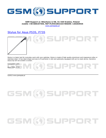 GSM-Support ul. Bitschana 2/38, 31-420 Kraków, Poland mobile +48 608107455, NIP PL9451852164 REGON: 120203925 www.jamepda.pl Stylus for Asus P535, P735 Stylus is a basic tool for everyday work with your palmtop. Stylus is made of high quality aluminium and magnesium alloy or stainless steel. It has ideal shape and size to fit perfectly in slot and optionally equipped with pin to reset device. Sensitive stylus tip will not scratch a screen. Compatible with: Asus P535, P735 ©2012 www.jamepda.pl Powered by TCPDF (www.tcpdf.org)