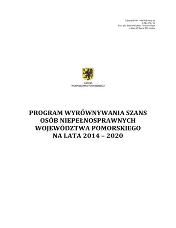 Załącznik Nr 1 do Uchwały nr 821/371/14 Zarządu Województwa Pomorskiego z dnia 29 lipca 2014 roku PROGRAM WYRÓWNYWANIA SZANS OSÓB NIEPEŁNOSPRAWNYCH WOJEWÓDZTWA POMORSKIEGO NA LATA 2014 – 2020 SPIS TREŚCI WYKAZ UŻYTYCH SKRÓTÓW: ...........................................................................................3 SŁOWNICZEK KLUCZOWYCH POJĘĆ: ................................................................................4 WPROWADZENIE ................................................................................................................5 1. SYTUACJA POMORSKICH OSÓB NIEPEŁNOSPRAWNYCH........................................7 2. CELE, PRIORYTETY I DZIAŁANIA ............................................................................ 12 3. RAMY FINANSOWE .................................................................................................... 18 4. KLUCZOWI PARTNERZY ........................................................................................... 19 5. SYSTEM REALIZACJI, MONITOROWANIA ORAZ OCENY REALIZACJI .................. 19 6. PROCEDURA AKTUALIZACJI ....................................................................................20 Strona 2 z 20 WYKAZ UŻYTYCH SKRÓTÓW ES Ekonomia społeczna GUS Główny Urząd Statystyczny JST Jednostki samorządu terytorialnego NFZ Narodowy Fundusz Zdrowia NGO Organizacje pozarządowe ON Osoby Niepełnosprawne PFRON Państwowy Fundusz Rehabilitacji Osób Niepełnosprawnych PO KL Program Operacyjny Kapitał Ludzki POW NFZ Pomorski Oddział Wojewódzkiego Narodowego Funduszu Zdrowia PSME Pomorski System Monitoringu i Ewaluacji ROPS Regionalny Ośrodek Polityki Społecznej Urzędu Marszałkowskiego Województwa Pomorskiego RPS Regionalny Program Strategiczny SRWP Strategia Rozwoju Województwa Pomorskiego 2020 SPSWP Strategia Polityki Społecznej Województwa Pomorskiego na lata 2014–2020 UMWP Urząd Marszałkowski Województwa Pomorskiego ZWP Zarząd Województwa Pomorskiego Strona 3 z 20 SŁOWNICZEK KLUCZOWYCH POJĘĆ Osoba niepełnosprawna to osoba, której stan fizyczny, psychiczny lub umysłowy trwale lub okresowo utrudnia, ogranicza bądź uniemożliwia wypełnianie ról społecznych, a w szczególności ogranicza zdolności do wykonywania pracy zawodowej. Rehabilitacja zawodowa osób niepełnosprawnych ma na celu przygotowanie osoby niepełnosprawnej do uzyskania zatrudnienia i wykonywania pracy. W ramach rehabilitacji zawodowej podejmowanych jest szereg działań, które mają na celu pomoc w powrocie osób niepełnosprawnych na rynek pracy. Rehabilitacja społeczna ma na celu umożliwianie osobom niepełnosprawnym uczestnictwa w życiu społecznym. Rehabilitacja lecznicza ma na celu przywrócenie pełnej lub możliwej do osiągnięcia sprawności fizycznej i psychicznej, zdolności do pracy oraz poprawę jakości życia. Edukacja włączająca oparta jest na społecznym modelu postrzegania niepełnosprawności, który uznaje, iż przyczynami niepełnosprawności są między innymi tworzone przez społeczeństwo bariery: społeczne, ekonomiczne, prawne, organizacyjne. A zatem społeczeństwo jest odpowiedzialne za zmniejszenie skutków niepełnosprawności i włączenie tych osób do życia społecznego. Dla oświaty i dla szkół będzie to oznaczało zniesienie wszelkich barier mentalnych, psychologicznych, edukacyjnych, technicznych, organizacyjnych i architektonicznych, które uniemożliwiają bądź utrudniają uczniom ze specjalnymi potrzebami edukacyjnymi funkcjonowanie w szkole. Strona 4 z 20 WPROWADZENIE Głównym celem Programu Wyrównywania Szans Osób Niepełnosprawnych Województwa Pomorskiego na lata 2014-2020 jest włączenie społeczne i zawodowe osób niepełnosprawnych. Wysoka efektywność tych dwóch procesów prowadzi bezpośrednio do poprawy warunków życia, zwiększenia integracji społecznej osób niepełnosprawnych oraz przeciwdziałania ich społecznemu wykluczeniu. Osiągnięcie założonego celu będzie polegało przede wszystkim na tworzeniu zewnętrznych warunków sprzyjających włączaniu społecznemu osób niepełnosprawnych oraz na realizacji działań ukierunkowanych bezpośrednio na aktywizację osób niepełnosprawnych, i ich rodzin. Oba kierunki interwencji w swym założeniu mają prowadzić wprost do wzmocnienia samodzielności i zdolności do samoorganizacji ON i ich środowiska. Podstawą polityki wobec osób niepełnosprawnych jest założenie, że osoba niepełnosprawna posiada takie same potrzeby jak osoba sprawna. Ich zaspokajanie powinno być więc realizowane na poziomie analogicznym do pozostałej części społeczeństwa. Trzeba pamiętać, że traktowanie osoby niepełnosprawnej na równi z osobami sprawnymi nie powinno prowadzić jednak do zaniechania koniecznych działań kompensujących negatywne zjawiska towarzyszące niepełnosprawności. Niezwykle ważne jest harmonijne i racjonalne projektowanie działań i polityka wobec osób niepełnosprawnych, które opierając się jedynie na koncepcjach pomocy społecznej i działaniach charytatywnych, nie rozwiązują żadnego problemu osób niepełnosprawnych. Nie daje im też poczucia bycia samodzielnym podmiotem, który podejmuje niezależne decyzje i bierze odpowiedzialność za sprawy, które jego dotyczą. Perspektywa aktywizacji, wsparcia środowiskowego osób niepełnosprawnych jest zawarta w politykach, programach i przedsięwzięciach unijnych. Państwa unijne zostały zobowiązane do szczególnego uwzględnienia problemów ludzi niepełnosprawnych w Narodowych Planach Rozwoju. Zarówno dokumenty unijne, jak i krajowe zakładają pełnosprawne uczestnictwo osób niepełnosprawnych w życiu społecznym, równe szanse w dostępie do świadczeń i usług wysokiej jakości. Zagwarantowanie osobom niepełnosprawnym możliwości pełnoprawnego uczestniczenia w życiu społecznym jest więc sposobem realizacji konstytucyjnych praw człowieka i obywatela. Treści Programu są więc sp