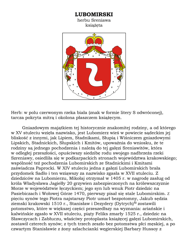 LUBOMIRSKI herbu Sreniawa książęta Herb: w polu czerwonym rzeka biała (znak w formie litery S odwróconej), tarcza pokryta mitrą i okolona płaszczem książęcym. Gniazdowym majątkiem tej historycznie znakomitej rodziny, a od którego w XV stuleciu wzięła nazwisko, jest Lubomierz wieś w powiecie sądeckim jej bliskość z innymi, jak Lipiem, Stadnikami, Słupią i Wiśniczem gniazdowymi Lipskich, Stadnickich, Słupskich i Kmitów, upoważnia do wniosku, że te rodziny są jednego pochodzenia i należą do tej gałęzi Sreniawitów, która w odległej przeszłości, opuściwszy siedzibę rodu swojego nadbrzeża rzeki Szreniawy, osiedliła się w podkarpackich stronach województwa krakowskiego; wspólność też pochodzenia Lubomirskich ze Stadnickimi i Kmitami zaświadcza Paprocki. W XIV stuleciu jedna z gałęzi Lubomirskich brała przydomek Sadło i ten wziąwszy za nazwisko zgasła w XVII stuleciu. Z dziedziców na Lubomierzu, Mikołaj otrzymał w 1405 r. w nagrodę zasług od króla Władysława Jagiełły 20 grzywien zabezpieczonych na królewszczyznie Morze w województwie łęczyckiem; jego syn lub wnuk Piotr dziedzic na Pasiebiczach i Wołowej Górze 1470, pierwszy pisał się stale Lubomirskim. Z pięciu synów tego Piotra najstarszy Piotr umarł bezpotomny, Jakub sędzia ziemski krakowski 1510 r., Stanisław i Dezydery (Dytrych)1) zostawili potomstwo, które w większej części przeszedłszy na wyznania: ariańskie i kalwińskie zgasło w XVII stuleciu, piąty Feliks zmarły 1525 r., dziedzic na Sławczycach i Zabłuczu, właściwy protoplasta książęcej gałęzi Lubomirskich, zostawił czterech synów; z tych trzech zeszło bez potomstwa płci męskiej, a po czwartym Stanisławie z żony szlachcianki węgierskiej Barbary Hussoy z Zablatha, syn Sebastian kasztelan wojnicki, jak był pierwszym senatorem w swojej rodzinie, tak twórcą jej znaczenia i świetności, niezwykle zabiegły i przedsiębiorczy, zebrał kolosalny majątek, dzierżawiąc żupy solne, prowadząc na wielką skalę handel wołami, pienką i zbożem, biorąc udział w przedsiębiorstwach górniczych na Spiżu i w Olkuszu, frymarcząc majątkami i wyciągając z nich możliwe zyski przez podniesienie pańszczyzny i nakładanie nieznanych dotychczas powinności i opłat na wieśniaków, że to był pierwszy przykład wielkiego majątku nieopartego na wynagrodzeniu zasług lub względach monarszych, Lubomirski był celem przekąsów i zawiści współczesnych, tym więcej, że raził niezwykłą a niemiłą szlachcie oszczędnością, a doszedłszy do majątku ambicją i dumą. Córki wydawał za mąż tylko w domy pańskie, a dla siebie w 1592 r. pozyskał od cesarza Rudolfa tytuł hrabii państwa rzymskicgo na Wiśniczu, dawnym dziedzictwie Kmitów. Umarł 1613, zostawiwszy z żony Anny Branickiej herbu Gryf, sześć córek i dwóch synów. Z córek dwie były zakonnicami, z czterech innych, Katarzyna zaślubiła Janusza księcia Ostrogskiego kasztelana krakowskiego, najmożniejszego z panów ówczesnych, Zofia Mikołaja hr. Oleśnickiego wojewodę lubelskiego, Barbara Jana Zebrzydowskiego miecznika wielkiego koronnego, a Krystyna Stanisława Kaniecpolskiego hetmana; z synów Joachim umarł 1610 młody i bezdzietny przy oblężeniu Smoleńska, a Stanisław wajewoda krakowski 1638, po ojcu pan ogromnega majątku, zwiększył go jeszcze własnym zabiegiem gospodarczym, bogatym posagiem żony Zofii księżniczki Ostrogskiej wojewodzianki wołyńskiej i dziesięcioma intratnymi starostwami. W przeciwieństwie jednak z ojcem prowadził życie okazałe i wystawne, chociaż to może nie było w jego naturze, lecz w interesie polityki magnackiej, a w celu pozyskania popularności u szlachty, trzymał dla niej w swej rezydencji w Łańcucie zawsze stoły otwarte, jego dwór przewyższał wszystkie inne okazałością i liczbą, samej milicji nadwornej stale utrzymywał 6000, a dla pozyskania duchowieństwa, zaczynającego już być w owych czasach wielowładnym, więcej niż dwadzieścia kościołów wzniósł lub restaurował, ztąd też jeden z panegirystów napisał: „Nagrodził Lubomirskiemu Pan Bóg z innej strony, On dał Bogu tysiące, Bóg jemu miliony.” Popularność też pozyskał ogromną, a zwiększył ją gdy po Chodkiewiczu objąwszy dowództwo w wyprawie chocimskiej, szczęśliwie odparłszy szturmy tureckie, skłonił sułtana Osmana do zawarcia zaszczytnego dla Polski przymierza, sądził się zatem godnym buławy hetmańskiej, a gdy tej nie otrzymał, stanął na czele opozycji i nią zakłócał tak resztę panowania Zygmunta III jak i rządy Władysława IV, ta zaś opozycja tym była szkodliwszą krajowi, że ją obracał na korzyść Austrii, której był zawsze gorliwym stronnikiem, swojemu domowi wiele się zasłużył, ustalił jego znaczenie magnackie, pozyskał mu popularność, powiększył dostatki i nadał blask tytułem książęcym, który nie poprzestając na hrabiowskim, otrzymał od cesarza Ferdynanda III w 1647, umarł 1649 r, zostawiwszy dwie córki i trzech synów. Z córek Krystyna zaślubiła Alberta księcia Radziwiłła kanclerza wielkiego litewskiego, a Konstancja Franciszka Czarnkowskiego kasztelana poznańskiego. Z synów: 1. Konstanty-Jacek podczaszy koronny bezpotomny. 2. Aleksander-Michał wojewoda krakowski, nie odznaczający się zdolnościami, lecz zacny i nieposzlakowanej prawości, królom stale wierny, w rokoszu brata Jerzego nie brał udziału i do fakcji panów przeciwnych Michałowi Wiśniowieckiemu nie chciał należeć; umarł 1676, z żony Tekli-Heleny Ossolińskiej córki słynnego kanclerza Jerzego, zostawił syna Józefa-Karola marszałka wielkiego koronnego, który za żoną Teofilą księżniczką Zasławską ostatnią z swojej familii odziedziczywszy w posagu ordynację ostrogską, przy poparciu króla Jana III, utrzymał się przy niej, wbrew rozporządzenia jej założyciela, który w razie wygaśnięcia swojego domu, przeznaczał tę 