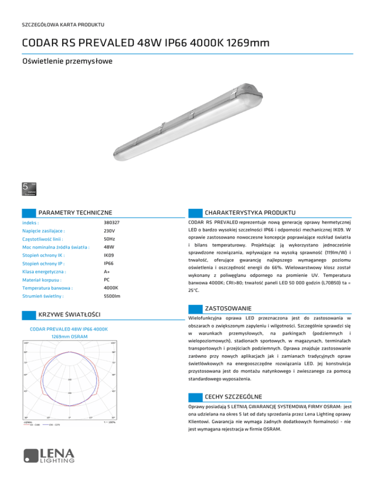 SZCZEGÓŁOWA KARTA PRODUKTU CODAR RS PREVALED 48W IP66 4000K 1269mm Oświetlenie przemysłowe OSRAM PARAMETRY TECHNICZNE indeks : 380327 CODAR RS PREVALED reprezentuje nową generację oprawy hermetycznej Napięcie zasilajace : 230V LED o bardzo wysokiej szczelności IP66 i odporności mechanicznej IK09. W Częstotliwość linii : 50Hz oprawie zastosowano nowoczesne koncepcje poprawiające rozkład światła Moc nominalna źródła światła : 48W i bilans temperaturowy. Projektując ją wykorzystano jednocześnie Stopień ochrony IK : IK09 Stopień ochrony IP : IP66 Klasa energetyczna : A+ Materiał korpusu : PC Temperatura barwowa : 4000K Strumień świetlny : 5500lm sprawdzone rozwiązania, wpływające na wysoką sprawność (119lm/W) i trwałość, KRZYWE ŚWIATŁOŚCI CODAR PREVALED 48W IP66 4000K 1269mm OSRAM oferujące gwarancję najlepszego wymaganego poziomu oświetlenia i oszczędność energii do 66%. Wielowarstwowy klosz został wykonany z poliwęglanu odpornego na promienie UV. Temperatura barwowa 4000K; CRI>80; trwałość paneli LED 50 000 godzin (L70B50) ta = 25°C. CHARAKTERYSTYKA PRODUKTU ZASTOSOWANIE Wielofunkcyjna oprawa LED przeznaczona jest do zastosowania w obszarach o zwiększonym zapyleniu i wilgotności. Szczególnie sprawdzi się w warunkach przemysłowych, na parkingach (podziemnych i wielopoziomowych), stadionach sportowych, w magazynach, terminalach transportowych i przejściach podziemnych. Oprawa znajduje zastosowanie zarówno przy nowych aplikacjach jak i zamianach tradycyjnych opraw świetlówkowych na energooszczędne rozwiązania LED. Jej konstrukcja przystosowana jest do montażu natynkowego i zwieszanego za pomocą standardowego wyposażenia. CECHY SZCZEGÓLNE Oprawy posiadają 5 LETNIĄ GWARANCJĘ SYSTEMOWĄ FIRMY OSRAM: jest ona udzielana na okres 5 lat od daty sprzedania przez Lena Lighting oprawy Klientowi. Gwarancja nie wymaga żadnych dodatkowych formalności - nie jest wymagana rejestracja w firmie OSRAM. SZCZEGÓŁOWA KARTA PRODUKTU CODAR RS PREVALED 48W IP66 4000K 1269mm Oświetlenie przemysłowe OSRAM TABELA PARAMETRÓW TECHNICZNYCH indeks: 380327 Oddawanie barw: Ra>80 Napięcie zasilajace: 230V Jednolitość barwy: (0,38; 0,38) Częstotliwość linii: 50Hz Źródło światła: PREVALED Moc nominalna źródła światła: 48W Liczba sztuk w opakowaniu Stopień ochrony IK: IK09 zbiorczym: Stopień ochrony IP: IP66 1szt Źródło światła wymienne: Nie Skuteczność świetlna: 109lm/W Klasa energetyczna: A+ Klasa ochrony: I Wymiary: 1269/100/100mm Wymiary montażowe: d=790 Waga: 2,2kg Materiał korpusu: PC Temperatura barwowa: 4000K Sposób montażu: Natynkowy, zwieszany Klips: Inox Strumień świetlny: 5500lm Moc znamionowa oprawy: 50,2W Współczynnik mocy lampy: 0,9 Kod EAN: 5905963380327 Oznaczenie CE: Tak Materiał klosza: PC Rodzaj klosza: MAT Nominalny okres trwałości lampy: 50000h Znamionowa trwałość lampy: 50000h Współczynnik zachowania strumienia świetlnego na zakończenie nominalnego okresu 0,8 trwałości: Awaryjność 5000h: ≤1% Liczba cykli włącz / wyłącz poprzedzająca przedwczesny koniec 25000 eksploatacji: Czas nagrzewania się lampy do 60% pełnego strumienia świetlnego: pomijalny Współpraca z ściemniaczami: Brak możliwości ściemniania Do zastosowań zewnętrznych: Nie Rozkład widmowy mocy: (0,38; 0,38) Data aktualizacji karty: 2016-06-13 8/2016 www.lenalighting.pl | Strona 2