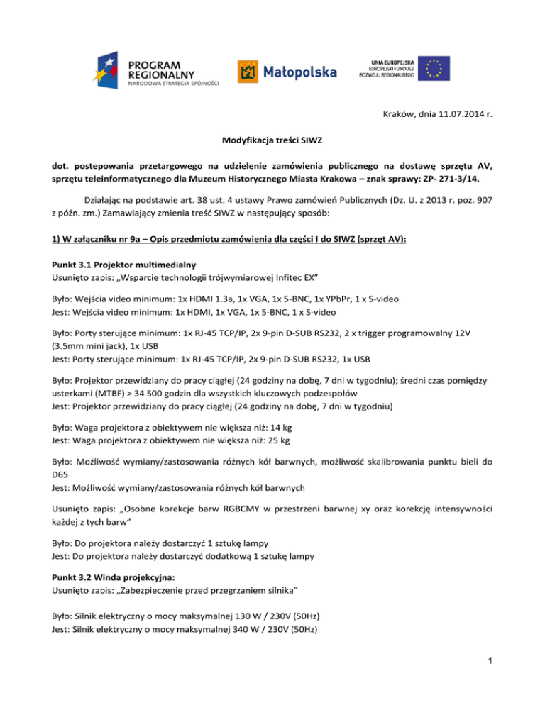 Kraków, dnia 11.07.2014 r. Modyfikacja treści SIWZ dot