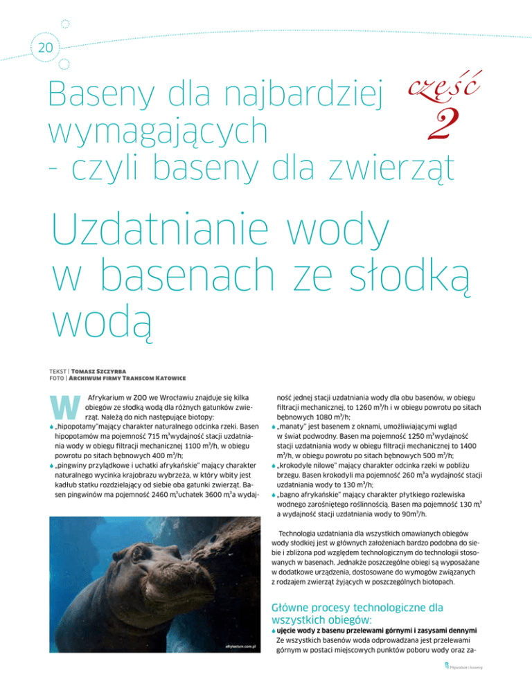 20 Baseny dla najbardziej wymagających - czyli baseny dla zwierząt Uzdatnianie wody w basenach ze słodką wodą TEKST | Tomasz Szczyrba FOTO | Archiwum firmy Transcom Katowice W Afrykarium w ZOO we Wrocławiu znajduje się kilka obiegów ze słodką wodą dla różnych gatunków zwierząt. Należą do nich następujące biotopy: „ hipopotamy”mający charakter naturalnego odcinka rzeki. Basen hipopotamów ma pojemność 715 m³,wydajność stacji uzdatniania wody w obiegu filtracji mechanicznej 1100 m³/h, w obiegu powrotu po sitach bębnowych 400 m³/h; „ pingwiny przylądkowe i uchatki afrykańskie” mający charakter naturalnego wycinka krajobrazu wybrzeża, w który wbity jest kadłub statku rozdzielający od siebie oba gatunki zwierząt. Basen pingwinów ma pojemność 2460 m³,uchatek 3600 m³,a wydaj- ność jednej stacji uzdatniania wody dla obu basenów, w obiegu filtracji mechanicznej, to 1260 m³/h i w obiegu powrotu po sitach bębnowych 1080 m³/h; „manaty” jest basenem z oknami, umożliwiającymi wgląd w świat podwodny. Basen ma pojemność 1250 m³,wydajność stacji uzdatniania wody w obiegu filtracji mechanicznej to 1400 m³/h, w obiegu powrotu po sitach bębnowych 500 m³/h; „krokodyle nilowe” mający charakter odcinka rzeki w pobliżu brzegu. Basen krokodyli ma pojemność 260 m³,a wydajność stacji uzdatniania wody to 130 m³/h; „bagno afrykańskie” mający charakter płytkiego rozlewiska wodnego zarośniętego roślinnością. Basen ma pojemność 130 m³, a wydajność stacji uzdatniania wody to 90m³/h. Technologia uzdatniania dla wszystkich omawianych obiegów wody słodkiej jest w głównych założeniach bardzo podobna do siebie i zbliżona pod względem technologicznym do technologii stosowanych w basenach. Jednakże poszczególne obiegi są wyposażane w dodatkowe urządzenia, dostosowane do wymogów związanych z rodzajem zwierząt żyjących w poszczególnych biotopach. Główne procesy technologiczne dla wszystkich obiegów: ujęcie wody z basenu przelewami górnymi i zasysami dennymi Ze wszystkich basenów woda odprowadzana jest przelewami górnym w postaci miejscowych punktów poboru wody oraz za- 21 sysami dennymi, które mają za zadanie zbieranie zanieczyszczeń i odchodów zwierząt z dna. korekta wartości pH Korekta wartości pH realizowana jest przez pomiar sondą z elektrodą szklaną i następnie przez regulator sterujący pompką dozującą dozowany jest korektor pH. koagulacja Koagulat dozowany jest za pomocą pompek w odpowiedniej proporcji do ilości wody. tak widoczne. Podczas pracy filtrów na samym złożu piaskowym zauważono również szybszy przyrost różnicy ciśnienia na filtrach, spowodowany wytwarzaniem się filmu z zanieczyszczeń na powierzchni piasku oraz zbijaniem samego złoża piasku. Po zasypaniu filtrów hydroantracytem znacznie zmniejszyła się różnica ciśnienia pracy filtrów, co jest związane z budową ziarna hydroantracytu, charakteryzującego się porowatą strukturą oraz szorstką, odporną na ścieranie powierzchnią. Stosując hydroantracyt, uzyskuje się: oprawę warunków filtracji przez wzrost pojemności filtracyjnej p złoża dzięki filtracji wgłębnej yższą i stabilniejszą jakość filtratu i wzrost efektywności w filtracyjnej przez wydłużenie czasu pracy filtrów. oczyszczanie wody na ciśnieniowych filtrach piaskowo-antracytowych Proces filtracji przebiega na ciśnieniowych filtrach żwirowo-piaskowych z warstwą hydroantracytu typu H. Zbiorniki zbudowane są z odpornego na ciśnienietworzywa sztucznego wzmocnionym włóknem szklanym. Zastosowano tutaj zbiorniki o ciśnieniu roboczym 4 bary, wyposażone w armaturę pracującą pneumatycznie. Prędkość filtracji wynosi ok. 30 m/h. Przeprowadzone próby i analizy wskazują jednoznacznie, że filtracja na złożu wielowarstwowym z warstwą hydroantracytu jest bardziej skuteczna od filtracji na samym złożu piaskowym. Kwestionowana w ostatnim czasie zasadność stosowania hydroantracytu w filtrach do filtracji wody w basenach pływackich zdaje się nie potwierdzać. W tym przypadku należałoby przeanalizować każdy etap procesu płukania filtrów oraz samą ich konstrukcję. Jako ciekawostkę należy podać fakt, że w pierwszym etapie rozruchu Afrykarium filtracja wody odbywała się na samym złożu piaskowym. Dopiero po pewnym czasie filtry zostały zasypane hydroantracytem. Dzięki temu rozwiązaniu stwierdzono znaczną poprawę wizualną jakości wody- uzyskano głębszy kolor i przejrzystość wody, co w wypadku basenów, w których obserwuje się podwodne życie, ma kluczowe znaczenie. Poprawę jakości wody szczególnie obserwuje się przy głębokich zbiornikach wody. Stosowanie antracytu w basenach kąpielowych również poprawia wizualną jakość wody, choć ze względu na mniejszą głębokość nie jest to aż W obecnie wykonywanych instalacjach basenowych, gdzie w celu obniżenia kosztów inwestycji nie stosuje się skutecznego pomiaru przepływów wody przez filtr zarówno w trakcie filtracji, jak i płukania oraz stosuje się filtry uniemożliwiające ich płukanie bezciśnieniowe, złoża hydroantracytowe nie dają właściwego efektu filtracji. Niewłaściwe płukanie filtrów oraz sama ich konstrukcja powodują, że hydroantracyt jest albo bardzo szybko wypłukiwany do kanalizacji, albo płukanie jest nieskuteczne, co w końcowym efekcie prowadzi do zanieczyszczenia złóż filtracyjnych i kłopotów sanitarnych w basenie. 22 W Afrykarium zastosowano następujące zbiorniki w poszczególnych biotopach: „ hipopotamy”: filtr o średnicy 2800 mm – 5 szt., reaktor ozonu o średnicy 2800 mm – 4 szt.; „ pingwiny i uchatki”: filtr o średnicy 2800 mm – 7szt., reaktor ozonu o średnicy 2800 mm – 5 szt.; „ manaty”: filtr o średnicy 2800 mm – 7szt., reaktor ozonu o średnicy 2800 mm – 5 szt.; „ krokodyle”: filtr o średnicy 1600 mm – 1szt.; reaktor ozonu o średnicy 2000 mm – 1