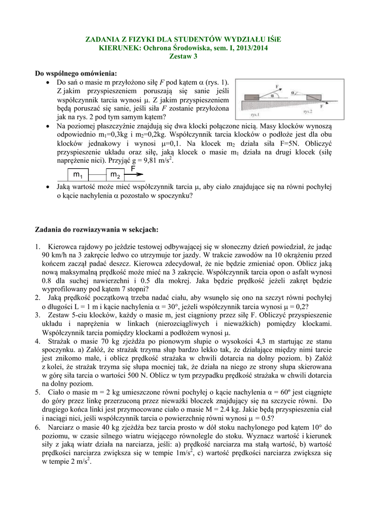 ZADANIA Z FIZYKI DLA STUDENTÓW WYDZIAŁU IŚiE KIERUNEK: Ochrona Środowiska, sem. I, 2013/2014 Zestaw 3 Do wspólnego omówienia: Do sań o masie m przyłożono siłę F pod kątem (rys. 1). Z jakim przyspieszeniem poruszają się sanie jeśli współczynnik tarcia wynosi . Z jakim przyspieszeniem będą poruszać się sanie, jeśli siła F zostanie przyłożona jak na rys. 2 pod tym samym kątem? Na poziomej płaszczyźnie znajdują się dwa klocki połączone nicią. Masy klocków wynoszą odpowiednio m1=0,3kg i m2=0,2kg. Współczynnik tarcia klocków o podłoże jest dla obu klocków jednakowy i wynosi =0,1. Na klocek m2 działa siła F=5N. Obliczyć przyspieszenie układu oraz siłę, jaką klocek o masie m1 działa na drugi klocek (siłę naprężenie nici). Przyjąć g = 9,81 m/s2. F m2 m1 Jaką wartość może mieć współczynnik tarcia , aby ciało znajdujące się na równi pochyłej o kącie nachylenia pozostało w spoczynku? Zadania do rozwiazywania w sekcjach: 1. Kierowca rajdowy po jeździe testowej odbywającej się w słoneczny dzień powiedział, że jadąc 90 km/h na 3 zakręcie ledwo co utrzymuje tor jazdy. W trakcie zawodów na 10 okrążeniu przed końcem zaczął padać deszcz. Kierowca zdecydował, że nie będzie zmieniać opon. Oblicz jaką nową maksymalną prędkość może mieć na 3 zakręcie. Współczynnik tarcia opon o asfalt wynosi 0.8 dla suchej nawierzchni i 0.5 dla mokrej. Jaka będzie prędkość jeżeli zakręt będzie wyprofilowany pod kątem 7 stopni? 2. Jaką prędkość początkową trzeba nadać ciału, aby wsunęło się ono na szczyt równi pochyłej o długości L = 1 m i kącie nachylenia = 30, jeżeli współczynnik tarcia wynosi = 0,2? 3. Zestaw 5-ciu klocków, każdy o masie m, jest ciągniony przez siłę F. Obliczyć przyspieszenie układu i naprężenia w linkach (nierozciągliwych i nieważkich) pomiędzy klockami. Współczynnik tarcia pomiędzy klockami a podłożem wynosi . 4. Strażak o masie 70 kg zjeżdża po pionowym słupie o wysokości 4,3 m startując ze stanu spoczynku. a) Załóż, że strażak trzyma słup bardzo lekko tak, że działające między nimi tarcie jest znikomo małe, i oblicz prędkość strażaka w chwili dotarcia na dolny poziom. b) Załóż z kolei, że strażak trzyma się słupa mocniej tak, że działa na niego ze strony słupa skierowana w górę siła tarcia o wartości 500 N. Oblicz w tym przypadku prędkość strażaka w chwili dotarcia na dolny poziom. 5. Ciało o masie m = 2 kg umieszczone równi pochyłej o kącie nachylenia α = 60º jest ciągnięte do góry przez linkę przerzuconą przez nieważki bloczek znajdujący się na szczycie równi. Do drugiego końca linki jest przymocowane ciało o masie M = 2.4 kg. Jakie będą przyspieszenia ciał i naciągi nici, jeśli współczynnik tarcia o powierzchnię równi wynosi = 0.5? 6. Narciarz o masie 40 kg zjeżdża bez tarcia prosto w dół stoku nachylonego pod kątem 10 do poziomu, w czasie silnego wiatru wiejącego równolegle do stoku. Wyznacz wartość i kierunek siły z jaką wiatr działa na narciarza, jeśli: a) prędkość narciarza ma stałą wartość, b) wartość prędkości narciarza zwiększa się w tempie 1m/s2, c) wartość prędkości narciarza zwiększa się w tempie 2 m/s2. 7. Skrzynka o masie 8 kg zsuwa się z pochylni samochodu dostawczego nachylonej do poziomu pod kątem 30. Uzyskuje przyspieszenie w dół równe 0.3 m/s2. Znajdź siłę tarcia hamującą jego ruch. Ile wynosi współczynnik tarcia w tej sytuacji? 8. Określ promień R mostu mającego kształt łuku okręgu, jeśli wiadomo, że nacisk samochodu jadącego po tym moście z prędkością v = 90 km/h zmniejszy się w najwyższym punkcie mostu o połowę w porównaniu z naciskiem występującym wówczas, gdy samochód tej jedzie po płaskiej odcinku drogi. Przyspieszenie ziemskie g = 9,81 m/s2 . 9. Człowiek jadący na wózku z prędkością v1 dojeżdżając do drugiego wózka rzucił przed siebie worek o masie m. Worek ten upadł na drugi wózek o masie M2 stojący dotychczas nieruchomo, wskutek czego wózek ten zaczął się poruszać. Względna prędkość wózków wynosi u. Obliczyć prędkość wózków v1' i v2' po przerzuceniu worka, jeżeli łączna masa pierwszego wózka wraz z człowiekiem wynosi M1. 10. Częstym elementem kolejki górskiej jest pętla, którą wagonik kolejki przejeżdża „do góry nogami” (tego typu element kolejki nazywany jest przez konstruktorów inwersją). Okazuje się, że możliwe jest, aby taką pętlę wagonik przejechał bez żadnych zabezpieczeń. Sprawdźmy, jaka powinna być najmniejsza wysokość zjeżdżalni dla wózków h, aby mijały bezpiecznie najwyższy punkt pętli (nie odrywały się od toru). Przyjąć, że promień koła „diabelskiej pętli" wynosi R = 7,5 m. Tarcie zaniedbać. Skorzystać z zasady zachowania energii. Policzyć także jaką maksymalną prędkość osiągnie wagonik oraz jakie będzie przeciążenie działające na pasażerów w dolnym punkcie pętli. Porównać uzyskane wyniki z danymi technicznymi dla kolejki górskiej „Tornado” w chorzowskim Wesołym Miasteczku. Tic-Tac Tornado – Dane techniczne (Źródło: Wikipedia) Wysokość 21 m Prędkość maksymalna 60 km/h Przeciążenie maksymalne 4,2 g Czas jazdy 54 s Inwersje 2 x pętla Liczba pociągów 1 Pojemność pociągu 24 osoby 11. Dwa odważniki o masach m1 = 2 kg i m2 = 1 kg są połączone nieważką nicią przerzuconą przez nieruchomy krążek. Obliczyć przyspieszenie a z jakim poruszają się odważniki i naciąg nici N. Tarcie pomijamy. 12. Klocek, który u podstawy równi miał prędkość V = 10 m/s, przebył drogę s = 4,2 m w czasie t = 0,5 s wznosząc się po równi i poruszał się dalej. Równia jest nachylona do poziomu pod kątem = 30. Znaleźć współczynnik tarcia pomiędzy klockiem i równią. Przyjąć przyspieszenie ziemskie g = 10 m/s2 13. Sanki zsuwają się bez tarcia ze szczytu toru o długości l 