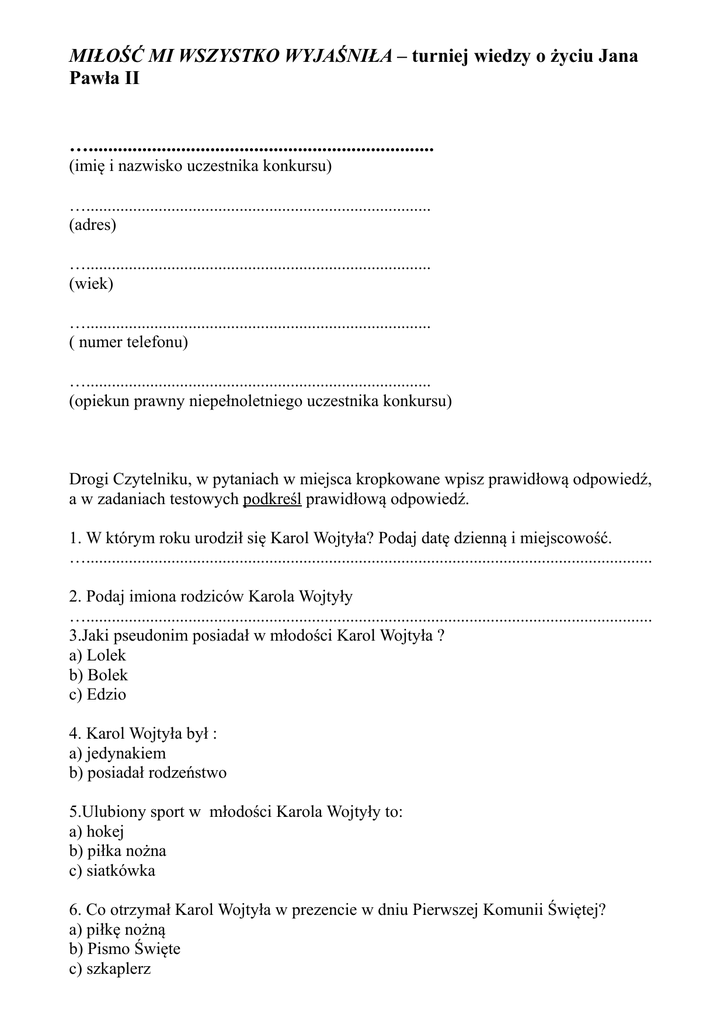 MIŁOŚĆ MI WSZYSTKO WYJAŚNIŁA – turniej wiedzy o życiu Jana Pawła II …....................................................................... (imię i nazwisko uczestnika konkursu) …................................................................................. (adres) …................................................................................. (wiek) …................................................................................. ( numer telefonu) …................................................................................. (opiekun prawny niepełnoletniego uczestnika konkursu) Drogi Czytelniku, w pytaniach w miejsca kropkowane wpisz prawidłową odpowiedź, a w zadaniach testowych podkreśl prawidłową odpowiedź. 1. W którym roku urodził się Karol Wojtyła? Podaj datę dzienną i miejscowość. …..................................................................................................................................... 2. Podaj imiona rodziców Karola Wojtyły …..................................................................................................................................... 3.Jaki pseudonim posiadał w młodości Karol Wojtyła ? a) Lolek b) Bolek c) Edzio 4. Karol Wojtyła był : a) jedynakiem b) posiadał rodzeństwo 5.Ulubiony sport w młodości Karola Wojtyły to: a) hokej b) piłka nożna c) siatkówka 6. Co otrzymał Karol Wojtyła w prezencie w dniu Pierwszej Komunii Świętej? a) piłkę nożną b) Pismo Święte c) szkaplerz 7.Ulubione zajęcie Karola Wojtyły w gimnazjum to: a) jazda na rowerze b) teatr c) wędkarstwo 8. Podaj nazwę ulubionego ciastka Karola Wojtyły po zdaniu matury w maju 1938 r. …..................................................................................................................................... 9. Jak nazywała się uczelnia, w której rozpoczął studia Karol Wojtyła? …..................................................................................................................................... 10. Kto z rodziny Karola Wojtyły zmarł w roku 1941? a) brat b) kuzyn c) ojciec 11. W którym roku Karol Wojtyła przyjął święcenia kapłańskie? …..................................................................................................................................... 12. Podaj dzienną datę wyboru kardynała Karola Wojtyły na papieża ….................................................................................................................................... 13. Co oznacza papieskie zawołanie Jana Pawła II: „Totus Tuus'? …..................................................................................................................................... 14. Ile języków znał polski papież ? a) trzy b) pięć c) dziewięć 15.Jak nazywał się papieski pojazd, który był używany w trakcie podróży apostolskich Jana Pawła II ? …..................................................................................................................................... 16.Jakie kraje nie odwiedził Jan Paweł II podczas swojego pontyfikatu? a) Francja b) Chiny c) Japonia d) Rosja e) Meksyk 17. Podaj nazwę tajemnic Różańca ustanowionych przez Ojca Świętego …..................................................................................................................................... 18.Ulubiona pieśń Jana Pawła II to : a) Czarna Madonna b) Barka c) Góralu czy ci nie żal 19. W którym roku dokonano zamachu na na papieża w Rzymie na Placu Św. Piotra? …..................................................................................................................................... 20.Jak nazywa się papieska formacja wojskowa, pełniąca rolę straży przybocznej papieża? …..................................................................................................................................... 21. Podczas której pielgrzymki do Polski Jan Paweł II wypowiedział znamienne słowa:” Niech zstąpi Duch Twój i odnowi oblicze ziemi. Tej ziemi?” …..................................................................................................................................... 22. Kogo z niżej wymienionych świętych beatyfikował Jan Paweł II? a) św. Małgorzata b) św. siostra Faustyna c) św. Benedykt 23. Czy Jan Paweł II odwiedzał świątynie innych wyznań ? a) tak b) nie 24. Jan Paweł II odbył 109 pielgrzymek. Ze względu na podróże otrzymał przydomek a) Papież - pielgrzym, b) Papież – podróżnik c) Papież – obieżyświat 25. Wymień przynajmniej dwa tytuły książek, które wydał Karol Wojtyła jako papież …..................................................................................................................................... ......................................................................................................................................... 26. Co robił papież po wyjściu z samolotu , gdy odwiedzał jakiś kraj? Był to jego zwyczaj i rytuał. …..................................................................................................................................... 27. Na jaką chorobę cierpiał papież? a) rak krtani b) choroba Parkinsona c) nieżyt oskrzeli 28. Podaj dzienną datę śmierci i godz. o której zmarł Jan Paweł II …..................................................................................................................................... 29. Co oznacza zawołanie : „Santo Subito”? …..................................................................................................................................... 3o. Podaj datę kanonizacji Jana Pawła II ….....................................................................................................................................