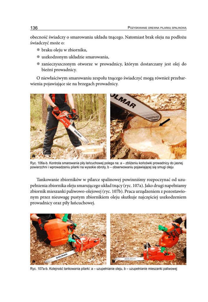 136 POZYSKIWANIE DREWNA PILARKĄ SPALINOWĄ obecność świadczy o smarowaniu układu tnącego. Natomiast brak oleju na podłożu świadczyć może o: braku oleju w zbiorniku, uszkodzonym układzie smarowania, zanieczyszczonym otworze w prowadnicy, którym dostarczany jest olej do bieżni prowadnicy. O niewłaściwym smarowaniu zespołu tnącego świadczyć mogą również przebarwienia pojawiające sie na brzegach prowadnicy. a b Ryc. 106a-b. Kontrola smarowania piły łańcuchowej polega na: a – zbliżeniu końcówki prowadnicy do jasnej powierzchni i wprowadzeniu pilarki na wysokie obroty, b – obserwowaniu pojawiającej się smugi oleju Tankowanie zbiorników w pilarce spalinowej powinniśmy rozpoczynać od uzupełnienia zbiornika oleju smarującego układ tnący (ryc. 107a). Jako drugi napełniamy zbiornik mieszanki paliwowo-olejowej (ryc. 107b). Praca urządzeniem z pozostawionym przez nieuwagę pustym zbiornikiem oleju skutkuje najczęściej uszkodzeniem prowadnicy oraz piły łańcuchowej. a b Ryc. 107a-b. Kolejność tankowania pilarki: a – uzupełnianie oleju, b – uzupełnianie mieszanki paliwowej 137 BUDOWA I OBSŁUGA TECHNICZNA PILARKI SPALINOWEJ 5. Pilarki na wysięgniku Wykaszarki i wycinarki są nazywane pilarkami z urządzeniem tnącym na wysięgniku. Maszyny zaliczane do tej grupy mają charakterystyczną budowę. Składają się z jednostki napędowej, wysięgnika (do 5 m) i układu tnącego (ryc. 108a-b). Do napęb a Ryc. 108a-b. Pilarki na wysięgniku: a – wycinarka Makita BCM4300, b – podkrzesywarka Stihl du tych maszyn stosowane są silniki dwu- lub czterosuwowe, a napęd przekazywany jest za pomocą wału. Elementem roboczym może być piła łańcuchowa, piła tarczowa, głowica żyłkowa lub nożowa (ryc. 109a-d). W zależności od rodzaju elementu roboczego, maszyny te mogą służyć do podkrzesywania, gdy narzędziem roboczym jest piła łańcuchowa, do wykaszania trawy, chwastów i drobnych krzewów, gdy elementem roboczym jest głowica żyłkowa lub nożowa, a także do wycinania młodych drzewek o średnicy w miejscu cięcia nieprzekraczającej 20 cm, gdy elementem roboczym jest piła tarczowa. a b c d Ryc. 109a-d. Typy głowic roboczych pilarek na wysięgniku: a – żyłkowa, b i c – nożowe, d – tarczowa