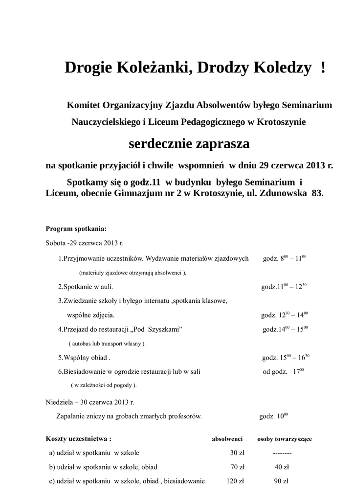 Drogie Koleżanki, Drodzy Koledzy ! Komitet Organizacyjny Zjazdu Absolwentów byłego Seminarium Nauczycielskiego i Liceum Pedagogicznego w Krotoszynie serdecznie zaprasza na spotkanie przyjaciół i chwile wspomnień w dniu 29 czerwca 2013 r. Spotkamy się o godz.11 w budynku byłego Seminarium i Liceum, obecnie Gimnazjum nr 2 w Krotoszynie, ul. Zdunowska 83. Program spotkania: Sobota -29 czerwca 2013 r. 1.Przyjmowanie uczestników. Wydawanie materiałów zjazdowych godz. 800 – 1100 (materiały zjazdowe otrzymują absolwenci ). godz.1100 – 1230 2.Spotkanie w auli. 3.Zwiedzanie szkoły i byłego internatu ,spotkania klasowe, godz. 1230 – 1400 wspólne zdjęcia. godz.1400 – 1500 4.Przejazd do restauracji „Pod Szyszkami” ( autobus lub transport własny ). 5.Wspólny obiad . godz. 1500 – 1630 6.Biesiadowanie w ogrodzie restauracji lub w sali od godz. 1700 ( w zależności od pogody ). Niedziela – 30 czerwca 2013 r. godz. 1000 Zapalanie zniczy na grobach zmarłych profesorów. Koszty uczestnictwa : absolwenci osoby towarzyszące a) udział w spotkaniu w szkole 30 zł -------- b) udział w spotkaniu w szkole, obiad 70 zł 40 zł 120 zł 90 zł c) udział w spotkaniu w szkole, obiad , biesiadowanie Noclegi Komitet Organizacyjny nie pośredniczy w załatwianiu noclegów. Rezerwacji miejsca noclegowego należy dokonać osobiście. Wykaz miejsc noclegowych: 1.Schronisko Młodzieżowe przy Zespole Szkół Ponadgimnazjalnych Nr 1 w Krotoszynie, ul. Mickiewicza 11, tel.(62) 725-32-75 - szkoła, 694-278-537 - schronisko, 2.Hotel „Krotosz”, Krotoszyn, ul. Mickiewicza 44, tel. 62 – 725 43 06 3.Hotel „Pod Szyszkami”, Krotoszyn, ul.Zdunowska 160, tel.62 – 722 70 00 4.Hotel „Wawrzyniak”, Perzyce k/Krotoszyna, tel.62 – 721 43 00 5.Hotel „Wodnik”, Krotoszyn,ul. Mahle 4, tel.62 – 722 00 10 Termin nadsyłania zgłoszeń udziału w Zjeździe – do 30 kwietnia 2013 r. Zgłoszenia można również przesłać drogą e – mailową na adres: [email protected] lub [email protected] Informacji o Zjeździe telefonicznie udzielają: Wiesław Skotarek 698 633 069 lub 604 497 374, Urszula Włodarczyk 668 093 363 lub 62 722 81 51 Termin dokonywania wpłaty na konto kosztów uczestnictwa - do 15 maja 2013 r. : Zdzisław Czwojdziński, Jerzy Mizgalski 34 1090 1157 0000 0001 0899 5272 Ostatecznym potwierdzeniem udziału w Zjeździe jest wpłata. Jeśli Twoja Koleżanka/Kolega nie otrzymał zawiadomienia o Zjeździe, to przekaż im informację. Przewodniczący Komitetu Organizacyjnego Zjazdu Wiesław Skotarek Krotoszyn, marzec 2013 r. ZGŁOSZENIE UDZIAŁU w spotkaniu Absolwentów byłego Seminarium Nauczycielskiego i Liceum Pedagogicznego w Krotoszynie. Termin zwrotu zgłoszenia do 30 .04.2013 r. na adres: Urszula Włodarczyk ul.Stawna 85 63-700 Krotoszyn 1.Nazwisko i imię ………………………………………………………….. 2.Nazwisko rodowe ………………………………………………………. 3.Rok matury …………………………………………………………… 4. Zgłaszam : A. udział w Zjeździe ( właściwe podkreśl ) a) w spotkaniu w szkole, b) w spotkaniu w szkole , obiad, c) w spotkaniu w szkole,obiad,biesiadowanie. B. udział osoby towarzyszącej ( właściwe podkreśl ) a) w spotkaniu w szkole, b) w spotkaniu w szkole, obiad, c) w spotkaniu w szkole,obiad,biesiadowanie. ………………………. data ………………………… podpis uczestnika