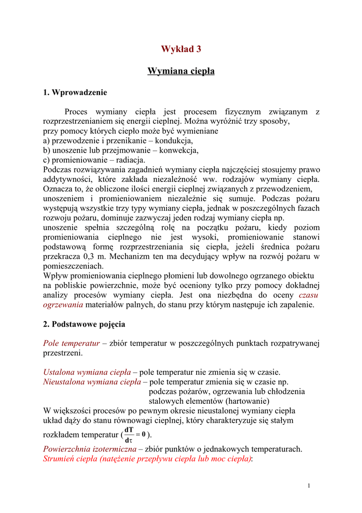 Wykład 3 Wymiana ciepła 1. Wprowadzenie Proces wymiany ciepła jest procesem fizycznym związanym z rozprzestrzenianiem się energii cieplnej. Można wyróżnić trzy sposoby, przy pomocy których ciepło może być wymieniane a) przewodzenie i przenikanie – kondukcja, b) unoszenie lub przejmowanie – konwekcja, c) promieniowanie – radiacja. Podczas rozwiązywania zagadnień wymiany ciepła najczęściej stosujemy prawo addytywności, które zakłada niezależność ww. rodzajów wymiany ciepła. Oznacza to, że obliczone ilości energii cieplnej związanych z przewodzeniem, unoszeniem i promieniowaniem niezależnie się sumuje. Podczas pożaru występują wszystkie trzy typy wymiany ciepła, jednak w poszczególnych fazach rozwoju pożaru, dominuje zazwyczaj jeden rodzaj wymiany ciepła np. unoszenie spełnia szczególną rolę na początku pożaru, kiedy poziom promieniowania cieplnego nie jest wysoki, promieniowanie stanowi podstawową formę rozprzestrzeniania się ciepła, jeżeli średnica pożaru przekracza 0,3 m. Mechanizm ten ma decydujący wpływ na rozwój pożaru w pomieszczeniach. Wpływ promieniowania cieplnego płomieni lub dowolnego ogrzanego obiektu na pobliskie powierzchnie, może być oceniony tylko przy pomocy dokładnej analizy procesów wymiany ciepła. Jest ona niezbędna do oceny czasu ogrzewania materiałów palnych, do stanu przy którym następuje ich zapalenie. 2. Podstawowe pojęcia Pole temperatur – zbiór temperatur w poszczególnych punktach rozpatrywanej przestrzeni. Ustalona wymiana ciepła – pole temperatur nie zmienia się w czasie. Nieustalona wymiana ciepła – pole temperatur zmienia się w czasie np. podczas pożarów, ogrzewania lub chłodzenia stalowych elementów (hartowanie) W większości procesów po pewnym okresie nieustalonej wymiany ciepła układ dąży do stanu równowagi cieplnej, który charakteryzuje się stałym rozkładem temperatur ( dT 0 ). d Powierzchnia izotermiczna – zbiór punktów o jednakowych temperaturach. Strumień ciepła (natężenie przepływu ciepła lub moc ciepła): 1 Q dQ d [J/s] Q [J/s] (2) [W/m2] (3) (1) Strumień ciepła dla przypadku ustalonego (stosunek ciepła Q do czasu trwania wymiany tej ilości ciepła): Q Gęstość strumienia ciepła: q d 2Q dA d Gęstość strumienia ciepła dla przypadku ustalonego (stosunek strumienia ciepła Q do pola A powierzchni izotermicznej, przez którą przepływa ten strumień): a) powierzchniowa Q Q qA q A A b) objętościowa Q qV V c) liniowa Q qL L [W/m2] (4) [W/m3] (5) [W/m] (6) Gęstość strumienia ciepła jest wektorem skierowanym prostopadle do powierzchni izotermicznej w kierunku spadku temperatury. 3. Wprowadzenie do przewodnictwa ciepła Rozprzestrzenianie się energii cieplnej wewnątrz ciała na drodze wymiany energii cieplnej bezpośrednio pomiędzy sąsiednimi cząstkami oraz dyfuzji drobin, atomów i swobodnych elektronów. Wszystkie rozważania dotyczące przewodnictwa cieplnego są przeprowadzane przy następujących założeniach: 1. Charakterystyki wszystkich procesów w danej objętości ciała są funkcjami ciągłymi, również w czasie. 2. Straty energii na deformację termiczną w ciele są bardzo małe w porównaniu ze zmianą energii wewnętrznej, tzn. proces zachodzi przy V=const. 3. Nie występuje w ciele konwekcja i promieniowanie cieplne. Doświadczenia wykazują, że przy pomocy pierwszej i drugiej zasady termodynamiki trudno jest matematycznie opisać procesy przewodnictwa. W tym celu korzystamy z prawa podanego po raz pierwszy przez Bio i Fouriera, które brzmi następująco: „Wektor gęstości strumienia ciepła w przewodnictwie danego punktu ciała równomiernie nagrzanego, w danym momencie czasu – jest wprost proporcjonalny do wektora gradientu temperatury” 2 W postaci matematycznej prawo to można zapisać w następującej postaci: q - grad T [W/m2] (5) T T T i j k gdzie: grad T x y z Współczynnik proporcjonalności w W/mK zwany współczynnikiem przewodnictwa zależy od temperatury i jest podawany w literaturze dla określonego zakresu temperatur względnie ściśle określonej temperatury. Wartość współczynnika przewodnictwa waha się w granicach: - dla gazów od 510-3 do 0,5 W/mK i wzrasta z temperaturą (od ciśnienia praktycznie nie zależy w zakresie 0,3 do 2000 bar), - dla cieczy od 810-3 do 0,6 W/mK i z reguły zmniejsza się ze wzrostem temperatury (nie zależy od ciśnienia), - dla metali od 7 do 360 W/mK i powoli zmniejsza się ze wzrostem temperatury Zwykle przyjmuje się liniową zależność współczynnika przewodnictwa cieplnego od temperatury w postaci: = a + b T, gdzie a i b – stałe właściwe dla danego materiału. W niskich temperaturach należy w tej zależności uwzględnić człon nieliniowy, dodając wyrażenie c T2. W tablicach są podawane wartości współczynnika dla różnych materiałów i mediów. Występujące różnice wartości wynikają często z trudnych do określenia własności materiałów szczególnie budowlanych. Nawilżenie, róznice w składzie chemicznym, czy gęstości, zmieniają zasadniczo przewodność cieplną materiału i dlatego w przypadku braku danych zaleca się wyznaczać wartość przy pomocy pomiarów. Równanie Bio-Fouriera nie uwzględnia skończonej prędkości przewodzenia ciepła tzn. prędkości rozprzestrzeniania się ciepła w ciele, którą przyjęto za nieskończoną. W przypadku analizowania procesów krótkotrwałych, należy uwzględnić skończoną szybkość przewodzenia ciepła przez dodanie jednego członu w równaniu Bio-Fouriera tzn. q q - grad T - r (6) gdzie: r – czas relaksacji (opóźnienia) 3 4. Ustalone przewodzenie i przenikanie ciepła przez ściankę płaską W celu rozważenia przypadku ustalonego przenikania ciepła przez ściankę płaską przyjęto następujące założenia: 1. Ściana płaska posiada grubość znacznie mniejszą od wymiarów pola jej powierzchni A. 2. Ściana jest wykonana z materiału o współczynni