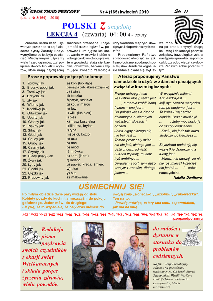 Str. 11 Nr 4 (165) kwiecień 2010 (c.d. z Nr 3(164) – 2010) POLSKI z anegdotą LEKCJA 4 (czwarta) 04: 00 4 - cztery Zna czna liczba zd ań u żywanych przez nas to są świado me cyta ty. Zos ta ły ki ed yś wymyślone po to, by je powtarzać. Między innymi używamy wielu frazeologizmów, czyli połączeń dwóch lub kilku wyrazó w, któ re maj ą naj czę ści ej znaczenie prze nośne. Znajojo mość frazeo logi zmó w, poprawn e i umi eję tne ich stoso wa ni e w m ow ie i pi śm ie wzbogaca słownictwo, sprawia, że w ypowied zi sta ją się bardziej obrazowe, barwne i zajmujące. Ponadto frazeo logia Proszę poprawnie połączyć kolumny: 1. Zdrowy jak 2. Biedny, ubogi jak 3. Trzeźwy jak 4. Brzydki jak 5. Zły jak 6. Wierny jak 7. Kochliwy jak 8. Odważny jak 9. Uparty jak 10. Głodny jak 11. Piękny jak 12. Silny jak 13. Głupi jak 14. Chudy jak 15. Gruby jak 16. Czarny jak 17. Czysty jak 18. Blady (biały) jak 19. Żywy jak 20. Łysy jak 21. Słodki jak 22. Ciężki jak 23. Pracowity jak a) koń (lub dąb) b) małpa (lub jak nieszczęście) c) świnia d) beczka f) patyk, szkielet g) kot w marcu h) lew i) wilk (lub pies) j) pies k) mysz kościelna l) lilia, łza, brylant ł) ryba m) osioł, kozioł n) osa o) noc p) miód r) mrówka s) skra (iskra) t) kolano u) papier, kreda, śmierć w) słoń y) but z) malowanie uczy tworzenia mądrych, dowcipnych i niepowtarzalnych metafor. Prop o n uj e m y Pa ń stw u sp rób owa ć u tworzyć zw iązki frazeologiczne z podanych poniżej słów. Jeżeli dla kogoś takie zadanie okaże się zbyt łat- we, można po pros tu p rzykryć dru gą kolumnę i dokończyć początki związków fraze ologicznych, a następnie sprawdzić za pomocą klucza odpowiedzi, czy dobrze Państwo sobie poradzili z tym. A teraz proponujemy Państwu samodzielnie użyć w zdaniach pasujących związków frazeologicznych: Fryzjer ostrzygł tacie wszystk ie włosy, teraz jest ... , a mamie zrobił ładną fryzurę – ona jest ... Do pok oju weszła drobna dziewczyna o ciemnych, wełnistych włosach i oczach ... Jarek nigdy niczego się nie boi, jest ... Tomek przez cały dzień nic nie jadł, dlatego jest ... Jeśli chcesz odnieść suk ces w pracy, musisz być ambitny i ... Uprawiam sport, jem dużo warzyw i owoców, dlatego jestem... W przyjaźni i miłości Agnieszk a jest ... Mój syn zawsze wszystk o robi po swojemu, jest ... Te k siążk i są bardzo ciężk ie. Uczeń musi być ... , żeby móc nosić je do szk oły codziennie. - Kasiu, nie jedz tak dużo słodyczy, bo będziesz ... ! Zbyszk owi podobają się wszystk ie dziewczyny z k lasy, jest ... - Mark u, nie udawaj, że nic nie rozumiesz! Przecież nie jesteś ... ! – mówi nauczycielka. Natalia Daniłowa UŚMIECHNIJ SIĘ! Po miłym obiedzie dwie pary wstają od stołu. Kobiety poszły do kuchni, a mężczyźni do pokoju gościnnego. Jeden mówi do drugiego: - Myślę, że to wspaniale, że cały czas mówisz do swojej żony „słoneczko”, „dzióbku”, „cukiereczku”. Ten na to: - Prawdę mówiąc, cztery lata temu zapomniałem, jak ma na imię. Klucz odpowiedzi: 1-ł, 2-k, 3-c, 4-b, 5-n, 6-j, 7-g, 8-h, 9-m, 10-i, 11-r, 12-a, 13-y, 14-f, 15-d, 16-o, 17-l, 18-u, 19-s, 20-t, 21-p, 22-w, 23-r. Redakcja pisma pozdrawia swoich czytelników z okazji świąt Wielkanocnych i składa gorące życzenia zdrowia, wielu powodów do radości i dystansu w stosunku do problemów codziennych. Na foto: Zespół redakcyjny «Głosu» na posiedzeniu wielkanocnym. Od lewej: Marek Szczepaniak, Wasilij Wasiliew, Dmitrij Osipow, Aleksandra Ławrynowicz, Maria Ławrynowicz