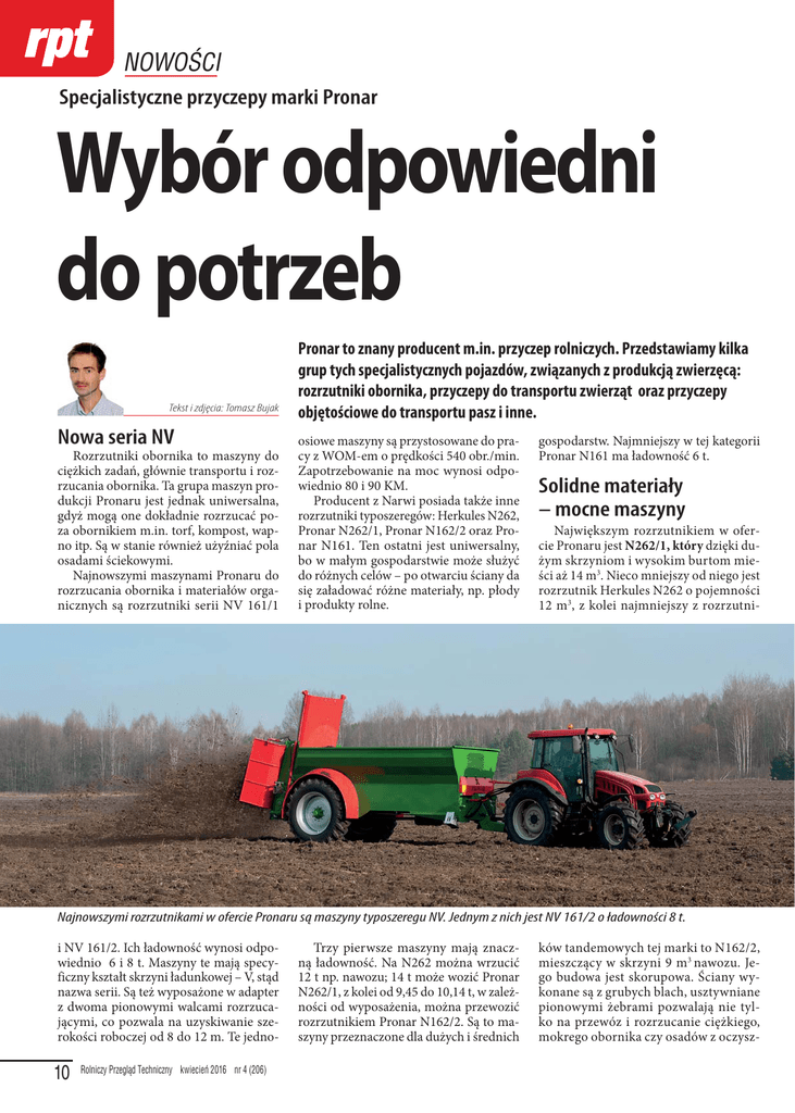 NOWOŚCI Specjalistyczne przyczepy marki Pronar Wybór odpowiedni do potrzeb Tekst i zdjęcia: Tomasz Bujak Nowa seria NV Rozrzutniki obornika to maszyny do ciężkich zadań, głównie transportu i rozrzucania obornika. Ta grupa maszyn produkcji Pronaru jest jednak uniwersalna, gdyż mogą one dokładnie rozrzucać poza obornikiem m.in. torf, kompost, wapno itp. Są w stanie również użyźniać pola osadami ściekowymi. Najnowszymi maszynami Pronaru do rozrzucania obornika i materiałów organicznych są rozrzutniki serii NV 161/1 Pronar to znany producent m.in. przyczep rolniczych. Przedstawiamy kilka grup tych specjalistycznych pojazdów, związanych z produkcją zwierzęcą: rozrzutniki obornika, przyczepy do transportu zwierząt oraz przyczepy objętościowe do transportu pasz i inne. osiowe maszyny są przystosowane do pracy z WOM-em o prędkości 540 obr./min. Zapotrzebowanie na moc wynosi odpowiednio 80 i 90 KM. Producent z Narwi posiada także inne rozrzutniki typoszeregów: Herkules N262, Pronar N262/1, Pronar N162/2 oraz Pronar N161. Ten ostatni jest uniwersalny, bo w małym gospodarstwie może służyć do różnych celów – po otwarciu ściany da się załadować różne materiały, np. płody i produkty rolne. gospodarstw. Najmniejszy w tej kategorii Pronar N161 ma ładowność 6 t. Solidne materiały – mocne maszyny Największym rozrzutnikiem w ofercie Pronaru jest N262/1, który dzięki dużym skrzyniom i wysokim burtom mieści aż 14 m3. Nieco mniejszy od niego jest rozrzutnik Herkules N262 o pojemności 12 m3, z kolei najmniejszy z rozrzutni- Najnowszymi rozrzutnikami w ofercie Pronaru są maszyny typoszeregu NV. Jednym z nich jest NV 161/2 o ładowności 8 t. i NV 161/2. Ich ładowność wynosi odpowiednio 6 i 8 t. Maszyny te mają specyficzny kształt skrzyni ładunkowej – V, stąd nazwa serii. Są też wyposażone w adapter z dwoma pionowymi walcami rozrzucającymi, co pozwala na uzyskiwanie szerokości roboczej od 8 do 12 m. Te jedno- 10 Rolniczy Przegl¹d Techniczny kwiecień 2016 nr 4 (206) Trzy pierwsze maszyny mają znaczną ładowność. Na N262 można wrzucić 12 t np. nawozu; 14 t może wozić Pronar N262/1, z kolei od 9,45 do 10,14 t, w zależności od wyposażenia, można przewozić rozrzutnikiem Pronar N162/2. Są to maszyny przeznaczone dla dużych i średnich ków tandemowych tej marki to N162/2, mieszczący w skrzyni 9 m3 nawozu. Jego budowa jest skorupowa. Ściany wykonane są z grubych blach, usztywniane pionowymi żebrami pozwalają nie tylko na przewóz i rozrzucanie ciężkiego, mokrego obornika czy osadów z oczysz- czalni, ale również suchszych kompostów czy słomiastych oborników, które choć lekkie, to zajmują sporą przestrzeń. W podłodze producent zastosował blachę o grubości 4 mm (3 mm w przypadku N162/2), z kolei ściany skrzyni zostały pospawane z materiałów o grubości 3 mm. Materiał w tych maszynach przesuwa się ku adapterowi dzięki przenośnikowi podłogowemu o wzmocnionej konstrukcji. Zbudowany jest on z dwóch łańcuchów o grubych, 14-milimetrowych ogniwach połączonych z wyprofilowanymi listwami. Adapter szeroko rozrzucający od 12 do 25 m W tylnej części skrzyni ładunkowej rozrzutników Pronar N262/1 i Pronar N262 został zainstalowany adapter szeroko rozrzucający o symbolu AH 20, z poziomymi walcami dozująco-rozdrabniającymi i dwiema tarczami do szerokiego rozrzutu. Aby zachować trwałość mechanizmów napędowych, jest on oddzielony sterowaną hydraulicznie przegrodą od gromadzonego na skrzyni materiału. Takie rozwiązanie nie tylko pozwala na delikatny start walców i tarcz rozrzucających, ale rów- Herkules to rozrzutnik z poziomymi walcami rozdrabniająco-dozującymi. Szeroki rozrzut maszyna zawdzięcza dwóm dużym tarczom. nież umożliwia dozowanie. System rozrzutu pozwala na realizację nawożenia na szerokości od 12 do 25 m, zarówno obornika, jak i innych nawozów organicznych. Zespół walcowo-tarczowy w tyle maszyn jest przykrywany tylną klapą sterowaną hydraulicznie. Napęd adaptera realizowany jest z wału WOM, poprzez przekładnię. Rozrzutniki PRONAR z serii NV161 Maszyny Pronar N262/1, N262 i N262/2 są przystosowane do pracy z przekaźnikiem o prędkości 1000 obr./min. Rozrzutniki pozwalają na dokładne ustawienie dawki nawozu na 1 ha, dzięki napędowi hydraulicznemu przenośnika podłogowego o regulowanym bezstopniowo posuwie. Dla ułatwienia regulator natężenia przepływu ma 10-stopniową skalę, 2 pkt - zasuwa NV161/1 (6 ton) 60 900 zł NV161/2 (8 ton) 68 100 * Podane ceny są cenami netto wersji standard zł 2 pkt - deflektory (klapy, osłony) 6 pkt - adapter pionowy walcowy POZYSKAJ FUNDUSZE UNIJNE - MODERNIZACJA GOSPODARSTW ROLNYCH 2016 Rolniczy Przegl¹d Techniczny kwiecień 2016 nr 4 (206) 11 SKONTAKTUJ SIĘ Z DEALEREM PRONAR: [email protected] • www.pronar.pl NOWOŚCI co umożliwia porównanie i zapamiętanie ustawień oraz dokładną regulację dawki nawozu, także w innym terminie. Adaptery z pionowymi walcami Od 6 do 12 m Pośród rozrzutników Pronaru znajduje się także model o średniej ładowności, wyposażony w adapter pionowy. Jest to maszyna o symbolu N162/2. Rozrzutnik ten w odróżnieniu od pozostałych ma możliwość zamontowania adaptera cztero- lub dwuwalcowego (AV 40 lub AV 20). W standardzie producent montuje podzespół czterowalcowy. W zależności od wyposażenia zmienia się ładowność tego rozrzutnika. Trzy największe rozrzutniki podlaskiego producenta wykonane są z zawieszeniem tandem na mocnych sztywnych osiach osadzonych na resorach parabolicznych. Są wyposażone w zróżnicowane ogumienie. Rozrzutnik 14-tonowy pracuje na oponach 600/50-22,5, 12-tonowy – na gumach 550/60-22,5 a N162/2 ma opony 500/50-17. W ofercie fabryki z Narwi znajduje się także mały rozrzutnik – N161. Ta jednoosiowa maszyna o ładowności 6 t powstała z myślą o potrzebach mniejszych gospodarstw i jest wyposażona w adapter rozrzucający z dwom