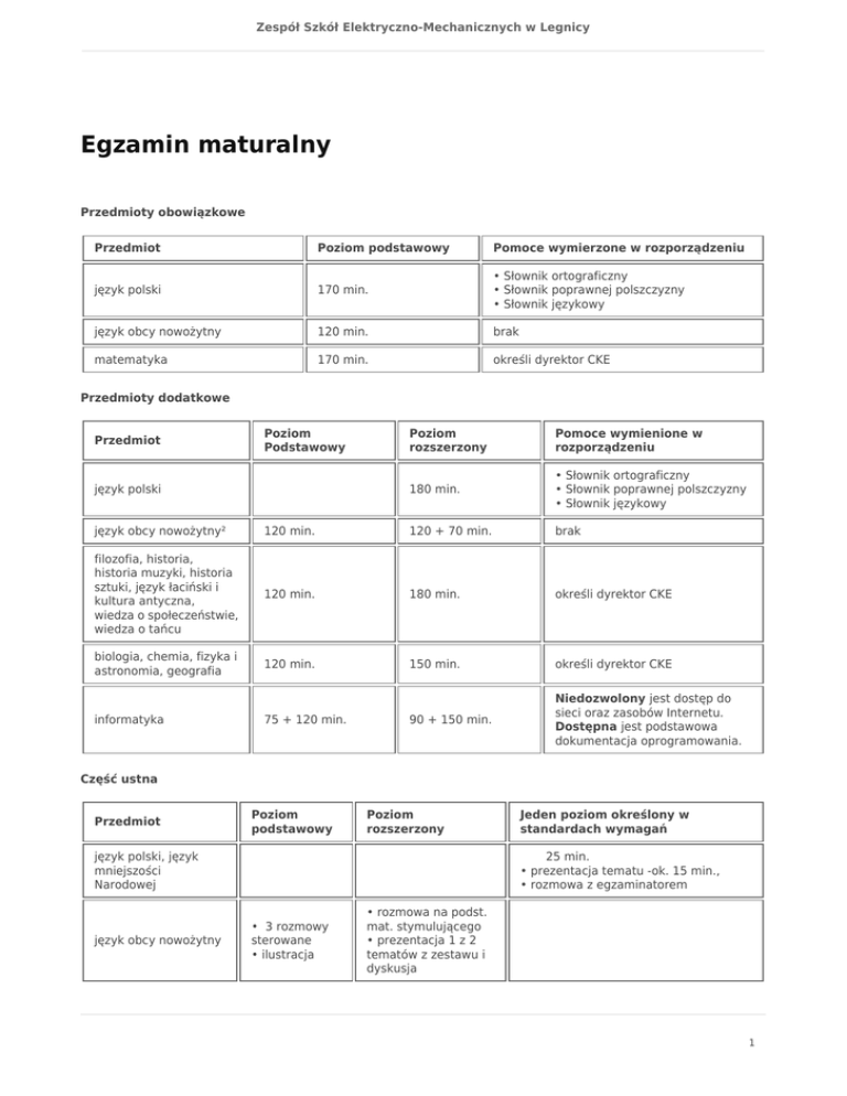 Zespół Szkół Elektryczno-Mechanicznych w Legnicy Egzamin maturalny Przedmioty obowiązkowe Przedmiot Poziom podstawowy Pomoce wymierzone w rozporządzeniu język polski 170 min. • Słownik ortograficzny • Słownik poprawnej polszczyzny • Słownik językowy język obcy nowożytny 120 min. brak matematyka 170 min. określi dyrektor CKE Przedmioty dodatkowe Przedmiot Poziom Podstawowy język polski Poziom rozszerzony Pomoce wymienione w rozporządzeniu 180 min. • Słownik ortograficzny • Słownik poprawnej polszczyzny • Słownik językowy język obcy nowożytny² 120 min. 120 + 70 min. brak filozofia, historia, historia muzyki, historia sztuki, język łaciński i kultura antyczna, wiedza o społeczeństwie, wiedza o tańcu 120 min. 180 min. określi dyrektor CKE biologia, chemia, fizyka i astronomia, geografia 120 min. 150 min. określi dyrektor CKE 90 + 150 min. Niedozwolony jest dostęp do sieci oraz zasobów Internetu. Dostępna jest podstawowa dokumentacja oprogramowania. informatyka 75 + 120 min. Część ustna Przedmiot Poziom podstawowy Poziom rozszerzony język polski, język mniejszości Narodowej język obcy nowożytny Jeden poziom określony w standardach wymagań 25 min. • prezentacja tematu -ok. 15 min., • rozmowa z egzaminatorem • 3 rozmowy sterowane • ilustracja • rozmowa na podst. mat. stymulującego • prezentacja 1 z 2 tematów z zestawu i dyskusja 1 Zespół Szkół Elektryczno-Mechanicznych w Legnicy ● ● Języki do wyboru: angielski, niemiecki, francuski, rosyjski, włoski, hiszpański. Jeśli zdający wybierze jako przedmiot dodatkowy ten sam język obcy, który zdawał w części obowiązkowej, musi zadeklarować poziom rozszerzony. Harmonogram ustnych egzaminów maturalnych z języka polskiego w maju 2016 r. DATA KLASA SALA 10 maja 4i (12 osób) 116 11 maja 4i (13 osób) 116 18 maja 4k+ abs. (18 osób) 117 19 maja 4h (7 osób) 117 19 maja 4r (13 osób) 116 19 maja 4k (12 osób) 117 20 maja 4r (13 osób) 116 20 maja 4h (15 osób) 117 2