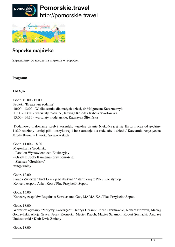 Pomorskie.travel http://pomorskie.travel Sopocka majówka Zapraszamy do spędzenia majówki w Sopocie. Program: 1 MAJA Godz. 10.00 - 15.00 Projekt "Kreatywna rodzina" 10:00 - 13:00 - Wielka sztuka dla małych dzieci, dr Małgorzata Karczmarzyk 11:00 - 13:00 - warsztaty teatralne, Jadwiga Kościk i Izabela Sokołowska 13:00 - 14:30 - warsztaty modelarskie, Katarzyna Śliwińska Dodatkowo malowanie toreb i koszulek, wspólne pisanie Niekończącej się Historii oraz od godziny 11:30 rodzinny turniej piłki koszykowej i inne atrakcje dla rodziców i dzieci / Kawiarnia Artystyczna Młody Byron w Dworku Sierakowskich Godz. 11.00 – 18.00 Majówka na Grodzisku: - Pawilon Wystawienniczo-Edukacyjny - Osada z Epoki Kamienia (przy pomoście) - Skansen "Grodzisko" wstęp wolny Godz. 12.00 Parada Zwierząt "Król Lew i jego drużyna" / startujemy z Placu Konstytucji Koncert zespołu Asia i Koty / Plac Przyjaciół Sopotu Godz. 15.00 Koncerty zespołów Rogulus x Szwelas und Gos, MARIA KA / Plac Przyjaciół Sopotu Godz. 18.00 Wernisaż wystawy "Motywy Zwierzęce": Henryk Cześnik, Józef Czerniawski, Robert Florczak, Maciej Gorczyński, Alicja Gruca, Jacek Kornacki, Maciej Rauch, Maciej Salamon, Robert Sochacki, Andrzej Umiastowski / Klub Dwie Zmiany Godz. 18.00 1/4 Pomorskie.travel http://pomorskie.travel Rewia "Jutro będzie lepiej" - spektakl muzyczny z piosenkami z lat 20-tych i 30-tych. Reżyseria Piotr Kosewski / Teatr na Plaży 2 MAJA Godz. 9.00 -16.00 Targ Śniadaniowy / Plac Przyjaciół Sopotu Godz. 9.00 - 19.00 Projekt "Zdrowy styl życia, sposobem na szczęście"/ Plac Zdrojowy Godz. 10.00 -15.00 Projekt "Kreatywna rodzina" 11:00 - 13:00 - warsztaty malarskie, Marek Wróbel 12:00 - Zabawa z nauką i mediami, prof. UG dr hab. Grażyna Penkowska, dr Monika Woźniak 13:00 - 15:00 warsztaty muzyczno - ruchowe, Monika Kowalska, Karolina Malinowska, Gabriela Podsobińska Dodatkowo malowanie toreb i koszulek, wspólne pisanie Niekończącej się Historii i inne atrakcje dla rodziców i dzieci / Kawiarnia Artystyczna Młody Byron w Dworku Sierakowskich Godz. 10.00 - 20.00 Dzień z Radiową Trójką 10.00 -12.00 – Audycja Marka Niedźwieckiego "Markomania" oraz otwarcie wystawy "Trójka w obrazach wielkich mistrzów" Sklepik "Walendzik" / Państwowa Galeria Sztuki 15.00 – 16.00 - Spotkanie z Katarzyną Figurą, prowadzi Barbara Marcinik po spotkaniu oficjalne otwarcie sezonu na Kulturalnej Plaży Trójki – wejście na żywo do audycji "Myśliwiecka 3/5/7" / Klub Atelier 16.00 – 18.00 – Audycja Piotra Stelmacha „Myśliwiecka 3/5/7” / Klub Atelier 16.00 – 19.30 – Sklepik "Walendzik" / Kulturalna Plaża Trójki 19.30 – koncert zespołu Trupa Trupa / Kulturalna Plaża Trójki Godz. 11.00 Turniej siatkówki plażowej - rozpoczęcie sezonu siatkarskiego na sopockiej plaży, kat. open (zapisy od godz. 9.00-11.00) / Plaża, wejście nr 23) Godz. 11.00 Turniej piłki nożnej dla szkół podstawowych i gimnazjalnych (zapisy w godz. 9.00-11.00) / Sopockie Błonia Godz. 11.00 - 15.00 Majówka – Tańcówka, festyn / Brodwino Godz. 12.00 "Pchła Szachrajka w Sopocie", kabaretowo-edukacyjne przedstawienie teatralne na podstawie utworu Jana Brzechwy. Scenariusz i reżyseria: Adam Dzieciniak Obsada: Aktorzy Teatru Czwarte Miasto / Teatr na Plaży 2/4 Pomorskie.travel http://pomorskie.travel Godz. 11.00 - 18.00 Wspólne piknikowanie na Sopockich Błoniach Stowarzyszenie "Zdrowi i aktywni" zaprasza na wspólne zajęcia rekreacyjne: 11.00 – 12.00 Fitness, poprowadzi Małgorzata Grzywacz 12.00 – 13.00 Tai Chi, prowadzi Mariusz Jasiński 13.00 – 14.30 Zumba, prowadzi Ania Cegłowska W tym samym czasie ćwiczący rodzice mogą pozostawić swoje dzieci pod opieką studentów AWF, którzy będą prowadzić zabawy i gry sportowe. 15.00 -18.00 koncerty zespołów Band_A i SopotAllStars Godz. 14.00 - 18.00 - Warsztaty z budowania latawców - Konkurs na budowę Zamków z Piasku - Turniej Gier rodzinnych: Badminton, Gra w Kapsle, Gry planszowe, Gra w gumę, Gra w klasy, Siatkówka/ Plaża – Zatoka Sztuki Godz. 18.00 Spektakl muzyczny "Babskie Lato"; autor, reżyseria, opracowanie muzyczne, wykonanie - Les Femmes w składzie: Joanna Sobowiec - Jamioł – sopran, Natalia Krajewska- Kitowska – sopran, Emilia Osowska – mezzosopran, Katarzyna Hobgarska - Buja – fortepian / Teatr na Plaży 3 MAJA Godz. 10.00 - 15.00 Projekt "Kreatywna rodzina" 11:00 - 12:00 - Improbaja, Improwizowana bajka dla dzieci i dorosłych 12:00 - 14:00 - warsztaty muzyczno - ruchowe, Jadwiga Możdżer 13:00 - warsztaty archeologiczne, Zbigniew Okuniewski Dodatkowo malowanie toreb i koszulek, wspólne pisanie Niekończącej się Historii i inne atrakcje dla rodziców i dzieci / Kawiarnia Artystyczna Młody Byron w Dworku Sierakowskich Godz. 10.00 - 17.00 Piknik Militarny / Plac Przyjaciół Sopotu Godz. 10.30 Wniebowzięty Sopot. Filmowy spacer po Sopocie. Start spod Szafy Polańskiego przy Zatoce Sztuki Godz. 11.00 - 13.00 "Sopocki Montparnasse" – wędrówka szlakiem kultury i sztuki / wymarsz z Placu Konstytucji 11:00 - zbiórka pod kościołem św. Jerzego 11:15 - 12:15 - przemarsz do ul. Obrońców Westerplatte (historie niektórych kamienic, występ Samba Rhythms of Resistance Trójmiasto oraz Gra Miejska) 12:15 -16:00 Dom pod Wieżą, ul. Goyki 3 (konkurs malarski dla dzieci, gry podwórkowe, wspólne śpiewanie pieśni patriotycznych, pieczenie 3/4 Pomorskie.travel http://pomorskie.travel kiełbasek połączone z opowieściami o dawnym Sopocie) Godz. 12.00 "Pchła Szachrajka w Sopocie", kabaretowo-edukacyjne przedstawienie teatralne dla na podstawie utworu Jana Brzechwy. Scenariusz i reżyseria: Adam Dzieciniak. Obsada: Aktorzy Teatru Czwarte Miasto / Teatr na Plaży Godz. 18.00 Koncert Ireny Melcer "Nie hajtam się" / Kulturalna Plaża Trójki Imprezy towarzyszące: 2 maja Godz.9.00 PKO Sopot Półmaraton Trasa prowadzi centralnymi ulicami Sopotu łącznie z sopockim molo. Start i meta - Plac Dwóch Miast pod E