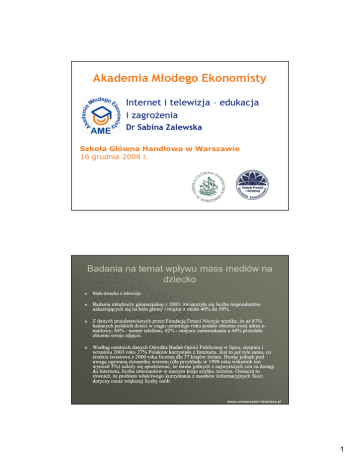 Akademia Młodego Ekonomisty Internet i telewizja – edukacja i zagrożenia Dr Sabina Zalewska Szkoła Główna Handlowa w Warszawie 16 grudnia 2008 r. Badania na temat wpływu mass mediów na dziecko Małe dziecko a telewizja Badania młodzieży gimnazjalnej z 2003: zwiększyła się liczba respondentów uskarżających się na bóle głowy i mięśni z około 40% do 59%. Z danych przedstawionych przez Fundację Dzieci Niczyje wynika, że aż 87% badanych polskich dzieci w ciągu ostatniego roku podało obcemu swój adres eemailowy, 64% - numer telefonu, 42% - miejsce zamieszkania a 44% przesłało obcemu swoje zdjęcie. Według ostatnich danych Ośrodka Badań Opinii Publicznej w lipcu, sierpniu i wrześniu 2003 roku 27% Polaków korzystało z Internetu. Jest to już tyle samo, co średnia światowa z 2000 roku liczona dla 37 krajów świata. Biorąc jednak pod uwagę ogromną dynamikę wzrostu (dla przykładu w 1998 roku wskaźnik ten wynosił 5%) należy się spodziewać, że mimo jednych z najwyższych cen za dostęp do Internetu, liczba internautów w naszym kraju szybko wzrasta. Oznacza to również, że problem właściwego korzystania z zasobów informacyjnych Sieci dotyczy coraz większej liczby osób. www.uniwersytet--dzieciecy.pl www.uniwersytet 1 Badania na temat wpływu mass mediów na dziecko (C.D.) W Polsce na ok. 500 tys. nauczycieli formalne kwalifikacje do nauczania informatyki ma ok. 13 tys. z nich, co stanowi zaledwie 2.6% ogółu. Według magazynu Deutschland dostęp do Internetu w świecie nie jest zjawiskiem powszechnym. Przytoczone dane z listopada 2000 wskazują, że poszczególne regiony świata mają tu następujący udział: Bliski Wschód – 0,4%, Afryka 0,6%, Ameryka Łac. 4%, Azja i Oceania 24%, Europa 28%, Kanada i USA łącznie 43%. 68% dzieci otrzymuje propozycje spotkań od osób poznanych w Sieci; 44,6% dzieci korzysta z propozycji spotkań; Jedynie 23,6% dzieci informuje rodziców o spotkaniach z osobami poznanymi w Sieci; Połowa dzieci uczestniczy w spotkaniach w pojedynkę; 28,4% rodziców nie dostrzega żadnych zagrożeń dla dzieci korzystających z Internetu. Dzieci spędzają w sieci 60% wolnego czasu. Francuskie badania na temat reklamy www.uniwersytet--dzieciecy.pl www.uniwersytet DLACZEGO MEDIA I GRY SĄ DLA DZIECI TAK ATRAKCYJNE? zawsze ma czas, jest gotowy do pojęcia gry, zabawy, nie męczy się i nie odmawia pozwala wracać do ulubionych miejsc, bohaterów, akcji nie karze za błędy okazywaniem złości czy rozczarowania wprowadza do „idealnego świata”, w którym można realizować marzenia daje poczucie władzy, mocy, bycia kimś wyjątkowym, dokonywania niezwykłych czynów, odgrywania różnych ról (gry, IRC, internetowe grupy dyskusyjne) stwarza możliwość rozładowania emocji, także negatywnych, bez ponoszenia przykrych konsekwencji (co więcej – agresja często jest nagradzana) daje możliwość zaspokojenia potrzeb psychospołecznych – samorealizacji, uznania, przynależności do grupy, kontaktów z innymi osobami (warto zdać sobie sprawę, że możliwości oferowane przez internet są niejako „protezą” kontaktów międzyludzkich i nie rozwiązują realnych problemów na przykład z nieśmiałością czy brakiem bliskiej osoby: w sieci jesteśmy anonimowi, możemy przedstawiać się jako ktoś zupełnie inny, sami też możemy stać się ofiarą manipulacji czy oszustwa). www.uniwersytet--dzieciecy.pl www.uniwersytet 2 JAKIE CZYNNIKI SPRAWIAJĄ, ŻE DZIECKO UCIEKA W ŚWIAT MASS MEDIÓW? przebywanie w środowisku, w którym panuje moda na używanie komputera, internetu, „komórki” przeżywanie trudnych sytuacji, od których dziecko szuka ucieczki poczucie osamotnienia, trudności w nawiązywaniu kontaktów, poszukiwanie przyjaźni, znajomości zaniżone poczucie własnej wartości, brak samoakceptacji egocentryzm, dążenie do dominacji nad innymi poczucie nudy, brak zainteresowań i umiejętności atrakcyjnego spędzania wolnego czasu problemy emocjonalne, brak umiejętności radzenia sobie ze stresem i trudnymi sytuacjami brak kontroli ze strony rodziców chłód emocjonalny i zaburzenia komunikacji w rodzinie www.uniwersytet--dzieciecy.pl www.uniwersytet Oddziaływanie masowych środków przekazu - fizyczne - psychiczne - edukacyjne - moralne - społeczne - intelektualne www.uniwersytet--dzieciecy.pl www.uniwersytet 3 FIZYCZNE szybka koordynacja oko – ręka wczesny rozwój mięśni przegubu zdobycie informacji na temat kształtowania pozytywnych nawyków zdrowotnych informacje na temat higieny osobistej, dbałości o własny wygląd wady wzroku, skrzywienia kręgosłupa, obniżenie sprawności ruchowej bóle dolnych części kręgosłupa haluksy nadwaga nowotwory (skutek promieniowania elektromagnetycznego o częstotliwości do 50 Hz) obniżenie odporności immunologicznej obniżenie płodności zespół przewlekłego zmęczenia padaczka komputerowa www.uniwersytet--dzieciecy.pl www.uniwersytet Edukacyjne przygotowanie do właściwego (krytycznego) odbioru mediów brak weryfikacji prawdziwości informacji przygotowanie do posługiwania się mediami jako narzędziami, rozwoju intelektualnego, rozrywki i pracy zawodowej brak krytycyzmu wobec źródła korzystanie z jednego źródła informacji chaos informacyjny korzystanie z gotowych wzorców, nie rozwijanie wyobraźni i kreatywności przerost informacji nad umiejętnościami praktycznymi przyswajanie informacji nie adekwatnych do wieku zabiera czas umożliwiają wzajemne komunikowanie się, prowadzenie dialogu wywołują silne przeżycia intelektualne, przez co rozbudzają zaangażowanie, zaciekawienie i zainteresowanie materiałem nauczania media rozszerzają pole poznawcze uczących się przez udostępnieni im całej, rozległej rzeczywistości, rozwijając jednocześnie ich procesy percepcyjne, intelektualne i wykonawcze www.uniwersytet--dzieciecy.pl www.uniwersytet 4 Psychiczne TERAPEUTYCZNE, EMOCJE EMOCJE USPRAWNIENIE UMIEJĘTNOŚCI POSTRZEGANIA