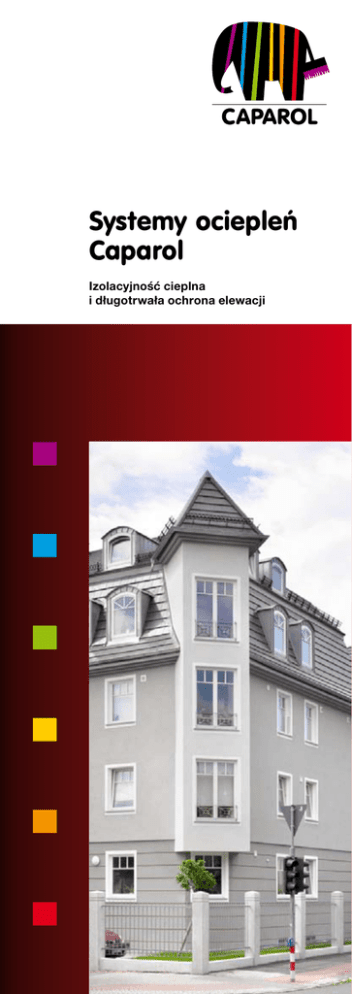 Systemy ociepleń Caparol Izolacyjność cieplna i długotrwała ochrona elewacji Izolacja cieplna na każdą porę roku Do wychłodzenia budynków dochodzi z różnych przyczyn, jednak aż do 75% strat ciepła może powstawać przez nieocieplone ściany zewnętrzne. Dlatego obecnie w celu zmniejszenia kosztów ogrzewania stosowane są powszechnie Bezspoinowe Systemy Ociepleniowe (BSO). Nie należy przy tym zapominać, że odgrywają one również ważną rolę latem. Nieocieplone lub źle ocieplone budynki są wówczas często nadmiernie przegrzane. Zakładając, że otwory okienne nie stanowią zbyt dużej powierzchni i dysponują odpowiednią ochroną przed słońcem, w obiektach, w których system ociepleń został prawidłowo wykonany, ciepło słoneczne zatrzymywane jest przez zewnętrzną warstwę izolacyjną. Takie domy są chronione zarówno w zimie, jak i w lecie. Obniżenie kosztów eksploatacji budynku i długotrwała ochrona elewacji Systemy ociepleń Caparol doskonale sprawdzają się już od ponad 40 lat. Można je wykonywać w obiektach nowo wznoszonych, jak i już użytkowanych. W każdym wypadku zastosowanie systemu ociepleń znacząco obniża zużycie energii na ogrzewanie budynku – czyli pozwala na zaoszczędzenie pieniędzy. Dodatkowo chroni substancję budowlaną. Redukuje uwarunkowane pogodą i porami roku zmiany temperatur w murze. Chroni przed wnikaniem z zewnątrz wilgoci, która w połączeniu z mrozem może prowadzić do powstawania pęknięć i innych uszkodzeń. Zastosowanie systemu ociepleń, w którym warstwę wierzchnią stanowią produkty z linii Caparol Clean Concept® pozwala na wyeliminowanie zabrudzeń i przeciwdziała porastaniu elewacji grzybami i algami. Zdjęcie termiczne przenikania ciepła Bez systemu ociepleń Caparol Z systemem ociepleń Caparol Firma Caparol Polska jest Członkiem Stowarzyszenia na Rzecz Systemów Ociepleń www.systemyocieplen.pl 2 Budowa systemu ociepleń Sercem systemu jest odpowiedniej grubości płyta ocieplająca ze styropianu lub wełny mineralnej. Może być tylko klejona lub klejona i dodatkowo zamocowana mechanicznie (kołkami). Przy prawidłowym mocowaniu zostanie skutecznie zabezpieczona przed wilgocią poprzez warstwy wierzchnie systemu. W efekcie przez dziesięciolecia będzie spełniała swoją izolacyjną rolę. We wszystkich wariantach systemów ociepleń Caparol, wyprawa końcowa oparta jest na produktach najwyższej jakości. 1 2 3 4 5 1. Zaprawa klejąca 2. Płyta ocieplająca 3. Warstwa zbrojona 4. Tynk nawierzchniowy 5. Powłoka malarska Technologia barwienia w systemie ColorExpress ColorExpress to system barwienia maszynowego zapewniający praktycznie nieograniczone możliwosci kształtowania kolorystycznego wnętrz i fasad budynków. Dzięki zastosowaniu nowoczesnych rozwiązań technicznych, dysponuje on ponad 4 500 000 recepturami kolorów dla farb, lakierów, tynków i systemów ochrony budowli. Receptury sporządzane na indywidualne życzenie są przygotowywane i archiwizowane w stacjach ColorExpress. Dzięki wprowadzeniu do pamięci systemu, żądany kolor może być w każdej chwili ponownie odtworzony. 3 W ofercie firmy Caparol znajdują się cztery nowoczesne warianty ociepleniowe z optymalnie dobranymi komponentami: Capatect KD System 600, Capatect Mineral, Capatact SI Silikat i Capatect 100. Capatect KD, System 600 Nowoc z esn y • z płytami styropianowymi • z tynkami akrylowymi lub silikonowymi • o najbogatszej palecie kolorów Capatect KD System 600 to kompletny system ociepleń składający się ze starannie dobranych do siebie materiałów. Gwarantuje izolację cieplną, długotrwałą czystość fasady, skuteczną ochronę przed rozwojem alg i grzybów oraz, dzięki bogatej kolorystyce, pełną swobodę projektowania. Capatect KD System 600 jest „klasykiem” o wszechstronnym zastosowaniu. Optymalne własności termoizolacyjne systemu zapewniają samogasnące płyty styropianowe o odpowiednio dobranej grubości. Mocowanie płyt wykonuje się, w zależności od rodzaju podłoża, poprzez klejenie lub klejenie i dodatkowe mocowanie mechaniczne (kołkami). Wariant systemu Capatect KD System 600 z wyprawą z tynków silikonowych oparty jest na produktach z linii Caparol Clean Concept®. Produkty te są bardzo mało podatne na zabrudzenia, zapewniają maksymalny współczynnik przepuszczalności pary wodnej (tzw. „oddychanie ścian”) przy minimalnym wchłanianiu wody i znakomicie chronią elewację przed rozwojem alg i grzybów. Właściwości systemu: • klasyfikacja ogniowa NRO • wszechstronne zastosowanie • zoptymalizowane zużycie produktów • w yprawa wierzchnia z tynków akrylowych lub silikonowych • długotrwała czystość i skuteczna ochrona przed rozwojem alg i grzybów • nieograniczone możliwości barwienia w systemie ColorExpress Aprobata Techniczna AT-15-5616/2008 Materiały tworzące system ociepleń zużycie na 1 m2 Masa klejowa Capatect 190 S od 4,5 kg Płyta styropianowa EPS 70 lub EPS 80 ok. 1,0 m2 Masa klejowo-szpachlowa Capatect 190 ok. 4,5 kg lub masa szpachlowa Capatect-ZF-Spachtel 699 3-4,5 kg Siatka z włókna szklanego Capatect 650/100 ok. 1,1 m2 Podkład tynkarski Putzgrund 610 ok. 0,25 kg Wyprawa końcowa – tynki akrylowe (polisiloxany): Capatect-Fassadenputz R20, kornik 2 mm ok. 2,7 kg Capatect-Fassadenputz R30, kornik 3 mm ok. 3,6 kg Capatect-Fassadenputz K15, baranek 1,5 mm ok. 2,5 kg Capatect-Fassadenputz K20, baranek 2 mm ok. 3,0 kg Capatect-Fassadenputz K30, baranek 3 mrn ok. 4,4 kg Możliwość malowania tynków akrylowych farbami elewacyjnymi, dyspersyjnymi: Amphibolin, Muresko Plus, Acryl Fassadenfarbe lub silikonowymi: AmphiSilan Plus, ThermoSan, Muresko Premium ok. 0,25 l Wyprawa końcowa – tynki silikonowe (formuła CCC ®): AmphiSilan R20, kornik 2 mm ok. 2,7 kg AmphiSilan R30, kornik 3 mm ok. 3,3 kg AmphiSilan K15, baranek 1,5 mm ok. 2,8 kg AmphiSilan K20, baranek 2 mm ok. 3,4 kg AmphiSilan K30, baranek 3 mm ok. 4,1 kg Mo