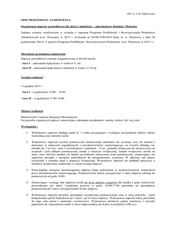 Zał. nr 3 do Ogłoszenia OPIS PRZEDMIOTU ZAMÓWIENIA: Organizacja imprezy gwiazdkowej dla dzieci i młodzieży – mieszkańców Dzielnicy Mokotów Zadanie zostanie zrealizowane w związku z zapisami Programu Profilaktyki i Rozwiązywania Problemów Alkoholowych m.st. Warszawy w 2015 r. (Uchwała nr XCIII/2386/2014 Rady m. st. Warszawy z dnia 30 października 2014r. w sprawie Programu Profilaktyki i Rozwiązywania Problemów m.st. Warszawy w 2015 r.). Określenie przedmiotu zamówienia – Impreza gwiazdkowa zostanie zorganizowana w dwóch turach: - tura I – adresatami będą dzieci w wieku 6-11 lat - tura II – adresatami będą dzieci i młodzież w wieku 12-18 lat Termin realizacji 11 grudnia 2015 r. - tura I - w godzinach: 14.00 – 16.00 - tura II – w godzinach 17.00-19.00 Miejsce realizacji Mokotowskie Centrum Integracji Mieszkańców. Na potrzeby organizacji imprezy zamawiający udostępni nieodpłatnie: szatnię, toalety, hol, trzy sale Wymagania : 1. Wykonawca zapewni obsługę szatni tj. 1 osoba przyjmująca i wydająca uczestnikom zabawy odzież wierzchnią oraz numerki szatni. 2. Wykonawca zapewni wystrój pomieszczeń (dostarczenie artykułów do wystroju oraz ich montaż i demontaż w miejscach uzgodnionych z przedstawicielem zamawiającego; na wystrój składają się: choinki ok. 2 m wys. wraz z oświetleniem i ozdobami – 8 szt., girlandy świąteczne do umieszczenia na ścianach i pod sufitami pomieszczeń, standy o tematyce świątecznej, lampki świąteczne, stroiki na stoły, inne, których montaż nie będzie powodował zniszczenia ścian pomieszczeń, zamawiający nie zapewnia narzędzi i sprzętów potrzebnych do przygotowania wystroju). W głównej sali należy wyświetlić z rzutnika slajd o tematyce świątecznej. Wykonawca zapewni też podkład muzyczny o tematyce świątecznej, emitowany w czasie trwania imprezy. 3. Poszczególne elementy harmonogramu imprezy będą realizowane w pomieszczeniach wskazanych przez przedstawiciela zamawiającego. Pomieszczenia należy przygotować w dniu imprezy (dostęp do pomieszczeń od godz. 8.00) 4. Zamawiający wymaga, aby impreza trwała po dwie godziny zegarowe dla każdej z grup wiekowych, przewidziana jest także 1-godzinna przerwa w godz. 16.00-17.00 potrzebna na uprzątnięcie pomieszczeń po I turze i przygotowanie II tury imprezy. 5. Wykonawca zapewni personel sprzątający wyznaczone pomieszczenia oraz w razie potrzeby - teren bezpośrednio przed budynkiem po I turze i po II turze imprezy. Wykonawca zapewni także potrzebne do tego celu sprzęt i materiały czystościowe. Wykonawca dostarczy papier toaletowy i ręczniki papierowe do wyposażenia toalet w ilości odpowiedniej do liczby uczestników (100 os.). 6. Wykonawca zapewni obsługę personalną imprezy, w której skład wejdą: osoba prowadząca imprezę (konferansjer), osoba pełniąca funkcję św. Mikołaja, animatorzy współprowadzący imprezę i obsługujący stanowiska tematyczne określone w harmonogramie imprezy (5 os.). Obsługa personalna imprezy powinna mieć stroje utrzymane w stylistyce świątecznej. 7. Wykonawca zapewni pomoc medyczno-pielęgniarską na czas trwania imprezy tj. w godzinach 14.0019.00. 8. Wykonawca będzie ubezpieczony od odpowiedzialności cywilnej w zakresie prowadzonej działalności związanej z przedmiotem zamówienia. 9. Wykonawca jest zobowiązany do zorganizowania poczęstunku dla uczestników imprezy w czasie trwania zabawy, w formie stołu szwedzkiego zapewniającego bezpośredni dostęp do napojów i przekąsek, wykonawca zapewni też naczynia (obrusy 2mx2m 4 szt., jednorazowe kubeczki, serwetki, talerzyki, tace, misy) - do jego podania. Poczęstunek powinien się składać z: mandarynek, pokrojonych ciast świątecznych typu makowiec/ piernik (cztery rodzaje); ciastek kruchych cynamonowych i czekoladowych, słonych przekąsek (chipsy, paluszki), małych kanapek (typu tartinki) - dwa rodzaje 200 szt.; soków 100 % o różnych smakach; wody niegazowanej. W/w artykuły powinny być dostarczone w ilości odpowiadającej liczbie uczestników imprezy (100 os.). Wykonawca zapewni też napoje ciepłe (herbata, cukier, cytryna oraz sprzęt i naczynia do ich podania) – około 30 porcji. 10. Wskazane jest, by oferenci przed złożeniem oferty zapoznali się z warunkami lokalowymi Centrum Integracji Mieszkańców, na terenie którego odbędzie się impreza. 11. Wykonawca zobowiązany jest do przeprowadzenia imprezy w oparciu o ramowy harmonogram przygotowany odrębnie dla każdej z tur. W harmonogramach powinny się znaleźć następujące elementy: Tura I (dzieci młodsze) – • • • • • • • • • szatnia, uroczyste powitanie uczestników przez przedstawicieli zamawiającego i wykonawcy, zapoznanie uczestników z programem imprezy i zasadami bezpieczeństwa podczas jej trwania, przeprowadzenie 3 konkursów słownych/plastycznych o tematyce świątecznej i prozdrowotnej – należy przystosować stopień trudności i rodzaj konkursu do wieku uczestników. wykonawca w każdym z konkursów zapewni nagrody rzeczowe za zajęcie 1,2,3 miejsca o wartości odpowiednio: 150zł. , 100zł. , 50zł.) przystosowane do wieku uczestników, przeprowadzenie koncertu kolęd (z uwagi na ograniczoną ilość miejsca i warunki techniczne wymaga się, by był to koncert akustyczny w wykonaniu do 5 artystów, ewentualne nagłośnienie lub oświetlenie powinien zapewnić wykonawca), koncert powinien trwać około 30-40 min. Wymagane jest przeprowadzenie próby występu przed rozpoczęciem imprezy. Przeprowadzenie „wizyty Mikołaja” i wręczenie paczek świątecznych (zawartość paczek świątecznych została opisana poniżej), zamawiający określi sposób rozdysponowania paczek. Animacja zabaw przy stanowiskach na których uczestnicy będą mogli wykonać kartki i ozdoby świąteczne (wykonawca zapewni potrzebne materiały plastyczne i sprzęt), obsługa stanowiska „malowanie buziek” (wykonawca zapewni artykuły pot