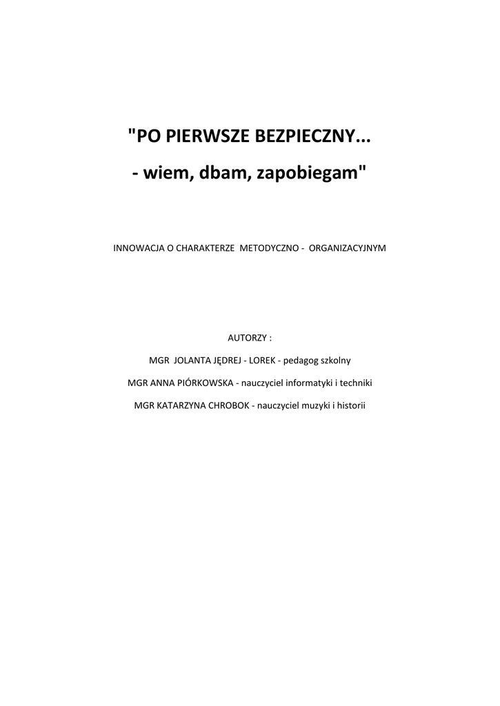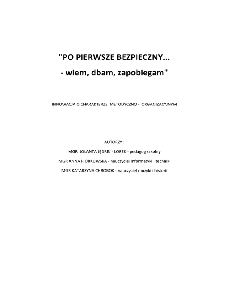 "PO PIERWSZE BEZPIECZNY... - wiem, dbam, zapobiegam" INNOWACJA O CHARAKTERZE METODYCZNO - ORGANIZACYJNYM AUTORZY : MGR JOLANTA JĘDREJ - LOREK - pedagog szkolny MGR ANNA PIÓRKOWSKA - nauczyciel informatyki i techniki MGR KATARZYNA CHROBOK - nauczyciel muzyki i historii I. OPIS INNOWACJI: 1. Temat innowacji: „ Po pierwsze bezpieczny... - wiem, dbam, zapobiegam" 2. Rodzaj innowacji: Innowacja dotyczy nowatorskich rozwiązao metodyczno -organizacyjnych. 3. Miejsce innowacji Proponowane rozwiązanie zostanie wdrożone im. Heleny i Ignacego Fików w Mysłowicach. w Szkole Podstawowej nr 1 4. Autorzy innowacji: Jolanta Jędrej - Lorek absolwentka Wyższej Szkoły Pedagogicznej TWP w Warszawie - pedagogika resocjalizacyjna - Wydział Nauk Społeczno - Pedagogicznych w Katowicach; kurs kwalifikacyjny: terapia pedagogiczna - RODN WOM Katowice; studia podyplomowe: socjoterapia i resocjalizacja - Wyższa Szkoła Humanistyczno Ekonomiczna w Brzegu - Instytut Studiów Podyplomowych w Tychach; doskonalenie zawodowe - SOS pomoc szkole w sytuacji kryzysu ROME METIS w Katowicach; Anna Piórkowska absolwentka Akademii Świętokrzyskiej im. Jana Kochanowskiego w Kielcach w Fili w Piotrkowie Trybunalskim - pedagogika z edukacją informatyczną; studia podyplomowe - technika i grafika komputerowa w szkole - Wyższa Szkoła Gospodarki Krajowej w Kutnie - Centrum Doskonalenia Kadr i Nauczycieli w Piotrkowie Trybunalskim; Katarzyna Chrobok absolwentka Uniwersytetu Śląskiego w Katowicach - wychowanie muzyczne Wydział Pedagogiczno-Artystyczny– filia w Cieszynie; studia podyplomowe - sztuka - Wyższej Szkoły Administracji w Bielsku-Białej; studia podyplomowe - historia - Uniwersytet Jagiellooski w Krakowie; studia podyplomowe - zarządzanie w oświacie - ŚWSZ im. Gen. J. Ziętka w Katowicach; egzaminator sprawdzianu po kl. VI szkoły podstwowej i egzaminu maturalnego z historii; doskonalenie zawodowe - SOS pomoc szkole w sytuacji kryzysu ROME METIS w Katowicach; II. Zakres innowacji 1. Proponowane nowatorskie rozwiązanie będzie obejmowad lekcje wychowawcze, zajęcia komputerowe oraz zajęcia pozalekcyjne i spotkania z rodzicami; 2. Adresatami innowacji będą uczniowie klas I-III i IV-VI szkoły podstawowej oraz nauczyciele i rodzice; 3. Czas realizacji jest przewidziany na rok szkolny 2015/2016. III. Motywacja wprowadzenia innowacji i oczekiwania z nią związane Nadrzędnym celem szkoły jest wszechstronny rozwój ucznia, któremu stwarza się warunki do zdobywania wiedzy i umiejętności służących do przeciwdziałania wszystkiemu, co zagraża jego zdrowiu i bezpieczeostwu. Z analizy sytuacji wychowawczej i stanu opieki dokonanej przez pedagoga szkolnego oraz sporadycznych incydentów obserwowanych przez pracowników szkoły czy poruszanych przez rodziców w czasie spotkao problemów, widzimy potrzebę rozpowszechnienia działao profilaktycznych wśród uczniów, nauczycieli oraz rodziców. Chcemy wesprzed działania pedagogów, wychowawców poprzez stworzenie interdyscyplinarnych i integracyjnych działao wychowawczo - profilaktycznych i promowad właściwe zachowania wsparte pomocą instytucji i osób, które zajmują się zapewnieniem zdrowia i bezpieczeostwa jak: policja, straż pożarna, pogotowie ratunkowe, WOPR itp. Uczeo XXI wieku jest uczestnikiem wielkiego i szybkiego postępu naukowo technicznego, który korzystając z tych nowinek często nieświadomie może stad się jego ofiarą. Z rozmów z uczniami i rodzicami, dzieci są ofiarami cyberprzemocy, nie zdając sobie z tego sprawy. Pragniemy poprzez nasze działania innowacyjne uświadomid i obdarzyd ucznia wiedzą jakie zagrożenia mogą go spotkad w życiu codziennym (np.: bezpieczeostwo w ruchu drogowym, używki, "śmieciowe jedzenie") jak i w globalnej przestrzeni (cyberprzemoc) oraz wyposażyd go w praktyczne umiejętności radzenia sobie w sytuacji kryzysowej od lat najmłodszych. Ze względów organizacyjnych wszystkie działania będą skoordynowane z pracą wychowawców, pedagoga i nauczyciela zajęd komputerowych. Nowatorstwem tej innowacji jest zaangażowanie uczniów, rodziców i nauczycieli, aby wspólnie podejmowad działania, które mają na celu zapobiegad pojawieniu się niekorzystnego zjawiska społecznego, które oceniamy jako szkodliwe i niepożądane w życiu codziennym i świecie wirtualnym. Zakładamy, iż założone cele zostaną osiągnięte. Uczniowie i rodzice zdobędą wiedzę na temat zagrożeo współczesnego świata oraz jak radzid sobie w kryzysowych sytuacjach i do jakich instytucji, poza szkołą, mogą zwrócid się o pomoc. Młodzi ludzi będą uwrażliwieni na problemy rówieśników i będą wzajemnym dla siebie wsparciem w trudnych sytuacjach. IV. ZAŁOŻENIA INNOWACJI PEDAGOGICZNEJ 1. Cel ogólny: Podwyższenie jakości pracy szkoły w zakresie zwiększenia poziomu bezpieczeostwa uczniów, zwiększenia świadomości zagrożeo otaczającego ich świata oraz wykształcenie prawidłowych odruchów w sytuacjach kryzysowych od najmłodszych lat. Podjęte działania są odpowiedzią na potrzeby rozwojowe młodego, aktywnego człowieka. 2. Cele szczegółowe: promowanie wśród uczniów wzorów bezpiecznych zachowao podczas spędzania wolnego czasu(np. po lekcjach, w czasie ferii, wakacji, itp.), wskazanie alternatywnych form spędzenia wolnego czasu, zapoznanie z podstawowymi zasadami udzielania pierwszej pomocy, nabywanie umiejętności przewidywania skutków niewłaściwych zachowao, zapoznanie z zasadami ruchu drogowego, kształtowanie i rowerzysty), świadomego uczestnika ruchu drogowego (pieszego pogłębianie wiedzy i świadomości na temat uzależnieo, przeciwdziałanie uzależnieniom oraz promocja zdrowia, kształtowanie postaw prozdrowotnych i prospołecznych wśród młodzieży, uwrażliwienie młodych ludzi na kłopoty innych rówieśników oraz zdobycie przez nich podstawowych umiejętności udzielania pomocy w problemowych sytuacjach, stworzenie możliwości nawiązania pierwszego kontakt