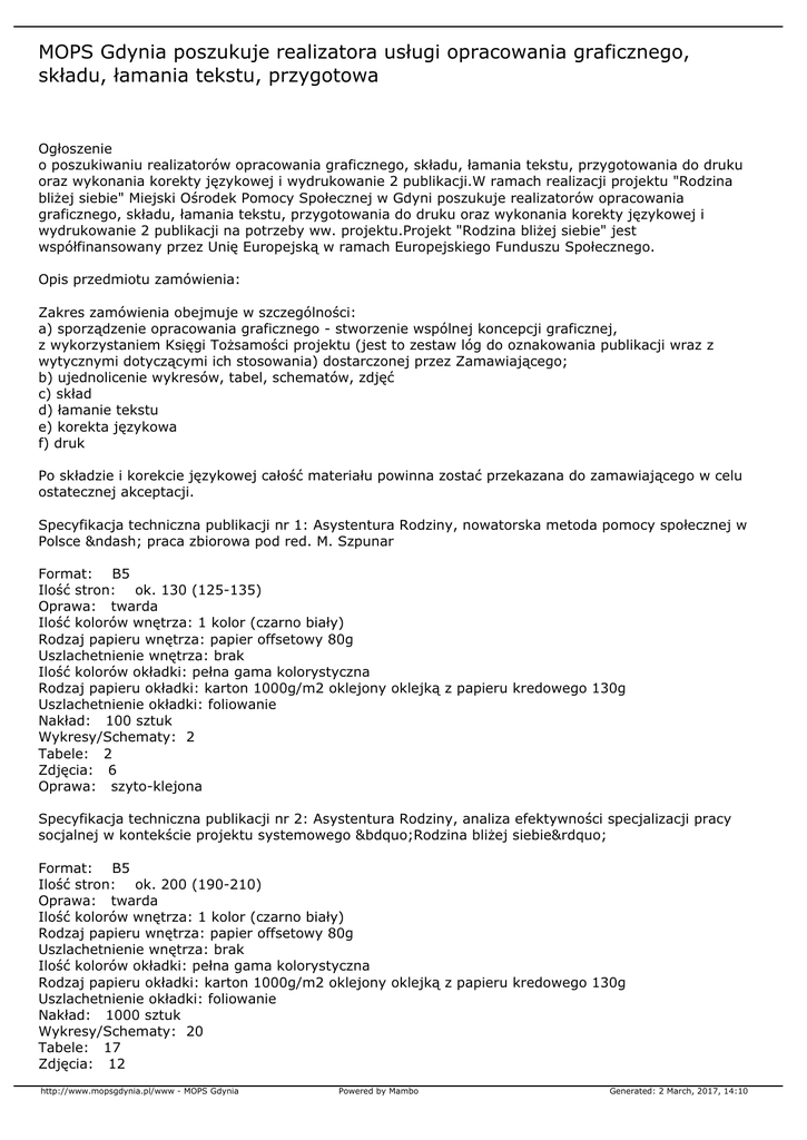 MOPS Gdynia poszukuje realizatora usługi opracowania graficznego, składu, łamania tekstu, przygotowa Ogłoszenie o poszukiwaniu realizatorów opracowania graficznego, składu, łamania tekstu, przygotowania do druku oraz wykonania korekty językowej i wydrukowanie 2 publikacji.W ramach realizacji projektu "Rodzina bliżej siebie" Miejski Ośrodek Pomocy Społecznej w Gdyni poszukuje realizatorów opracowania graficznego, składu, łamania tekstu, przygotowania do druku oraz wykonania korekty językowej i wydrukowanie 2 publikacji na potrzeby ww. projektu.Projekt "Rodzina bliżej siebie" jest współfinansowany przez Unię Europejską w ramach Europejskiego Funduszu Społecznego. Opis przedmiotu zamówienia: Zakres zamówienia obejmuje w szczególności: a) sporządzenie opracowania graficznego - stworzenie wspólnej koncepcji graficznej, z wykorzystaniem Księgi Tożsamości projektu (jest to zestaw lóg do oznakowania publikacji wraz z wytycznymi dotyczącymi ich stosowania) dostarczonej przez Zamawiającego; b) ujednolicenie wykresów, tabel, schematów, zdjęć c) skład d) łamanie tekstu e) korekta językowa f) druk Po składzie i korekcie językowej całość materiału powinna zostać przekazana do zamawiającego w celu ostatecznej akceptacji. Specyfikacja techniczna publikacji nr 1: Asystentura Rodziny, nowatorska metoda pomocy społecznej w Polsce – praca zbiorowa pod red. M. Szpunar Format: B5 Ilość stron: ok. 130 (125-135) Oprawa: twarda Ilość kolorów wnętrza: 1 kolor (czarno biały) Rodzaj papieru wnętrza: papier offsetowy 80g Uszlachetnienie wnętrza: brak Ilość kolorów okładki: pełna gama kolorystyczna Rodzaj papieru okładki: karton 1000g/m2 oklejony oklejką z papieru kredowego 130g Uszlachetnienie okładki: foliowanie Nakład: 100 sztuk Wykresy/Schematy: 2 Tabele: 2 Zdjęcia: 6 Oprawa: szyto-klejona Specyfikacja techniczna publikacji nr 2: Asystentura Rodziny, analiza efektywności specjalizacji pracy socjalnej w kontekście projektu systemowego „Rodzina bliżej siebie” Format: B5 Ilość stron: ok. 200 (190-210) Oprawa: twarda Ilość kolorów wnętrza: 1 kolor (czarno biały) Rodzaj papieru wnętrza: papier offsetowy 80g Uszlachetnienie wnętrza: brak Ilość kolorów okładki: pełna gama kolorystyczna Rodzaj papieru okładki: karton 1000g/m2 oklejony oklejką z papieru kredowego 130g Uszlachetnienie okładki: foliowanie Nakład: 1000 sztuk Wykresy/Schematy: 20 Tabele: 17 Zdjęcia: 12 http://www.mopsgdynia.pl/www - MOPS Gdynia Powered by Mambo Generated: 2 March, 2017, 14:10 Oprawa: szyto-klejona Uwagi ogólne: Przedmiot zamówienia będzie obejmował publikacje będące wynikiem pracy ekspertów i badaczy w projekcie systemowym „Rodzina bliżej siebie”, realizowanym przez MOPS w Gdyni. Materiały zostaną dostarczone Wykonawcy w wersji elektronicznej. Obie publikację będą posiadały numer ISBN. Po składzie i korekcie językowej całość materiału zostanie przekazana do zamawiającego w celu ostatecznej akceptacji. W wypadku zastrzeżeń Wykonawca będzie obowiązany wprowadzić zmiany wedle uwag Zamawiającego. Zamawiający zastrzega sobie prawo do zgłaszania zastrzeżeń na każdym etapie realizacji umowy i wydawania wiążących poleceń co do sposobu wykonania umowy. Liczba stron publikacji może ulec zmianie. Wykonawca zobowiązany jest dostarczyć przedmiot zamówienia do siedziby Zamawiającego: MOPS Gdynia, ul. Grabowo 2. Wymagane doświadczenie wykonawcy: W celu wykazania, że Wykonawca dysponuje odpowiednim doświadczeniem przy realizacji tego typu usług, musi on przedstawić zamawiającemu potwierdzenie (na podstawie referencji lub innych dokumentów umożliwiających potwierdzenie tego faktu) iż realizował działania z zakresu określonego w przedmiocie Zamówienia w wypadku co najmniej 10 publikacji z nadanym numerem ISBN. Termin realizacji zamówienia Termin realizacji zamówienia: maksymalnie 30 dni od daty przekazania materiałów przez Zamawiającego w wersji elektronicznej. Przy wyborze ofert zostaną wzięte pod uwagę następujące elementy: 1) cena usługi 2) termin realizacji usługi (od czasu przekazania materiałów przez Zamawiającego), termin pożądany – jak najkrótszy Oferty zawierające cenę całkowitą wraz z kosztorysem uwzględniającym poszczególne elementy usługi oraz deklarowanym terminem realizacji można składać do dnia 18.08.2011r. do godziny 16:00 drogą elektroniczną na adres: [email protected] lub osobiście w Biurze projektu Gdynia ul. Świętojańska 57/1 Osoba do kontaktu: Tomasz Łoś tel. (0-58) 627-85-05; +48-785-101-303 http://www.mopsgdynia.pl/www - MOPS Gdynia Powered by Mambo Generated: 2 March, 2017, 14:10