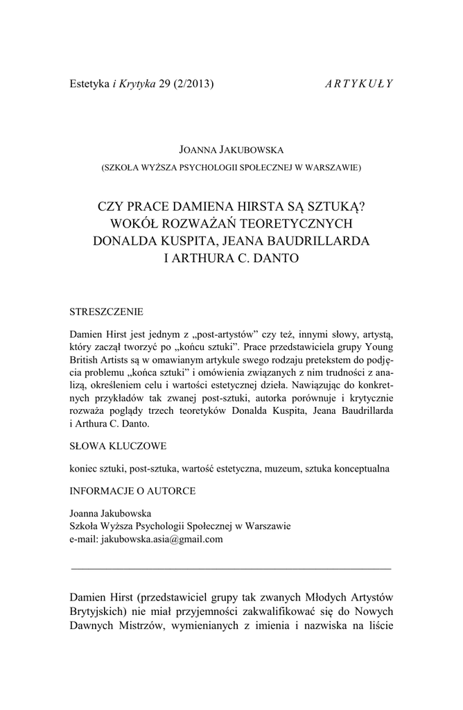 Estetyka i Krytyka 29 (2/2013) ARTYKUŁY JOANNA JAKUBOWSKA (SZKOŁA WYŻSZA PSYCHOLOGII SPOŁECZNEJ W WARSZAWIE) CZY PRACE DAMIENA HIRSTA SĄ SZTUKĄ? WOKÓŁ ROZWAŻAŃ TEORETYCZNYCH DONALDA KUSPITA, JEANA BAUDRILLARDA I ARTHURA C. DANTO STRESZCZENIE Damien Hirst jest jednym z „post-artystów” czy też, innymi słowy, artystą, który zaczął tworzyć po „końcu sztuki”. Prace przedstawiciela grupy Young British Artists są w omawianym artykule swego rodzaju pretekstem do podjęcia problemu „końca sztuki” i omówienia związanych z nim trudności z analizą, określeniem celu i wartości estetycznej dzieła. Nawiązując do konkretnych przykładów tak zwanej post-sztuki, autorka porównuje i krytycznie rozważa poglądy trzech teoretyków Donalda Kuspita, Jeana Baudrillarda i Arthura C. Danto. SŁOWA KLUCZOWE koniec sztuki, post-sztuka, wartość estetyczna, muzeum, sztuka konceptualna INFORMACJE O AUTORCE Joanna Jakubowska Szkoła Wyższa Psychologii Społecznej w Warszawie e-mail: [email protected] _______________________________________________________ Damien Hirst (przedstawiciel grupy tak zwanych Młodych Artystów Brytyjskich) nie miał przyjemności zakwalifikować się do Nowych Dawnych Mistrzów, wymienianych z imienia i nazwiska na liście 100 Joanna Jakubowska ______________________________________________________________________________________________________________________________________________________________________________________________________ Donalda Kuspita. Udało mu się natomiast uzyskać status postartysty tworzącego postsztukę, a więc został zaszeregowany obok Andy’ego Warhola, Johna Cage’a, Roberta Rauschenberga i oczywiście mizoginicznego (według Kuspita) Marcela Duchampa. Odmówiono mu wobec tego miana wizjonera humanisty, którego twórczość „przynosi świeże poczucie celowości sztuki – wiarę w możliwość utworzenia nowej harmonii estetycznej z dramatu istnienia, bez zafałszowania go – wraz z nowym poczuciem uniwersalności artystycznego języka”1. Postsztuka, zdaniem Kuspita, nie tylko odwraca się od wartości estetycznej, ale przede wszystkim za bardzo „przytula się” do wroga i z nim utożsamia, a „wróg” to życie codzienne, a więc – także w przypadku Hirsta – w grę wchodzi rezygnacja z klarownej granicy między sztuką a rzeczywistością. Kiedy sztuka współczesna przytula się do codzienności i utożsamia się z nią [...] [staje się] w najlepszym wypadku sztuką nominalną, zjawiskiem powszechnym, z zaszczytną tożsamością sztuki, ale bez jej transcendentalnej ambicji i substancji estetycznej. Jest to w rzeczywistości codzienne życie kiepsko przebrane za sztukę2. Kwintesencją osiąganej w ten sposób banalności jest wedle Kuspita sztuka konceptualna, a jej strażnikami są muzea i rynek finansowy. Po pierwsze więc, postsztuka – zgodnie z przytaczaną przez Kuspita wypowiedzią Andy’ego Warhola – pozbawiona jest głębi. „Jeśli chcesz wiedzieć wszystko o Andym Warholu, po prostu popatrz na powierzchnię: moich obrazów, filmów i mnie – oto ja. Za tym nie ma niczego”3. Po drugie, jego splendor artystyczny to po prostu sukces materialny i społeczny, którego ceną jest ignorowanie głębokiego wymiaru egzystencjalnego. Po trzecie, współwinne sankcjonowania tego rodzaju sztuki są muzea. „Pieniądze i muzea zapewniają nowy status przedmiotom, ponieważ dzięki nim stały się ważnymi dobrami inwestycyjnymi, wznosząc się ponad spekulację intelektualną, która na początku uczyniła je dziełami sztuki”4. Warhol, Hirst i inni przedstawiciele postsztuki nie wierzą w to, co dla Kuspita jest uświęconym celem sztuki, w transcendencję i głębię. 1 D. Kuspit, Koniec sztuki, tłum. J. Borowski, Gdańsk 2006, s. 194. Tamże, s. 62. 3 Tamże, s. 153. 4 Tamże, s. 78. 2 Czy prace Damiena Hirsta są sztuką?... 101 ______________________________________________________________________________________________________________________________________________________________________________________________________ Objawienie transcendencji w tym, co codzienne, jest wartością sztuki, tak jak nieodłączna od sztuki jest wartość estetyczna. Dla postartystów nie ma też głębi, nie ma prawdy o rzeczywistości, nie ma czegoś pod powierzchnią, nie ma czegoś nad, co mogłoby uporządkować poglądy teoretyczne i pokazać, jak właściwie żyć. Spór Kuspita z postartystami ma więc charakter czysto światopoglądowy i –jako taki – jest nierozstrzygalny (oczywiście nie dla Kuspita, który zakłada esencjalistyczną koncepcję sztuki, pozwalającą łatwo odgraniczyć sztukę od nie-sztuki, sztukę od rzeczywistości, sztukę od codzienności). Bliższe praktykom postartystów byłyby raczej rozważania teoretyczne Jeana Baudrillarda i Arthura C. Danto. Ten pierwszy nie tylko odrzuca głębię, ale i akcentuje historyczność geniuszu artystycznego, uznając, że Warhol w latach 60. XX wieku był genialny, a w latach 80. stracił swój niezwykły zmysł5. Drugi z teoretyków akcentuje z kolei zależność pojęcia sztuki od świata sztuki, akcentuje więc nie tylko czasowość sztuki, ale włącza do jej zakresu przejawy – by pozostać przy terminologii Kuspita – postsztuki. Absurdalne wręcz wydaje się twierdzenie, że można przekazać jakąś uniwersalną wizję artystyczną w świecie, w którym nie ma żadnych doświadczeń uniwersalnych, a jest tylko różnorodność doświadczeń zdeterminowanych kulturowo. W takim ujęciu sztuka jest tylko kolejnym omówieniem jednej z kulturowych wersji codziennego życia, a nie rewolucyjnym wyzwaniem dla niego. [...] Sztuka może jedynie wpływać na kształt jego powierzchni6. Przytoczona wypowiedź Kuspita jest o tyle ciekawa, że większość postartystów mogłaby się pod nią podpisać. Nie wydaje się ona jednak wyrazem bólu światopoglądowego teoretyka, który pragnie, aby artysta była autorytetem g