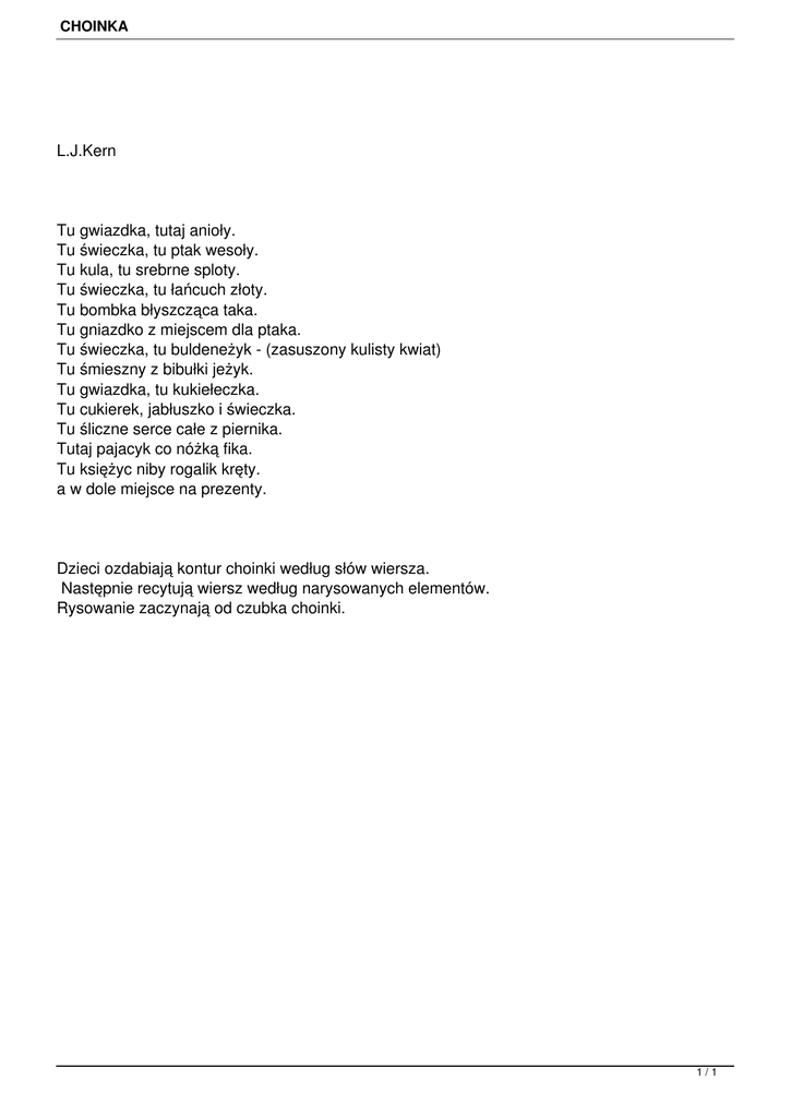 CHOINKA L.J.Kern Tu gwiazdka, tutaj anioły. Tu świeczka, tu ptak wesoły. Tu kula, tu srebrne sploty. Tu świeczka, tu łańcuch złoty. Tu bombka błyszcząca taka. Tu gniazdko z miejscem dla ptaka. Tu świeczka, tu buldeneżyk - (zasuszony kulisty kwiat) Tu śmieszny z bibułki jeżyk. Tu gwiazdka, tu kukiełeczka. Tu cukierek, jabłuszko i świeczka. Tu śliczne serce całe z piernika. Tutaj pajacyk co nóżką fika. Tu księżyc niby rogalik kręty. a w dole miejsce na prezenty. Dzieci ozdabiają kontur choinki według słów wiersza. Następnie recytują wiersz według narysowanych elementów. Rysowanie zaczynają od czubka choinki. 1/1