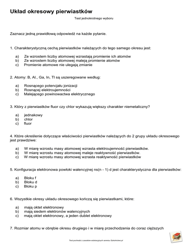 Układ okresowy pierwiastków Test jednokrotnego wyboru Zaznacz jedną prawidłową odpowiedź na każde pytanie. 1. Charakterystyczną cechą pierwiastków należących do tego samego okresu jest: a) b) c) Ze wzrostem liczby atomowej wzrastają promienie ich atomów Ze wzrostem liczby atomowej maleją promienie atomów Promienie atomowe nie ulegają zmianie 2. Atomy: B, Al., Ga, In, Tl są uszeregowane według: a) b) c) Rosnącego potencjału jonizacji Rosnącej elektroujemności Malejącego powinowactwa elektrycznego 3. Który z pierwiastków fluor czy chlor wykazują większy charakter niemetaliczny? a) b) c) jednakowy chlor fluor 4. Które określenie dotyczące właściwości pierwiastków należących do 2 grupy układu okresowego jest prawdziwe: a) b) c) W miarę wzrostu masy atomowej wzrasta elektroujemność pierwiastków. W miarę wzrostu masy atomowej maleje reaktywność pierwiastków. W miarę wzrostu masy atomowej wzrasta reaktywność pierwiastków 5. Konfiguracja elektronowa powłoki walencyjnej ns(n - 1) d jest charakterystyczna dla pierwiastków: a) b) c) Bloku f Bloku d Bloku p 6. Wszystkie okresy układu okresowego kończą się pierwiastkami, które: a) b) c) mają oktet elektronowy mają siedem elektronów walencyjnych mają oktet elektronowy, a jeden dublet elektronowy 7. Rozmiar atomu w obrębie okresu drugiego i w miarę przechodzenia do coraz cięższych Test pochodzi z zasobów edukacyjnych serwisu Szkolnictwo.pl pierwiastków, zmienia się w następujący sposób: a) b) c) maleje rośnie zmienia się nieregularnie 8. Uszereguj tlenki: CaO, MgO i Na2O zgodnie ze wzrostem charakteru zasadowego. a) b) c) CaO - Na2O - MgO Na2O - CaO - MgO Na2O - MgO - CaO 9. Prawidłowe przyporządkowanie pierwiastków do bloków energetycznych znajduje się w szeregu: a) b) c) Blok p - Rb, C; blok d - Ge, Hg Blok p - He, As; blok d - Mn, Au Blok p - Si, Te; blok d - Cr, Ni 10. Badano moc kwasów tlenowych i beztlenowych fluorowców i stwierdzono, że zmienia się ona w następujący sposób: a) b) c) HClO> HBrO>HIO HI>HBr>HCl obie odpowiedzi są prawidłowe 11. Wskaż zdanie nieprawdziwe: a) na podstawie układu okresowego można przewidzieć właściwości chemiczne nie tylko pierwiastków, ale i ich prostych związków b) maksymalna wartościowość pierwiastków drugiego okresu jest zgodna z numerem okresu c) w szeregu pierwiastków uporządkowanych według rosnących wartości liczb atomowych właściwości chemiczne zmieniają się w sposób okresowy 12. Prawidłową liczbę elektronów walencyjnych w atomach pierwiastków należących do odpowiednich bloków przedstawia: a) b) c) blok s: od 1 ? 2 blok p: od 3 ? 8 blok d: 3 - 12 blok s: od 1 ? 2 blok p: od 1 ? 8 blok d: 3 - 12 blok s: od 1 ? 2 blok p: od 1 ? 6 blok d: 3 - 18 13. Sód jest mniej aktywny od potasu ponieważ: a) b) c) ma większą wartość energii jonizacji jego atomy mają inną liczbę elektronów na zewnętrznej powłoce jest mniej elektroujemnym pierwiastkiem niż potas Test pochodzi z zasobów edukacyjnych serwisu Szkolnictwo.pl 14. Powłoka walencyjna 5 grupy układu okresowego posiada konfigurację: a) b) c) ns2(n-1)d10p3 ns2(n-1)d3 ns2np5 15. Rozpatrując substancję o składzie EClx w szeregu zawierającym kolejne pierwiastki E z trzeciego okresu układu okresowego pierwiastków: NaCl, MgCl2, AlCl3, SiCl4, PCl5, SCl6, Cl2 można stwierdzić, że: a) pierwsza substancja w tym szeregu jest substancją o wiązaniu jonowym, a ostatnia o wiązaniu typowo kowalencyjnym b) elektroujemność kolejnych pierwiastków E od sodu do chloru wzrasta c) Obie odpowiedzi są prawidłowe 16. Ile pierwiastków przedstawionych jest za pomocą ogólnych symboli: a) b) c) 2 4 5 17. Spośród wymienionych pierwiastków najlepszym utleniaczem jest: a) b) c) fluor tlen chlor 18. Różnice we właściwościach chemicznych dwóch pierwiastków wynikają z: a) b) c) tej samej liczby elektronów walencyjnych w powłoce walencyjnej różnej liczby elektronów walencyjnych w ostatniej powłoce z różnego położenia w układzie okresowym 19. W okresie trzecim maksymalna ilość elektronów w ostatniej powłoce wynosi: a) b) c) 18 10 8 20. Pierwiastek o elektroujemności 2,55 w skali Paulinga jest: a) b) c) metalem niemetalem półmetalem Test pochodzi z zasobów edukacyjnych serwisu Szkolnictwo.pl
