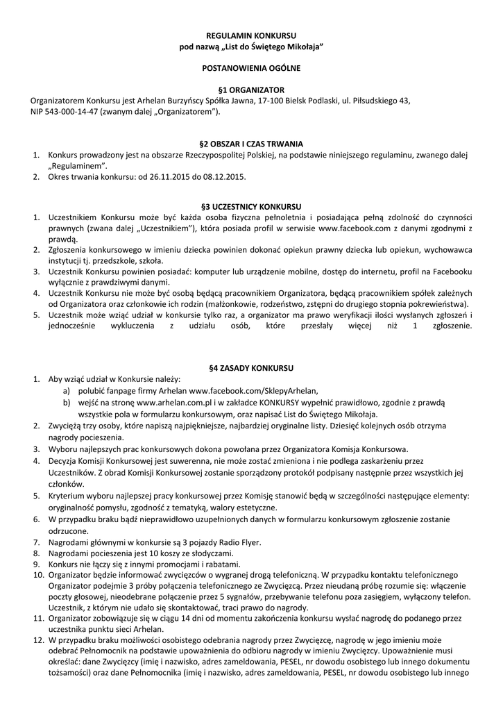 REGULAMIN KONKURSU pod nazwą „List do Świętego Mikołaja” POSTANOWIENIA OGÓLNE §1 ORGANIZATOR Organizatorem Konkursu jest Arhelan Burzyńscy Spółka Jawna, 17-100 Bielsk Podlaski, ul. Piłsudskiego 43, NIP 543-000-14-47 (zwanym dalej „Organizatorem”). §2 OBSZAR I CZAS TRWANIA 1. Konkurs prowadzony jest na obszarze Rzeczypospolitej Polskiej, na podstawie niniejszego regulaminu, zwanego dalej „Regulaminem”. 2. Okres trwania konkursu: od 26.11.2015 do 08.12.2015. §3 UCZESTNICY KONKURSU 1. Uczestnikiem Konkursu może być każda osoba fizyczna pełnoletnia i posiadająca pełną zdolność do czynności prawnych (zwana dalej „Uczestnikiem”), która posiada profil w serwisie www.facebook.com z danymi zgodnymi z prawdą. 2. Zgłoszenia konkursowego w imieniu dziecka powinien dokonać opiekun prawny dziecka lub opiekun, wychowawca instytucji tj. przedszkole, szkoła. 3. Uczestnik Konkursu powinien posiadać: komputer lub urządzenie mobilne, dostęp do internetu, profil na Facebooku wyłącznie z prawdziwymi danymi. 4. Uczestnik Konkursu nie może być osobą będącą pracownikiem Organizatora, będącą pracownikiem spółek zależnych od Organizatora oraz członkowie ich rodzin (małżonkowie, rodzeństwo, zstępni do drugiego stopnia pokrewieństwa). 5. Uczestnik może wziąć udział w konkursie tylko raz, a organizator ma prawo weryfikacji ilości wysłanych zgłoszeń i jednocześnie wykluczenia z udziału osób, które przesłały więcej niż 1 zgłoszenie. §4 ZASADY KONKURSU 1. Aby wziąć udział w Konkursie należy: a) polubić fanpage firmy Arhelan www.facebook.com/SklepyArhelan, b) wejść na stronę www.arhelan.com.pl i w zakładce KONKURSY wypełnić prawidłowo, zgodnie z prawdą wszystkie pola w formularzu konkursowym, oraz napisać List do Świętego Mikołaja. 2. Zwyciężą trzy osoby, które napiszą najpiękniejsze, najbardziej oryginalne listy. Dziesięć kolejnych osób otrzyma nagrody pocieszenia. 3. Wyboru najlepszych prac konkursowych dokona powołana przez Organizatora Komisja Konkursowa. 4. Decyzja Komisji Konkursowej jest suwerenna, nie może zostać zmieniona i nie podlega zaskarżeniu przez Uczestników. Z obrad Komisji Konkursowej zostanie sporządzony protokół podpisany następnie przez wszystkich jej członków. 5. Kryterium wyboru najlepszej pracy konkursowej przez Komisję stanowić będą w szczególności następujące elementy: oryginalność pomysłu, zgodność z tematyką, walory estetyczne. 6. W przypadku braku bądź nieprawidłowo uzupełnionych danych w formularzu konkursowym zgłoszenie zostanie odrzucone. 7. Nagrodami głównymi w konkursie są 3 pojazdy Radio Flyer. 8. Nagrodami pocieszenia jest 10 koszy ze słodyczami. 9. Konkurs nie łączy się z innymi promocjami i rabatami. 10. Organizator będzie informować zwycięzców o wygranej drogą telefoniczną. W przypadku kontaktu telefonicznego Organizator podejmie 3 próby połączenia telefonicznego ze Zwycięzcą. Przez nieudaną próbę rozumie się: włączenie poczty głosowej, nieodebrane połączenie przez 5 sygnałów, przebywanie telefonu poza zasięgiem, wyłączony telefon. Uczestnik, z którym nie udało się skontaktować, traci prawo do nagrody. 11. Organizator zobowiązuje się w ciągu 14 dni od momentu zakończenia konkursu wysłać nagrodę do podanego przez uczestnika punktu sieci Arhelan. 12. W przypadku braku możliwości osobistego odebrania nagrody przez Zwycięzcę, nagrodę w jego imieniu może odebrać Pełnomocnik na podstawie upoważnienia do odbioru nagrody w imieniu Zwycięzcy. Upoważnienie musi określać: dane Zwycięzcy (imię i nazwisko, adres zameldowania, PESEL, nr dowodu osobistego lub innego dokumentu tożsamości) oraz dane Pełnomocnika (imię i nazwisko, adres zameldowania, PESEL, nr dowodu osobistego lub innego dokumentu tożsamości). Pełnomocnik musi mieć ukończone 18 lat i wyrazić zgodę na wykorzystanie jego wizerunku we wszelkich materiałach dokumentujących przebieg konkursu. 13. Warunki wydania nagrody w wyznaczonym przez Organizatora terminie: a) stawienie się we wskazanym punkcie sieci Arhelan wraz z dokumentem tożsamości; b) posiadanie poprawnego upoważnienia zwycięzcy oraz kserokopię jego dowodu osobistego lub innego dokumentu tożsamości – jeżeli nagrodę odbiera Pełnomocnik. 1. 2. 3. 4. 5. 6. 7. 8. 9. 10. 11. 12. 13. 14. 15. 16. §5 POSTANOWIENIA KOŃCOWE Zwycięzcom nie przysługuje prawo do zastrzeżenia szczególnych właściwości nagrody ani do otrzymania jej ekwiwalentu (pieniężnego, rzeczowego). Organizator ma prawo do unieważnienia Konkursu w przypadku podejrzenia oszustwa oraz w każdym czasie bez podania przyczyny. Wszelkie reklamacje związane z przeprowadzeniem niniejszego Konkursu należy zgłaszać pisemnie na adres organizatora. Reklamacja będzie rozpatrywana w terminie 14 dni od dnia jej otrzymania. O decyzji dotyczącej reklamacji uczestnik zostanie poinformowany pisemnie na podany przez siebie adres. Decyzja organizatora w przedmiocie rozstrzygnięcia reklamacji jest ostateczna i wiążąca. Wiążące warunki Konkursu określone są w niniejszym regulaminie i wszelkie informacje o Konkursie podane w materiałach reklamowych i ulotkach mają jedynie charakter informacyjny. Organizator zastrzega sobie prawo do wprowadzania zmian w Regulaminie. Informacje o wprowadzeniu zmian w Regulaminie zostaną opublikowane na stronie www.arhelan.com.pl, oraz na fanpage-u Organizatora www.facebook.com/SklepyArhelan. Zmienione postanowienia obowiązują Uczestników od chwili ich opublikowania. Udział w Konkursie jest równoznaczny z akceptacją niniejszego regulaminu. Uczestnik przystępując do Konkursu oświadcza, że zapoznał się z pełną treścią Regulaminu, akceptuje wszystkie warunki Regulaminu oraz zapewnia, iż spełnia wszystkie niezbędne warunki uczestnictwa. Organizator nie bierze odpowiedzialności za błędy powstałe w druku. Wszelkie dodatkowe informacje o Konkursie mo