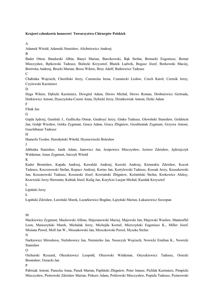Krajowi członkowie honorowi Towarzystwa Chirurgów Polskich A Adamek Witold, Adamski Stanisław, Alichniewicz Andrzej B Bader Otton, Bandurski Albin, Banyś Marian, Barcikowski, Bąk Stefan, Bernacki Eugeniusz, Bernat Mieczysław, Bętkowski Tadeusz, Bielecki Krzysztof, Błażek Ludwik, Bogusz Józef, Borkowski Maciej, Borówka Andrzej, Brocki Marian, Bross Wiktor, Broy Adolf, Butkiewicz Tadeusz C Chabinka Wojciech, Choróbski Jerzy, Czarnecka Irena, Czarniecki Lesław, Czech Karol, Czernik Jerzy, Czyżewski Kazimierz D Dega Wiktor, Dębicki Kazimierz, Dowgird Adam, Drews Michał, Drews Roman, Drobniewicz Gertruda, Dutkiewicz Antoni, Dyaczyńska-Czerni Anna, Dybicki Jerzy, Dziatkowiak Antoni, Dziki Adam F Fibak Jan G Gajda Jędrzej, Gasiński J., Gedliczka Otmar, Giedroyć Jerzy, Ginko Tadeusz, Głowiński Stanisław, Goldstein Jan, Gołąb Wiesław, Górka Zygmunt, Gruca Adam, Gruca Zbigniew, Grzebieniak Zygmunt, Grzywa Antoni, Guschibauer Tadeusz H Hamerla Teodor, Horodyński Witold, Hryniewiecki Bolesław J Jabłonka Stanisław, Janik Adam, Janowicz Jan, Jesipowicz Mieczysław, Jezioro Zdzisław, Jędrzejczyk Waldemar, Jonas Zygmunt, Jurczyk Witold K Kader Bronisław, Kapała Andrzej, Kawalski Andrzej, Kawski Andrzej, Kieturakis Zdzisław, Kocoń Tadeusz, Koczorowski Stefan, Kopacz Andrzej, Kortas Jan, Kortylewski Tadeusz, Kossak Jerzy, Kossakowski Jan, Koszarowski Tadeusz, Koszarski Józef, Kowiański Zbigniew, Koźmiński Stefan, Krokowicz Aleksy, Krzewicki Jerzy Hieronim, Kubiak Józef, Kulig Jan, Kurylcio Lucjan Michał, Kuzdak Krzysztof L Lipiński Jerzy Ł Łapiński Zdzisław, Ławiński Marek, Łazarkiewicz Bogdan, Łążyński Marian, Łukasiewicz Szczepan M Mackiewicz Zygmunt, Mackowski Alfons, Majeranowski Maciej, Majewski Jan, Majewski Wacław, Manteuffel Leon, Maruszyński Marek, Michalak Jerzy, Michejda Kornel, Mierczyński Eugeniusz K., Miller Józef, Misiuna Paweł, Moll Jan W., Mossakowski Jan, Mroczkowski Paweł, Myszka Stefan N Narkiewicz Mirosława, Nielubowicz Jan, Niemierko Jan, Noszczyk Wojciech, Nowicki Emilian K., Nowicki Stanisław O Oichurski Ryszard, Oleszkiewicz Leopold, Olszewski Waldemar, Onyszkiewicz Tadeusz, Osiecki Bronisław, Oszacki Jan P Pabisiak Antoni, Panecka Anna, Panek Marian, Papliński Zbigniew, Peter Janusz, Pichlak Kazimierz, Pimpicki Mieczysław, Piotrowski Zdzisław Marian, Piskorz Adam, Politowski Mieczysław, Popiela Tadeusz, Pożarowski Andrzej Piotr, Pruszyński Jan, Przedpełski Stefan, Puchalski Zbigniew R Rowiński Wojciech, Rudowski Witold, Rutkowski Jerzy, Rutkowski Maksymilian, Rybiński Kazimierz, Rzepecki Wit Maciej S Sadliński Czesław, Sawicki Bronisław, Schramm Hilary, Sierpiński Maciej, Sikorski Andrzej Wit, Sitkowski Wacław, Skokowski Jan, Skóra Kazimierz, Skubiszewski Feliks, Słowikowski Jan, Słowiński Krzysztof, Smolarek Franciszek, Smolarski Kazimierz, Sobański Aleksander, Sójka Stanisław, Sokołowski Tadeusz, Sołtysiak Adam, Stanowski Edward, Staszewski Wojciech, Stefanowski Marian, Szarecki Bolesław, Szczerbań Jerzy, Szczygieł Bruno, Szewczak Eugeniusz, Szmidt Jacek, Szostek Mieczysław, Szubiński Mirosław, Szwałkiewicz Mieczysław, Szybejko Jerzy, Szyszko Stanisław, Śledziński Zbigniew, Śliwiński Marian, Świca Stanisław T Tołłoczko Tadeusz, Tomaszewicz Wincenty, Trawiński Witold, Trojanowski Stanisław, Tukałło Konstanty, Tupikow Jerzy, Tylicki Mieczysław U Umiński Marek W Wajda Zdzisław, Wałaszewski Janusz, Wasiak Janusz, Wejroch Kazimierz, Wesołowski Stefan, Wiechowski Seweryn, Winter Stanisław, Witkiewicz Wojciech, Woźniewski Aleksy, Wróblewski Bogdan Z Zakryś Mieczysław, Zalewski Józef, Zapalski Stanisław, Zapędowski Jan, Zembrzuski Ludwik, Zieliński Stanisław Ż Żurek Zygfryd Zagraniczni członkowie honorowi Towarzystwa Chirurgów Polskich A Adams-Ray J. (Szwecja), Akiyama H. (Japonia), Allaines F. (Francja), Allgöwer M. (Szwajcaria), Amundsen E. (Norwegia) B Bakulew A. N. (Rosja), Balibrea J. (Hiszpania), Bauer Hartwig (Niemcy), Bengmark S. (Szwecja), Birt A.B. (Wielka Brytania), Björk V.O. (Szwecja), Boerema I. (Holandia), Borst H.G. (Niemcy), Bowes K. (Kanada), Bruce J. (Wielka Brytania), Buechler Marcus (Niemcy), Burakowskij W. J. (Rosja) C Campisi C. (Włochy), Crafoord C. (Szwecja), Crucitti F. (Włochy), Cushing H. (USA), Cuvelier J. (Belgia), Czudek S. (Czechy) D De Bakey M. (USA), Devlin H. B. (Wielka Brytania), Derra E. (RFN), Dralle Henning (Niemcy), Dudrick S. J. (USA) E Earlm R. J. (Wielka Brytania) F Fiodorow W. D. (Rosja), Fontaine R. (Francja), Fried Martin (USA) G Gall F. P. (Niemcy), Gloviczki Peter (USA), Greenhalgh R. (Wielka Brytania), Grözinger K. H. (Niemcy) H Hammer C. (Niemcy), Hardy Peter M. (USA), Harmon J. W. (USA), Hartig W. (Niemcy), Hartman H. (Francja), Hau T. (Niemcy), Hausemann B. (RFN), Herfarth C. (RFN), Hoffmeister H. E. (Niemcy), Horsch S. (RFN), Hortolomei N. (Rumunia), Huseman B. (Niemcy), Hausfeld E. (Dania) I Idezuki Y. (Japonia), Ihnse Ingmar (Szwecja) J Jaeck Daniel (Francja), Jakimowicz Jacek Jerzy (Holandia) K Kajiwara T. (Japonia), Karacsonyi S. (Węgry), Kern E. (Niemcy), Kirk R.M. (Wielka Brytania), Kitajima Masaki (Japonia), Kitagawa Yuko ( Japonia), Klinner W. (RFN), Kozuschek W. (Niemcy), Kuprijanow P. A. (Rosja), Kusano S. (Japonia) L Leger L. (Francja), Levitsky S. (USA), Lezoche E. (Włochy), Lie T. S. (Niemcy), Linder F. (RFN), Lippert Hans (Niemcy), Lucas S. (Francja) M Mackenzie W. C. (Kanada), Mai M. (Japonia), Malan E. (Włochy), Malinowski M. N. (Rosja), Mallet-Guy P. (Francja), Maruyama Keiichi (Japonia), Martin P. (Wielka Brytania), Matejicek E. (Czechosłowacja), Messmer K. (Niemcy), Meyer Joachim H. (Niemcy), Mito M. (Japonia), Montori Alberto (Włochy), Mosca Franco ( Włochy), Murley R. S. (Wielka Brytania) N Nauta J. (Holandia), Natali J. (Francja), Nicholls John Ralph (UK), Niegorowski W. A. (Rosja), Norwood W. I.(USA), Nowak S. J. G. (USA), Nuboer F. J. (Holandia), Nyhus L. M. (USA) O Ogawa K