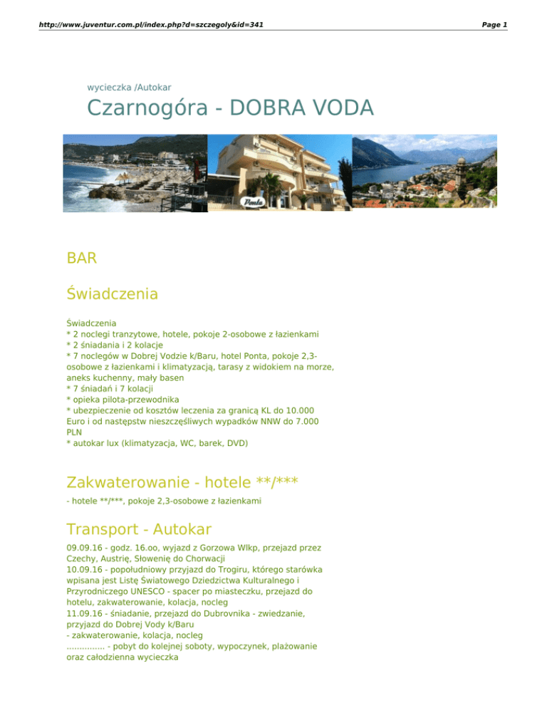 http://www.juventur.com.pl/index.php?d=szczegoly&id=341 wycieczka /Autokar Czarnogóra - DOBRA VODA BAR Świadczenia Świadczenia * 2 noclegi tranzytowe, hotele, pokoje 2-osobowe z łazienkami * 2 śniadania i 2 kolacje * 7 noclegów w Dobrej Vodzie k/Baru, hotel Ponta, pokoje 2,3osobowe z łazienkami i klimatyzacją, tarasy z widokiem na morze, aneks kuchenny, mały basen * 7 śniadań i 7 kolacji * opieka pilota-przewodnika * ubezpieczenie od kosztów leczenia za granicą KL do 10.000 Euro i od następstw nieszczęśliwych wypadków NNW do 7.000 PLN * autokar lux (klimatyzacja, WC, barek, DVD) Zakwaterowanie - hotele **/*** - hotele **/***, pokoje 2,3-osobowe z łazienkami Transport - Autokar 09.09.16 - godz. 16.oo, wyjazd z Gorzowa Wlkp, przejazd przez Czechy, Austrię, Słowenię do Chorwacji 10.09.16 - popołudniowy przyjazd do Trogiru, którego starówka wpisana jest Listę Światowego Dziedzictwa Kulturalnego i Przyrodniczego UNESCO - spacer po miasteczku, przejazd do hotelu, zakwaterowanie, kolacja, nocleg 11.09.16 - śniadanie, przejazd do Dubrovnika - zwiedzanie, przyjazd do Dobrej Vody k/Baru - zakwaterowanie, kolacja, nocleg ............... - pobyt do kolejnej soboty, wypoczynek, plażowanie oraz całodzienna wycieczka Page 1 http://www.juventur.com.pl/index.php?d=szczegoly&id=341 Page 2 - Montenegro Tour (w cenie imprezy) 18.09.16 - śniadanie, poranny wyjazd, zwiedzanie Mostaru, pobyt w Medjugorje, zakwaterowanie, kolacja, nocleg w Medjugorje 19.09.16 - śniadanie, wyjazd do kraju 20.09.16 - przyjazd do Gorzowa Wlkp w godzinach porannych Wycieczki fakultatywne UWAGA: 1. Cena nie zawiera kosztów biletów wstepu do zwiedzanych obiektów 2. Dopłata do zwiedzania Dubrownika - koszt wjazdu autokaru i przewodnik miejscowy na 4 godziny - ok. 13 euro/os. 3. Opłata klimatyczna i ubezpieczenie miejscowe - 1,30 euro/os./dzień nr grupy termin JUV19/16 09.09-20.09.16 1 690,- ZAREZERWUJ