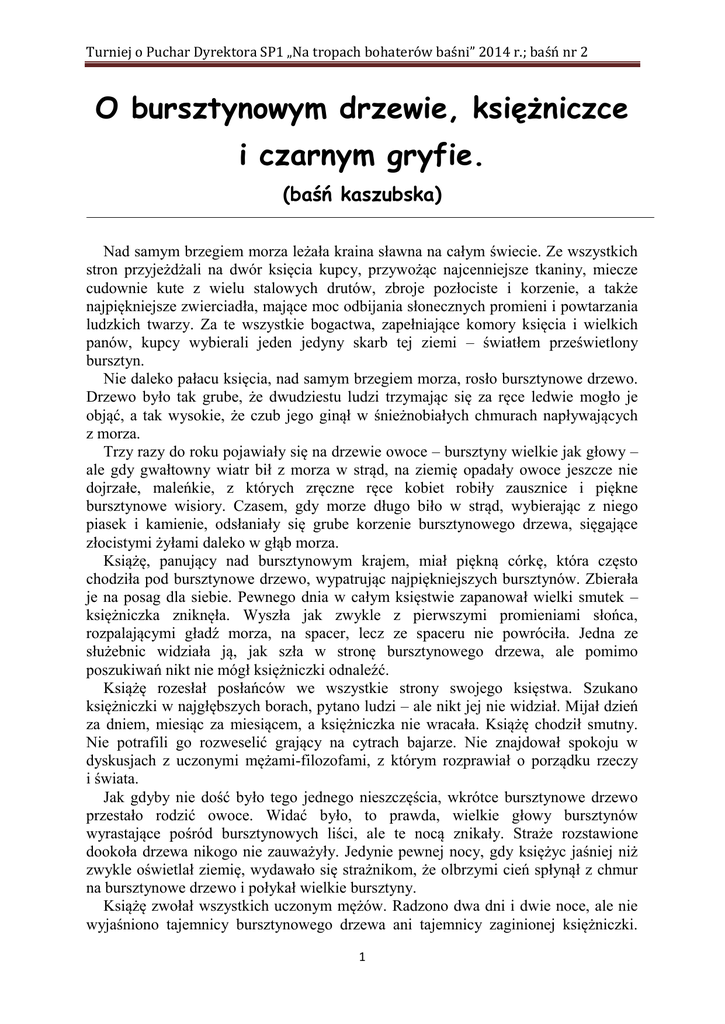 Turniej o Puchar Dyrektora SP1 „Na tropach bohaterów baśni” 2014 r.; baśń nr 2 O bursztynowym drzewie, księżniczce i czarnym gryfie. (baśń kaszubska) Nad samym brzegiem morza leżała kraina sławna na całym świecie. Ze wszystkich stron przyjeżdżali na dwór księcia kupcy, przywożąc najcenniejsze tkaniny, miecze cudownie kute z wielu stalowych drutów, zbroje pozłociste i korzenie, a także najpiękniejsze zwierciadła, mające moc odbijania słonecznych promieni i powtarzania ludzkich twarzy. Za te wszystkie bogactwa, zapełniające komory księcia i wielkich panów, kupcy wybierali jeden jedyny skarb tej ziemi – światłem prześwietlony bursztyn. Nie daleko pałacu księcia, nad samym brzegiem morza, rosło bursztynowe drzewo. Drzewo było tak grube, że dwudziestu ludzi trzymając się za ręce ledwie mogło je objąć, a tak wysokie, że czub jego ginął w śnieżnobiałych chmurach napływających z morza. Trzy razy do roku pojawiały się na drzewie owoce – bursztyny wielkie jak głowy – ale gdy gwałtowny wiatr bił z morza w strąd, na ziemię opadały owoce jeszcze nie dojrzałe, maleńkie, z których zręczne ręce kobiet robiły zausznice i piękne bursztynowe wisiory. Czasem, gdy morze długo biło w strąd, wybierając z niego piasek i kamienie, odsłaniały się grube korzenie bursztynowego drzewa, sięgające złocistymi żyłami daleko w głąb morza. Książę, panujący nad bursztynowym krajem, miał piękną córkę, która często chodziła pod bursztynowe drzewo, wypatrując najpiękniejszych bursztynów. Zbierała je na posag dla siebie. Pewnego dnia w całym księstwie zapanował wielki smutek – księżniczka zniknęła. Wyszła jak zwykle z pierwszymi promieniami słońca, rozpalającymi gładź morza, na spacer, lecz ze spaceru nie powróciła. Jedna ze służebnic widziała ją, jak szła w stronę bursztynowego drzewa, ale pomimo poszukiwań nikt nie mógł księżniczki odnaleźć. Książę rozesłał posłańców we wszystkie strony swojego księstwa. Szukano księżniczki w najgłębszych borach, pytano ludzi – ale nikt jej nie widział. Mijał dzień za dniem, miesiąc za miesiącem, a księżniczka nie wracała. Książę chodził smutny. Nie potrafili go rozweselić grający na cytrach bajarze. Nie znajdował spokoju w dyskusjach z uczonymi mężami-filozofami, z którym rozprawiał o porządku rzeczy i świata. Jak gdyby nie dość było tego jednego nieszczęścia, wkrótce bursztynowe drzewo przestało rodzić owoce. Widać było, to prawda, wielkie głowy bursztynów wyrastające pośród bursztynowych liści, ale te nocą znikały. Straże rozstawione dookoła drzewa nikogo nie zauważyły. Jedynie pewnej nocy, gdy księżyc jaśniej niż zwykle oświetlał ziemię, wydawało się strażnikom, że olbrzymi cień spłynął z chmur na bursztynowe drzewo i połykał wielkie bursztyny. Książę zwołał wszystkich uczonym mężów. Radzono dwa dni i dwie noce, ale nie wyjaśniono tajemnicy bursztynowego drzewa ani tajemnicy zaginionej księżniczki. 1 Turniej o Puchar Dyrektora SP1 „Na tropach bohaterów baśni” 2014 r.; baśń nr 2 W dwa dni później, w kancelarii księcia, do późnych godzin nocnych płonęły smolne żywice. Posłańcy księcia roznieśli listy po wszystkich ziemiach i odczytali je na rynkach miast. Książę odda swoje państwo temu, kto wyjaśni tajemnicę bursztynowego drzewa i odnajdzie księżniczkę. Ze wszystkich stron świata zaczęli przyjeżdżać rycerze. Przyjechał ten, który w dalekiej puszczy zabił smoka o siedmiu głowach i ognistym języku; także ten, który obłaskawił stado dzikich świń i ten, który tabun dzikich koni o złotych podkowach zaprowadził do królewskich stajen, a pomiędzy nimi wielu innych, słynących z męstwa i cnoty. Gdy wszyscy oni pytali księcia o to, gdzie jest wróg, gdzie jest ten, z którym trzeba walczyć – książę nie potrafił wskazać im przeciwnika. Rycerze czekali, czekali, mając nadzieję, że wróg sam się im pokaże, ale to się nie stało. - Nie możemy przecież walczyć z czymś, czego nie widać – mówił jeden do drugiego, i wkrótce rycerze zaczęli opuszczać pałac księcia. Książę został sam ze swymi sługami, a bursztyny znikały tak, jak znikały. Pewnego dnia do bram pałacu księcia zapukał marynarz, który dowiedział się w porcie, iż książę przeznaczył wielką nagrodę dla tego, kto odnajdzie księżniczkę i uwolni królestwo od złodzieja bursztynów. Książę przyjął marynarza godnie i opowiedział o tym, co zdarzyło się w księstwie. Marynarz wysłuchał księcia, a później poprosił, aby pozwolono mu stanąć przez trzy noce na warcie koło bursztynowego drzewa. I tak się stało. Gdy minęła trzecia noc, marynarz przyszedł do księcia prosząc, aby zabito największego wołu, a z jego skóry uszyto dla niego pięć mocnych kaftanów. Przez dwa dni i dwie noce szyto kaftany, aż wreszcie trzeciego dnia marynarz nałożywszy jeden kaftan na drugi wyruszył na niebezpieczną wyprawę. Wziął ze sobą linę plecioną z najlepszego jedwabnego włókna i wyrzuciwszy ją w górę, zaczepił na konarze bursztynowego drzewa. Dookoła zebrała się wielka gromada ludzi. Nie tylko książę z dworzanami, ale wszyscy słudzy i kupcy, którzy w tym czasie bawili na dworze księcia, byli świadkami wyprawy. Jeszcze przez chwilę było widać marynarza wspinającego się po linie, ale wkrótce zniknął pomiędzy bursztynowymi liśćmi i tyle go wszyscy widzieli. Marynarz tymczasem wspinał się coraz wyżej i wyżej, z gałęzi na gałąź, z konaru na konar, a te były coraz grubsze, coraz większe. Bursztynowe liście były tak wielkie jak łąka, jak oczka jezior – tylko z odległości, z ziemi wydawały się małe. Na bursztynowych liściach pasły się najprawdziwsze trzody, których pilnowali pasterze. Im wyżej się marynarz wspinał, tym więcej ich było. Pasterze pilnujący trzód mówil