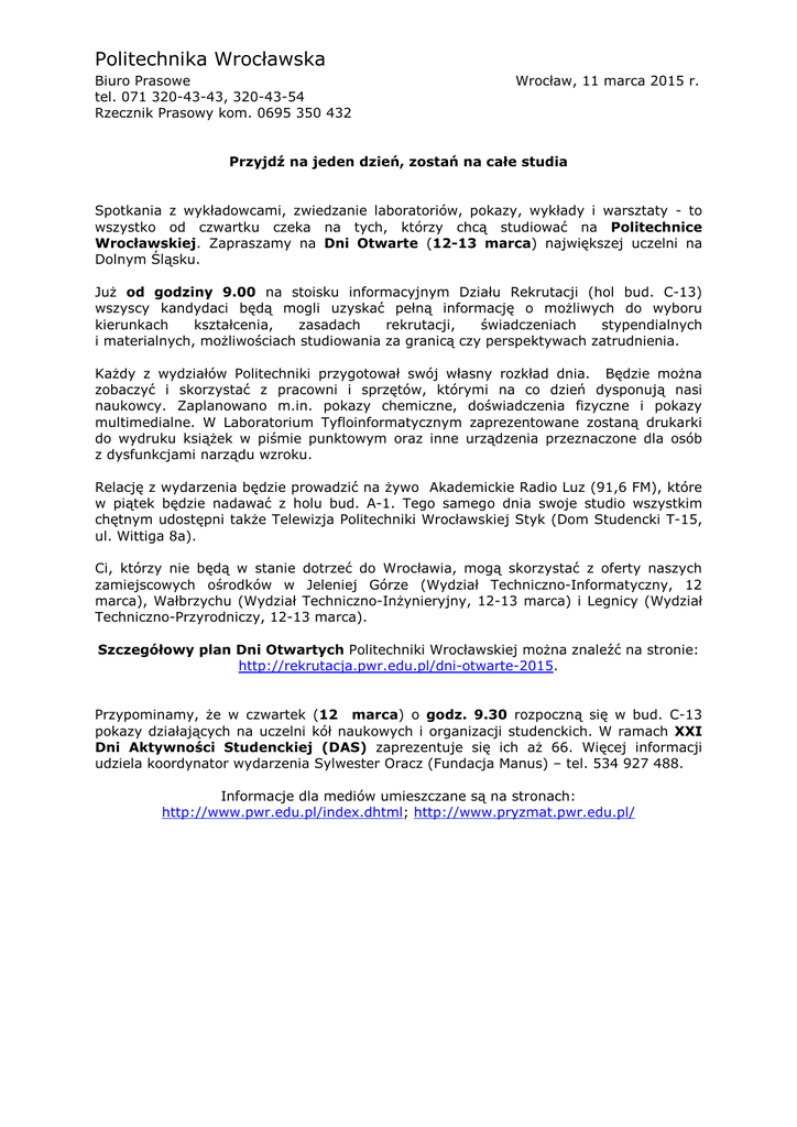 Politechnika Wrocławska Biuro Prasowe tel. 071 320-43-43, 320-43-54 Rzecznik Prasowy kom. 0695 350 432 Wrocław, 11 marca 2015 r. Przyjdź na jeden dzień, zostań na całe studia Spotkania z wykładowcami, zwiedzanie laboratoriów, pokazy, wykłady i warsztaty - to wszystko od czwartku czeka na tych, którzy chcą studiować na Politechnice Wrocławskiej. Zapraszamy na Dni Otwarte (12-13 marca) największej uczelni na Dolnym Śląsku. Już od godziny 9.00 na stoisku informacyjnym Działu Rekrutacji (hol bud. C-13) wszyscy kandydaci będą mogli uzyskać pełną informację o możliwych do wyboru kierunkach kształcenia, zasadach rekrutacji, świadczeniach stypendialnych i materialnych, możliwościach studiowania za granicą czy perspektywach zatrudnienia. Każdy z wydziałów Politechniki przygotował swój własny rozkład dnia. Będzie można zobaczyć i skorzystać z pracowni i sprzętów, którymi na co dzień dysponują nasi naukowcy. Zaplanowano m.in. pokazy chemiczne, doświadczenia fizyczne i pokazy multimedialne. W Laboratorium Tyfloinformatycznym zaprezentowane zostaną drukarki do wydruku książek w piśmie punktowym oraz inne urządzenia przeznaczone dla osób z dysfunkcjami narządu wzroku. Relację z wydarzenia będzie prowadzić na żywo Akademickie Radio Luz (91,6 FM), które w piątek będzie nadawać z holu bud. A-1. Tego samego dnia swoje studio wszystkim chętnym udostępni także Telewizja Politechniki Wrocławskiej Styk (Dom Studencki T-15, ul. Wittiga 8a). Ci, którzy nie będą w stanie dotrzeć do Wrocławia, mogą skorzystać z oferty naszych zamiejscowych ośrodków w Jeleniej Górze (Wydział Techniczno-Informatyczny, 12 marca), Wałbrzychu (Wydział Techniczno-Inżynieryjny, 12-13 marca) i Legnicy (Wydział Techniczno-Przyrodniczy, 12-13 marca). Szczegółowy plan Dni Otwartych Politechniki Wrocławskiej można znaleźć na stronie: http://rekrutacja.pwr.edu.pl/dni-otwarte-2015. Przypominamy, że w czwartek (12 marca) o godz. 9.30 rozpoczną się w bud. C-13 pokazy działających na uczelni kół naukowych i organizacji studenckich. W ramach XXI Dni Aktywności Studenckiej (DAS) zaprezentuje się ich aż 66. Więcej informacji udziela koordynator wydarzenia Sylwester Oracz (Fundacja Manus) – tel. 534 927 488. Informacje dla mediów umieszczane są na stronach: http://www.pwr.edu.pl/index.dhtml; http://www.pryzmat.pwr.edu.pl/