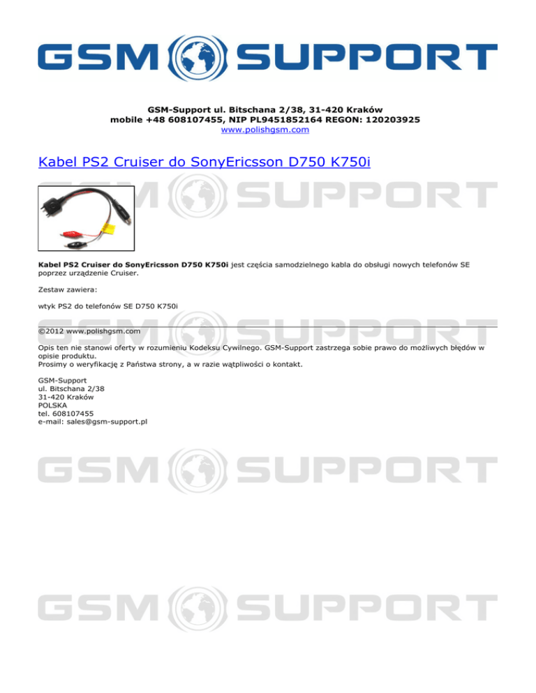 GSM-Support ul. Bitschana 2/38, 31-420 Kraków mobile +48 608107455, NIP PL9451852164 REGON: 120203925 www.polishgsm.com Kabel PS2 Cruiser do SonyEricsson D750 K750i Kabel PS2 Cruiser do SonyEricsson D750 K750i jest częścia samodzielnego kabla do obsługi nowych telefonów SE poprzez urządzenie Cruiser. Zestaw zawiera: wtyk PS2 do telefonów SE D750 K750i ©2012 www.polishgsm.com Opis ten nie stanowi oferty w rozumieniu Kodeksu Cywilnego. GSM-Support zastrzega sobie prawo do możliwych błędów w opisie produktu. Prosimy o weryfikację z Państwa strony, a w razie wątpliwości o kontakt. GSM-Support ul. Bitschana 2/38 31-420 Kraków POLSKA tel. 608107455 e-mail: [email protected] Powered by TCPDF (www.tcpdf.org)