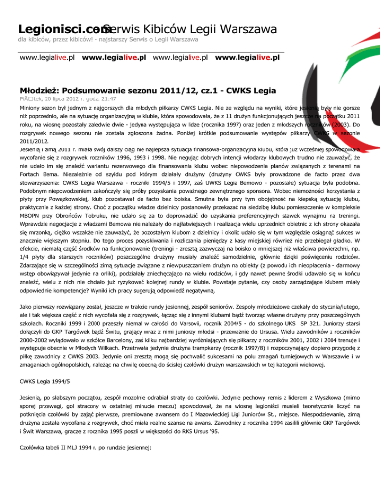Legionisci.com - Serwis Kibiców Legii Warszawa dla kibiców, przez kibiców! - najstarszy Serwis o Legii Warszawa www.legialive.pl www.legialive.pl www.legialive.pl www.legialive.pl Młodzież: Podsumowanie sezonu 2011/12, cz.1 - CWKS Legia PiÄ tek, 20 lipca 2012 r. godz. 21:47 Miniony sezon był jednym z najgorszych dla młodych piłkarzy CWKS Legia. Nie ze względu na wyniki, które jesienią były nie gorsze niż poprzednio, ale na sytuację organizacyjną w klubie, która spowodowała, że z 11 drużyn funkcjonujących jeszcze na początku 2011 roku, na wiosnę pozostały zaledwie dwie - jedyna występująca w lidze (rocznika 1997) oraz jeden z młodszych roczników (2003). Do rozgrywek nowego sezonu nie została zgłoszona żadna. Poniżej krótkie podsumowanie występów piłkarzy CWKS w sezonie 2011/2012. Jesienią i zimą 2011 r. miała swój dalszy ciąg nie najlepsza sytuacja finansowa-organizacyjna klubu, która już wcześniej spowodowała wycofanie się z rozgrywek roczników 1996, 1993 i 1998. Nie negując dobrych intencji włodarzy klubowych trudno nie zauważyć, że nie udało im się znaleźć wariantu rezerwowego dla finansowania klubu wobec niepowodzenia planów związanych z terenami na Fortach Bema. Niezależnie od szyldu pod którym działały drużyny (drużyny CWKS były prowadzone de facto przez dwa stowarzyszenia: CWKS Legia Warszawa - roczniki 1994/5 i 1997, zaś UWKS Legia Bemowo - pozostałe) sytuacja była podobna. Podobnym niepowodzeniem zakończyły się próby pozyskania poważnego zewnętrznego sponsora. Wobec niemożności korzystania z płyty przy Powązkowskiej, klub pozostawał de facto bez boiska. Smutna była przy tym obojętność na kiepską sytuację klubu, praktycznie z każdej strony. Choć z początku władze dzielnicy postanowiły przekazać na siedzibę klubu pomieszczenie w kompleksie MBOPN przy Obrońców Tobruku, nie udało się za to doprowadzić do uzyskania preferencyjnych stawek wynajmu na treningi. Wprawdzie negocjacje z władzami Bemowa nie należały do najłatwiejszych i realizacja wielu uprzednich obietnic z ich strony okazała się mrzonką, ciężko wszakże nie zauważyć, że pozostałym klubom z dzielnicy i okolic udało się w tym względzie osiągnąć sukces w znacznie większym stopniu. Do tego proces pozyskiwania i rozliczania pieniędzy z kasy miejskiej również nie przebiegał gładko. W efekcie, niemałą część środków na funkcjonowanie (treningi - zresztą zazwyczaj na boisko o mniejszej niż właściwa powierzchni, np. 1/4 płyty dla starszych roczników) poszczególne drużyny musiały znaleźć samodzielnie, głównie dzięki poświęceniu rodziców. Zdarzające się w szczególności zimą sytuacje związane z niewpuszczaniem drużyn na obiekty (z powodu ich nieopłacenia - darmowy wstęp obowiązywał jedynie na orliki), podziałały zniechęcająco na wielu rodziców, i gdy nawet pewne środki udawało się w końcu znaleźć, wielu z nich nie chciało już ryzykować kolejnej rundy w klubie. Powstaje pytanie, czy osoby zarządzające klubem miały odpowiednie kompetencje? Wyniki ich pracy sugerują odpowiedź negatywną. Jako pierwszy rozwiązany został, jeszcze w trakcie rundy jesiennej, zespół seniorów. Zespoły młodzieżowe czekały do stycznia/lutego, ale i tak większa część z nich wycofała się z rozgrywek, łącząc się z innymi klubami bądź tworząc własne drużyny przy poszczególnych szkołach. Roczniki 1999 i 2000 przeszły niemal w całości do Varsovii, rocznik 2004/5 - do szkolnego UKS SP 321. Juniorzy starsi dołączyli do GKP Targówek bądź Świtu, grający wraz z nimi juniorzy młodsi - przeważnie do Ursusa. Wielu zawodników z roczników 2000-2002 wylądowało w szkółce Barcelony, zaś kilku najbardziej wyróżniających się piłkarzy z roczników 2001, 2002 i 2004 trenuje i występuje obecnie w Młodych Wilkach. Przetrwała jedynie drużyna trampkarzy (rocznik 1997/8) i rozpoczynający dopiero przygodę z piłkę zawodnicy z CWKS 2003. Jedynie oni zresztą mogą się pochwalić sukcesami na polu zmagań turniejowych w Warszawie i w zmaganiach ogólnopolskich, należąc na chwilę obecną do ścisłej czołówki drużyn warszawskich w tej kategorii wiekowej. CWKS Legia 1994/5 Jesienią, po słabszym początku, zespół mozolnie odrabiał straty do czołówki. Jedynie pechowy remis z liderem z Wyszkowa (mimo sporej przewagi, gol stracony w ostatniej minucie meczu) spowodował, że na wiosnę legioniści musieli teoretycznie liczyć na potknięcia czołówki by zająć pierwsze, premiowane awansem do I Mazowieckiej Ligi Juniorów St., miejsce. Niespodziewanie, zimą drużyna została wycofana z rozgrywek, choć miała realne szanse na awans. Zawodnicy z rocznika 1994 zasilili głównie GKP Targówek i Świt Warszawa, gracze z rocznika 1995 poszli w większości do RKS Ursus '95. Czołówka tabeli II MLJ 1994 r. po rundzie jesiennej: 1. Bug Wyszków* 10 26 2. Świt Warszawa 10 22 3. CWKS Legia Warszawa* 10 20 4. Nadnarwianka Pułtusk 10 17 5. Champion Pionki 10 16 6. Orkan Sochaczew 10 14 * - drużyna wycofana z ligi w przerwie zimowej Do I ligi awansuje zwycięzca ligi, do baraży o II ligę wchodzą drużyny z miejsc 2-6. Bilans 10 meczów: 6 zwycięstw, 2 remisy, 2 porażki [Nadnarwianka, Champion]; Bramki: 29-16 Skład w rundzie jesiennej: Bramkarze: Dariusz Przysowa (1994), Patryk Kowalski (1994), Adam Dobiesz (1995) Obrońcy: Adrian Orlik (1994), Mariusz Pec (1994), Emil Rogowski (1994), Bartłomiej Błesnowski (1994), Piotr Dąbrowski (1994), Michał Stróżecki (1994), Adam Jaworek (1995), Jakub Przygoda (1995), Paweł Nowakowski (1995) Pomocnicy: Piotr Papież (1994), Maciej Ćwiąkała (1994), Robert Terlecki (1994), Krystian Kopeć (1994), Patryk Lipiński (1995), Kacper Puza (1995), Kamil Bielecki (1995), Adrian Olszak (1995), Adam Słowik (1995) Napastnicy: Kacper Bożałek (1994), Karol Kubicki (1995) Gole: Słowik 10, Bożałek 4, Ćwiąkała 4, Papie