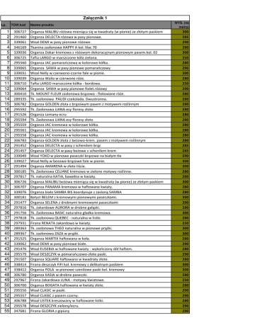 Załącznik 1 Lp. 1 2 3 4 5 6 7 8 9 10 11 12 13 14 15 16 17 18 19 20 21 22 23 24 25 26 27 28 29 30 31 32 33 34 35 36 37 38 39 40 41 42 43 44 45 46 47 48 49 50 51 52 53 54 55 TOW.kod 306727 291460 339061 346169 339036 306725 295560 339065 339031 339039 306710 339064 300410 289335 306782 295592 291526 295594 295559 295561 295558 306783 291452 291457 339049 339027 291494 300185 297817 306726 306707 339076 300181 291477 297816 291756 297818 297931 289363 289367 291525 339062 291476 295579 291507 338414 338412 306780 297967 306700 295556 295557 306788 295578 347681 Nazwa prouktu Organza MALIBU różowa mieniąca się w kwadraty (w pionie) ze złotym paskiem Organza DELECTA różowa w pasy pionowe. Woal DEMI w pasy pionowe różowe. Tkanina zasłonowa HAPPY A kol. lilac 70 Organza Dakar kremowa z różowym dekoracyjnym pionowym pasem.kol. 02 Tafta LARGO w marszczone kóła zielona. Organza JAC pomarańczowa w kolorowe kółka. Organza SAWA w pasy pionowe pomarańczowy Woal Nelly w czerwono-czarne fale w pionie. Organza Walia w czerwone róże. Tafta LARGO marszczone kółka - bordowa. Organza SAWA w pasy pionowe fiolet.różowy Tk. MOUNT FLEUR zasłonowa brązowa - flokowane róże. Tk. zasłonowa PAUDI czekolada. Dwustronna. Organza GOLDEN złota z brązowym pasem z motywem roślinnym Tk. Zasłonowa LIANA esy floresy złoto Organza Lemany ecru Tk. Zasłonowa LIANA esy floresy złoto Organza JAC kremowa w kolorowe kółka. Organza JAC kremowa w kolorowe kółka. Organza JAC kremowa w kolorowe kółka. Organza GOLDEN złota z beżowo-krem. pasem z motywem roślinnym Organza DELECTA w pasy z schenilem brąz Organza DELECTA w pasy beżowe z schenilem krem Woal YOKO w pionowe paseczki brązowe na białym tle Woal Nelly w bezowo-brązowe fale w pionie. Organza AMARENA w złote liście. Tk. Zasłonowa CELIANE kremowa w zielone motywy roślinne. Tk. naturalna KATIA, bawełna w kwiaty. Organza MALIBU beżowa mieniąca się w kwadraty (w pionie) ze złotym paskiem Organza PANAMA kremowa w haftowane kwiaty. Organza biała SAMBA BIS koordynuje z zasloną SAMBA Batyst BELEM z kremowymi pionowymi paseczkami. Organza SELENA z drobnymi kremowymi paseczkami Tk. żakardowe AURORA w drobne gałązki. Tk. Zasłonowa BASIC naturalna gładka kremowa. Tk. zasłonowa QUEBEC - naturalna w listki. Firana RENATA żakardowa w kwiaty. Tk. zasłonowa THEO naturalna w pionowe prążki. Tk. zasłonowa ZAZA w prążki. Organza MARTIX haftowana w koła. Woal DEMI w pasy pionowe białe. Woal EUSEBIA w haftowane kwiaty - wykończony dół haftem. Woal DESZCZYK w pomarańczowo-złote paski. Organza SQUARE haftowana w kwadraty złote. Firana deszczyk FIFI kol. kremowy z delikatnym paskiem Organza POLA w pionowe szenilowe paski kol. kremowy Organza KASIA w drobne paseczki. Firana żakardowa LUNA - motywy kwiatowe. Organza BOGATA haftowana w kwiaty złote. Woal CLASIC w paski. Woal CLASIC z pasem czarny. Woal LISTEK kreszowany w haftowane listki. Woal DESZCZYK zielony/ecru. Firana GLORIA z gipiurą WYS. (na metry) 300 285 290 280 300 250 280 290 300 280 250 290 280 280 280 280 280 280 280 280 280 280 285 285 290 300 300 280 280 300 280 280 300 290 280 300 280 250 300 300 280 290 280 290 280 300 300 280 250 280 290 290 280 290 290 56 57 58 59 60 61 62 63 64 65 66 67 68 69 70 71 72 73 74 75 76 77 78 79 80 81 82 83 84 85 86 87 88 89 90 91 92 93 94 95 96 97 98 99 100 299879 295580 299874 289294 299875 299882 289242 291698 291696 289290 289197 299997 299985 289194 306793 291510 299881 299877 299876 299987 306792 338415 291732 291676 297965 291695 339082 291604 299986 299878 339085 297974 297972 297925 291623 297969 297985 291506 289364 295555 291602 338413 338411 347682 295576 Woal SZENIL z paskiem szenilowym beżowym. Woal DESZCZYK brąz/ecru Woal BERNARD w pionowe grube pasy kremowo-białe Woal BILI gładki biały w prążki pomar/brąz. Woal BERNARD w pionowe grube pasy brązowo-czarne Woal SZENIL z paskiem szenilowym fioletowym. Woal LILA biały z paskiem pionowym fioletowym Firana żakardowa SAMANTA Dmuchawiec. Firana żakardowa SAMANTA w kwiaty. Woal LILA biały z paskiem pionowym żółtym. Woal LILA biały z paskiem pionowym zielonym. Woal LUDWIK w pionowe zielone pasy z motywem liściastym Siatka MAXI z szenilowymi paskami. Woal BILI gładki biały w prążki zielono beżowe. Woal CLASIC z fioletowym zawijasem. Organza Nina biel Woal SZENIL z paskiem szenilowym czerwonym. Woal BERNARD w pionowe grube pasy fioletowo-różowe Woal BERNARD w pionowe grube pasy czerwono-czarne Siatka MAXI z szenilowymi paskami. Woal CLASIC z aplikacja zwijas. Woal FALA w pionowe fale (beżowo-brązowe). Firana żakardowa Anna z dolnym pasem. Firana RENATA żakardowa w tulipany. Firana RENATA żakardowa w koła. Firana żakardowa ROXI. Organza biała KORA w haftowane drzewka - wykończona dołem. Firana RENATA żakardowa w kwiatowe wzory. Siatka MAXI z szenilowymi paskami. Woal SZENIL z paskiem szenilowym kremowym. Woal/siatka PRESTIGE - siateczka z wykończeniem gipiurowym Firana RENATA żakardowa w kwiatowe wzory. Firana żakardowa LUNA w kwiatowe wzory. Firana RENATA żakardowa w kwiatowe wzory. Firana żakardowa JULIA z zawijasami. Firana żakardowa LUNA w kwiatowe wzory. Firana żakardowa ROBERT w kwadraty. Organza SQUARE haftowana w kwadraty. Tk. załonowa THEO z prążkami - kremowa. Woal CLASIC z pasem krem Organza JANE krem z aplikacja kwiaty Firana deszczyk FIFI kol. biały z delikatnym paskiem Organza POLA w pionowe szenilowe paski kol. biały Firana VIKI z gipiurą Woal DESZCZYK srebrny. 300 290 280 260 280 300 260 250 250 260 260 280 300 260 300 300 300 280 280 300 300 300 250 250 250 250 280 250 300 300 280 250 250 250 250 250 250 280 300 290 280 300 300 280 290