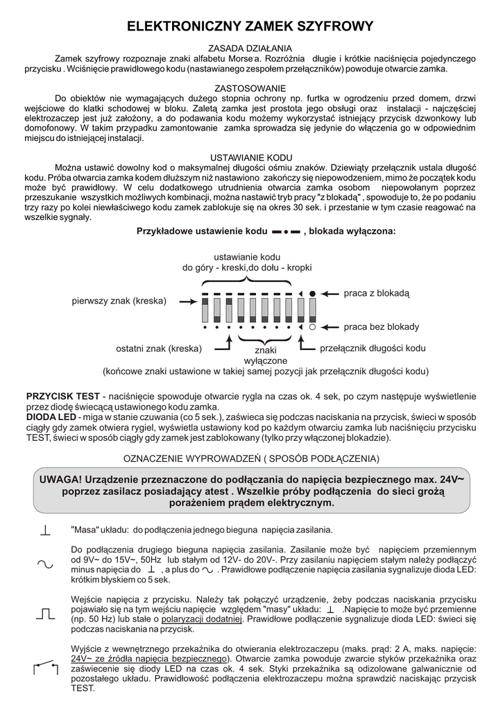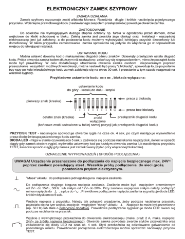 ELEKTRONICZNY ZAMEK SZYFROWY ZASADA DZIA£ANIA Zamek szyfrowy rozpoznaje znaki alfabetu Morse,a. Rozró¿nia d³ugie i krótkie naciœniêcia pojedynczego przycisku . Wciœniêcie prawid³owego kodu (nastawianego zespo³em prze³¹czników) powoduje otwarcie zamka. ZASTOSOWANIE Do obiektów nie wymagaj¹cych du¿ego stopnia ochrony np. furtka w ogrodzeniu przed domem, drzwi wejœciowe do klatki schodowej w bloku. Zalet¹ zamka jest prostota jego obs³ugi oraz instalacji - najczêœciej elektrozaczep jest ju¿ za³o¿ony, a do podawania kodu mo¿emy wykorzystaæ istniej¹cy przycisk dzwonkowy lub domofonowy. W takim przypadku zamontowanie zamka sprowadza siê jedynie do w³¹czenia go w odpowiednim miejscu do istniej¹cej instalacji. USTAWIANIE KODU Mo¿na ustawiæ dowolny kod o maksymalnej d³ugoœci oœmiu znaków. Dziewi¹ty prze³¹cznik ustala d³ugoœæ kodu. Próba otwarcia zamka kodem d³u¿szym ni¿ nastawiono zakoñczy siê niepowodzeniem, mimo ¿e pocz¹tek kodu mo¿e byæ prawid³owy. W celu dodatkowego utrudnienia otwarcia zamka osobom niepowo³anym poprzez przeszukanie wszystkich mo¿liwych kombinacji, mo¿na nastawiæ tryb pracy "z blokad¹" , spowoduje to, ¿e po podaniu trzy razy po kolei niew³aœciwego kodu zamek zablokuje siê na okres 30 sek. i przestanie w tym czasie reagowaæ na wszelkie sygna³y. Przyk³adowe ustawienie kodu , blokada wy³¹czona: ustawianie kodu do góry - kreski,do do³u - kropki pierwszy znak (kreska) praca z blokad¹ praca bez blokady prze³¹cznik d³ugoœci kodu znaki wy³¹czone (koñcowe znaki ustawione w takiej samej pozycji jak prze³¹cznik d³ugoœci kodu) ostatni znak (kreska) PRZYCISK TEST - naciœniêcie spowoduje otwarcie rygla na czas ok. 4 sek, po czym nastêpuje wyœwietlenie przez diodê œwiec¹c¹ ustawionego kodu zamka. DIODA LED - miga w stanie czuwania (co 5 sek.), zaœwieca siê podczas naciskania na przycisk, œwieci w sposób ci¹g³y gdy zamek otwiera rygiel, wyœwietla ustawiony kod po ka¿dym otwarciu zamka lub naciœniêciu przycisku TEST, œwieci w sposób ci¹g³y gdy zamek jest zablokowany (tylko przy w³¹czonej blokadzie). OZNACZENIE WYPROWADZEÑ ( SPOSÓB POD£¥CZENIA) UWAGA! Urz¹dzenie przeznaczone do pod³¹czania do napiêcia bezpiecznego max. 24V~ poprzez zasilacz posiadaj¹cy atest . Wszelkie próby pod³¹czenia do sieci gro¿¹ pora¿eniem pr¹dem elektrycznym. "Masa" uk³adu: do pod³¹czenia jednego bieguna napiêcia zasilania. Do pod³¹czenia drugiego bieguna napiêcia zasilania. Zasilanie mo¿e byæ napiêciem przemiennym od 9V~ do 15V~, 50Hz lub sta³ym od 12V- do 20V-. Przy zasilaniu napiêciem sta³ym nale¿y pod³¹czyæ minus napiêcia do , a plus do . Prawid³owe pod³¹czenie napiêcia zasilania sygnalizuje dioda LED: krótkim b³yskiem co 5 sek. Wejœcie napiêcia z przycisku. Nale¿y tak po³¹czyæ urz¹dzenie, ¿eby podczas naciskania przycisku pojawia³o siê na tym wejœciu napiêcie wzglêdem "masy" uk³adu: .Napiêcie to mo¿e byæ przemienne (np. 50 Hz) lub sta³e o polaryzacji dodatniej. Prawid³owe pod³¹czenie sygnalizuje dioda LED: œwieci siê podczas naciskania na przycisk. Wyjœcie z wewnêtrznego przekaŸnika do otwierania elektrozaczepu (maks. pr¹d: 2 A, maks. napiêcie: 24V~ ze Ÿród³a napiêcia bezpiecznego). Otwarcie zamka powoduje zwarcie styków przekaŸnika oraz zaœwiecenie siê diody LED na czas ok. 4 sek. Styki przekaŸnika s¹ odizolowane galwanicznie od pozosta³ego uk³adu. Prawid³owoœæ pod³¹czenia elektrozaczepu mo¿na sprawdziæ naciskaj¹c przycisk TEST.