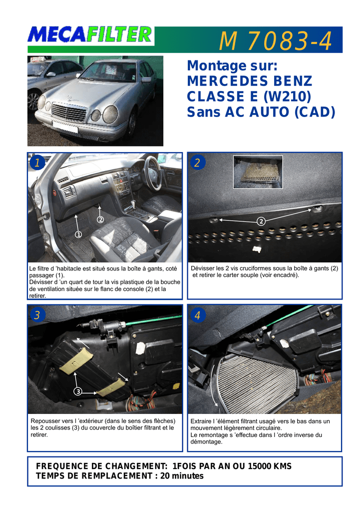 M 7083-4 Montage sur: MERCEDES BENZ CLASSE E (W210) Sans AC AUTO (CAD) 2 1 2 2 1 Le filtre d ’habitacle est situé sous la boîte à gants, coté passager (1). Dévisser d ’un quart de tour la vis plastique de la bouche de ventilation située sur le flanc de console (2) et la retirer. 3 Dévisser les 2 vis cruciformes sous la boîte à gants (2) et retirer le carter souple (voir encadré). 4 3 Repousser vers l ’extérieur (dans le sens des flèches) les 2 coulisses (3) du couvercle du boîtier filtrant et le retirer. Extraire l ’élément filtrant usagé vers le bas dans un mouvement légèrement circulaire. Le remontage s ’effectue dans l ’ordre inverse du démontage. FREQUENCE DE CHANGEMENT: 1FOIS PAR AN OU 15000 KMS TEMPS DE REMPLACEMENT : 20 minutes