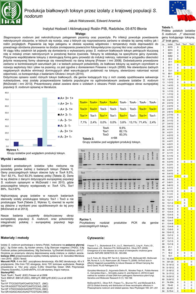 Produkcja białkowych toksyn przez izolaty z krajowej populacji S. nodorum Jakub Walczewski, Edward Arseniuk Instytut Hodowli I Aklimatyzacji Roślin PIB, Radzików, 05-870 Błonie Wstęp: Stagonospora nodorum jest nekrotroficznym patogenem pszenicy oraz pszenżyta. Po infekcji powoduje powstawanie nekrotycznych obszarów, w których się rozwija, oraz z których się rozprzestrzenia zarówno w obrębie tej samej rośliny jak i roślin przyległych. Pojawienie się tego patogenu w okresie wysokiej wilgotności i temperatury może doprowadzić do poważnego obniżenia plonowania na drodze zmniejszenia powierzchni fotosyntetycznie czynnej liści oraz uszkodzeń plew. W ciągu kilku ostatnich lat pojawiły się doniesienia o wytwarzaniu przez S. nodorum białkowych toksyn pełniących kluczową rolę w indukcji zmian nekrotycznych w porażonej tkance żywiciela. Toksyny te oddziałują na specyficzne geny żywiciela. Pozytywne współdziałanie toksyny z dominującą formą genu prowadzi do indukcji nekrozy, natomiast w przypadku obecności jedynie recesywnej formy obserwuje się niewrażliwość na daną toksynę [Friesen i inni 2008]. Doświadczenia prowadzone zarówno w kontrolowanych warunkach jak i w testach polowych potwierdziły, że białkowe toksyny są ważnym czynnikiem w rozwoju septoriozy liści i plew na pszenicy, co jest zgodne z doniesieniem Friesena i innych (2009). Nie stwierdzono żadnych negatywnych skutków eliminacji dominujących alleli warunkujących podatność na toksyny, stwierdzono natomiast wzrost odporności, co koresponduje z badaniami Oliviera i innych (2014). Dotychczas opisano sześć różnych toksyn białkowych, dla genów kodujących trzy z nich zostały opublikowane sekwencje nukleotydowe, oraz zostały przeprowadzone badania populacyjne na ogólnoświatowym zestawie izolatów S. nodorum [McDonald i inni 2013]. Prezentowany plakat zawiera dane o izolatach z obszaru Polski uzupełniające obraz europejskiej populacji S. nodorum opisanej w literaturze. 80,0 70,0 A+ 3+ 1+ A+ 3+ 1- ToxA+ ToxA+ ToxA+ ToxA+ ToxA- ToxA- ToxA- ToxA- A+ 3- 1+ Tox3+ Tox3+ Tox3- Tox3- Tox3- Tox3- Tox3+ Tox3+ A+ 3- 1- Tox1+ Tox1- Tox1+ Tox1- Tox1+ Tox1- Tox1+ Tox1- 7,1% 2,4% 0,0% 0,0% 3,6% 13,1% 71,4% 2,4% 60,0 50,0 40,0 30,0 20,0 A- 3- 1+ A- 3- 1- ToxA Tox1 Tox3 A- 3+ 1+ A- 3+ 1- 10,0 9,5% 82,1% 83,3% n=84 Tabela 2. Grupy izolatów pod względem produkcji toksyn. 0,0 Wykres 1. Grupy izolatów pod względem produkcji toksyn. Wyniki i wnioski: Spośród przebadanych izolatów tylko nieliczne nie posiadały genów żadnej z badanych toksyn [Tabela 1]. Geny poszczególnych toksyn obecne były w ToxA 9,5%, Tox1 82,1%, Tox3 83,3% badanej próby [Tabela 2]. Dane te są zbieżne z danymi dotyczącymi europejskiej populacji S. nodorum opisanymi w McDonald i inni 2013, gdzie poszczególne toksyny występowały w: ToxA 12%, Tox1 89%, Tox3 67%. Najliczniejszą grupę izolatów w naszych badaniach stanowiły izolaty produkujące toksyny Tox1 i Tox3 a nie produkujące ToxA [Tabela 2, Wykres 1], również te wyniki są zbieżne z wynikami prac opublikowanych do tej pory [McDonald et al 2013]. Nasze badania uzupełniły dotychczasowy obraz europejskiej populacji S. nodorum, oraz potwierdziły integralność polskiej i europejskiej populacji tego patogenu. Rycina 1. Przykładowy rozdział poszczególnych toksyn. Materiały i metody Izolaty S. nodorum pochodzące z terenu Polski, hodowane na pożywce płynnej [g/L] : 3g Octan sodu, 5g Azotan amonu, 0,5g Siarczan magnezu (7H2O), 3,9g Fosforan potasu jednozasadowy, 30g Sacharoza, 1g Ekstrakt drożdżowy. pH 5,7. Grzybnia po przemyciu steryną dejonizowaną wodą mielona w ciekłym azocie. Izolacja DNA przeprowadzana szybką metodą opisaną w D. González-Mendoza i inni 2010. (SDS i fenol) Warunki PCR. 4 min 96C początkowa denaturacja, 45s 96C denaturacja, 40 s X przyłączanie, 35s-1min 72C elongacja, 4min 72C końcowe wydłużanie. Reakcje prowadzone w 10ul przy użyciu 0.25U DreamTaq Green DNA Polymerase (Thermo Scientific), 0.2mM dNTPs, 0.5 uM startery, 5ng/ul matryca. StarteryPRC: ToxA: ToxA1, ToxA2 (63C) Friesen et al 2006 Tox3: 8981cF, 8981cR (55C), 8981g1F, 8981g1R (63C) Liu et all 2009 Tox1: Tox11F TTCCGGTGATCAATGCTGCT, (58C) Tox11R AGGGTTGCAGTCAATCCCAG, (58C) Tox12F CTGCCGAGCAAGTATTTCCG, (58C) Tox12R AGAGCAGCAGAGTTCGTGAG (58C) produktów PCR dla genów Cytowania: Friesen T. L., Stukenbrock E.H., Liu Z., Meinhardt S., Ling H., Faris J.D., Rasmussen J.B., Solomon P.S, McDonald B.A., Oliver R.P. (2006) Emergence of a new disease as a result of interspecific virulence gene transfer NATURE GENETICS 38:. 593-956 Liu Z, Faris JD, Oliver RP, Tan K-C, Solomon PS, McDonald MC, McDonald BA, Nunez A, Lu S, Rasmussen JB, Friesen TL (2009). SnTox3 acts in effector triggered susceptibility to induce Disease on Wheat Carrying the Snn3 Gene. PLoS Pathogens 5:9 González-Mendoza D., Argumedo-Delira R., Morales-Trejo A., Pulido-Herrera A., Cervantes-Díaz L., Grimaldo-Juarez O. and Alarcón A. (2010) A rapid method for isolation of total DNA from pathogenic filamentous plant fungi. Genetics and Molecular Research 9 (1): 162-166 McDonald M.C., Oliver R.P., Friesen T.L., Brunner P.C. and McDonald B.A. (2013) Global diversity and distribution of three necrotrophic effectors in Phaeosphaeria nodorum and related species. New Phytologist 199: 241–251 Tabela 1. Próbka polskich izolatów S. nodorum. „1” obecność genu kodującego toksynę, „0” brak genu. Lp. 1 2 3 4 5 6 7 8 9 10 11 12 13 14 15 16 17 18 19 20 21 22 23 24 25 26 27 28 29 30 31 32 33 34 35 36 37 38 39 40 41 42 43 44 45 46 47 48 49 50 51 52 53 54 55 56 57 58 59 60 61 62 63 64 65 66 67 68 69 70 71 72 73 74 75 76 77 78 79 80 81 82 83 84 Izolat ToxA 9079 0 9074 0 9281 0 9282 0 30-2 0 37-1 1 54-1 0 57-1 0 73-1 0 80-1 1 81-1 0 1-2/10 0 1-3/12 0 1-4/10 0 1-4/12 0 1-7/10 0 1-7/12 0 2-1/10 0 2-2/12 0 2-3/12 0 2-4/12 0 2-5/11 0 2-6/12 1 2-7/10 0 2-7/12 0 3-1/12 0 3-4/12 0 3-5/12 0 4-1/11 0 4-2/11 0 4-
