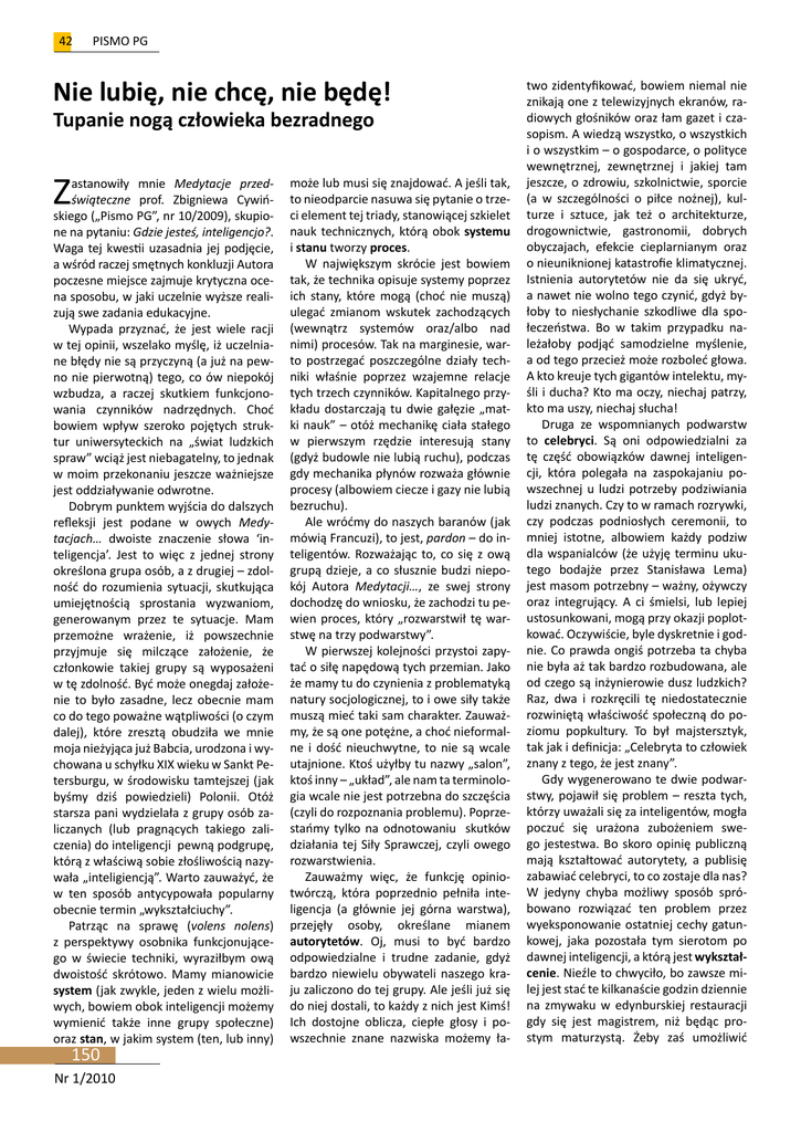 42 PISMO PG Nie lubię, nie chcę, nie będę! Tupanie nogą człowieka bezradnego Z astanowiły mnie Medytacje przedświąteczne prof. Zbigniewa Cywińskiego („Pismo PG”, nr 10/2009), skupione na pytaniu: Gdzie jesteś, inteligencjo?. Waga tej kwestii uzasadnia jej podjęcie, a wśród raczej smętnych konkluzji Autora poczesne miejsce zajmuje krytyczna ocena sposobu, w jaki uczelnie wyższe realizują swe zadania edukacyjne. Wypada przyznać, że jest wiele racji w tej opinii, wszelako myślę, iż uczelniane błędy nie są przyczyną (a już na pewno nie pierwotną) tego, co ów niepokój wzbudza, a raczej skutkiem funkcjonowania czynników nadrzędnych. Choć bowiem wpływ szeroko pojętych struktur uniwersyteckich na „świat ludzkich spraw” wciąż jest niebagatelny, to jednak w moim przekonaniu jeszcze ważniejsze jest oddziaływanie odwrotne. Dobrym punktem wyjścia do dalszych refleksji jest podane w owych Medytacjach… dwoiste znaczenie słowa ‘inteligencja’. Jest to więc z jednej strony określona grupa osób, a z drugiej – zdolność do rozumienia sytuacji, skutkująca umiejętnością sprostania wyzwaniom, generowanym przez te sytuacje. Mam przemożne wrażenie, iż powszechnie przyjmuje się milczące założenie, że członkowie takiej grupy są wyposażeni w tę zdolność. Być może onegdaj założenie to było zasadne, lecz obecnie mam co do tego poważne wątpliwości (o czym dalej), które zresztą obudziła we mnie moja nieżyjąca już Babcia, urodzona i wychowana u schyłku XIX wieku w Sankt Petersburgu, w środowisku tamtejszej (jak byśmy dziś powiedzieli) Polonii. Otóż starsza pani wydzielała z grupy osób zaliczanych (lub pragnących takiego zaliczenia) do inteligencji pewną podgrupę, którą z właściwą sobie złośliwością nazywała „inteligiencją”. Warto zauważyć, że w ten sposób antycypowała popularny obecnie termin „wykształciuchy”. Patrząc na sprawę (volens nolens) z perspektywy osobnika funkcjonującego w świecie techniki, wyraziłbym ową dwoistość skrótowo. Mamy mianowicie system (jak zwykle, jeden z wielu możliwych, bowiem obok inteligencji możemy wymienić także inne grupy społeczne) oraz stan, w jakim system (ten, lub inny) 150 Nr 1/2010 może lub musi się znajdować. A jeśli tak, to nieodparcie nasuwa się pytanie o trzeci element tej triady, stanowiącej szkielet nauk technicznych, którą obok systemu i stanu tworzy proces. W największym skrócie jest bowiem tak, że technika opisuje systemy poprzez ich stany, które mogą (choć nie muszą) ulegać zmianom wskutek zachodzących (wewnątrz systemów oraz/albo nad nimi) procesów. Tak na marginesie, warto postrzegać poszczególne działy techniki właśnie poprzez wzajemne relacje tych trzech czynników. Kapitalnego przykładu dostarczają tu dwie gałęzie „matki nauk” – otóż mechanikę ciała stałego w pierwszym rzędzie interesują stany (gdyż budowle nie lubią ruchu), podczas gdy mechanika płynów rozważa głównie procesy (albowiem ciecze i gazy nie lubią bezruchu). Ale wróćmy do naszych baranów (jak mówią Francuzi), to jest, pardon – do inteligentów. Rozważając to, co się z ową grupą dzieje, a co słusznie budzi niepokój Autora Medytacji…, ze swej strony dochodzę do wniosku, że zachodzi tu pewien proces, który „rozwarstwił tę warstwę na trzy podwarstwy”. W pierwszej kolejności przystoi zapytać o siłę napędową tych przemian. Jako że mamy tu do czynienia z problematyką natury socjologicznej, to i owe siły także muszą mieć taki sam charakter. Zauważmy, że są one potężne, a choć nieformalne i dość nieuchwytne, to nie są wcale utajnione. Ktoś użyłby tu nazwy „salon”, ktoś inny – „układ”, ale nam ta terminologia wcale nie jest potrzebna do szczęścia (czyli do rozpoznania problemu). Poprzestańmy tylko na odnotowaniu skutków działania tej Siły Sprawczej, czyli owego rozwarstwienia. Zauważmy więc, że funkcję opiniotwórczą, która poprzednio pełniła inteligencja (a głównie jej górna warstwa), przejęły osoby, określane mianem autorytetów. Oj, musi to być bardzo odpowiedzialne i trudne zadanie, gdyż bardzo niewielu obywateli naszego kraju zaliczono do tej grupy. Ale jeśli już się do niej dostali, to każdy z nich jest Kimś! Ich dostojne oblicza, ciepłe głosy i powszechnie znane nazwiska możemy ła- two zidentyfikować, bowiem niemal nie znikają one z telewizyjnych ekranów, radiowych głośników oraz łam gazet i czasopism. A wiedzą wszystko, o wszystkich i o wszystkim – o gospodarce, o polityce wewnętrznej, zewnętrznej i jakiej tam jeszcze, o zdrowiu, szkolnictwie, sporcie (a w szczególności o piłce nożnej), kulturze i sztuce, jak też o architekturze, drogownictwie, gastronomii, dobrych obyczajach, efekcie cieplarnianym oraz o nieuniknionej katastrofie klimatycznej. Istnienia autorytetów nie da się ukryć, a nawet nie wolno tego czynić, gdyż byłoby to niesłychanie szkodliwe dla społeczeństwa. Bo w takim przypadku należałoby podjąć samodzielne myślenie, a od tego przecież może rozboleć głowa. A kto kreuje tych gigantów intelektu, myśli i ducha? Kto ma oczy, niechaj patrzy, kto ma uszy, niechaj słucha! Druga ze wspomnianych podwarstw to celebryci. Są oni odpowiedzialni za tę część obowiązków dawnej inteligencji, która polegała na zaspokajaniu powszechnej u ludzi potrzeby podziwiania ludzi znanych. Czy to w ramach rozrywki, czy podczas podniosłych ceremonii, to mniej istotne, albowiem każdy podziw dla wspanialców (że użyję terminu ukutego bodajże przez Stanisława Lema) jest masom potrzebny – ważny, ożywczy oraz integrujący. A ci śmielsi, lub lepiej ustosunkowani, mogą przy okazji poplotkować. Oczywiście, byle dyskretnie i godnie. Co prawda ongiś potrzeba ta chyba nie była aż tak bardzo rozbudowana, ale od czego są inżynierowie dusz ludzkich? Raz, dwa i rozkręcili tę niedostatecznie 