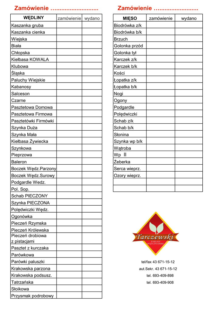 Zamówienie …......................... WĘDLINY zamówienie wydano Zamówienie …....................... MIĘSO zamówienie Kaszanka gruba Biodrówka z/k Kaszanka cienka Biodrówka b/k Wiejska Brzuch Biała Golonka przód Chłopska Golonka tył Kiełbasa KOWALA Karczek z/k Klubowa Karczek b/k Śląska Kości Paluchy Wiejskie Łopatka z/k Kabanosy Łopatka b/k Salceson Nogi Czarne Ogony Pasztetowa Domowa Podgardle Pasztetowa Firmowa Polędwiczki Pasztetówki Firmówki Schab z/k Szynka Duża Schab b/k Szynka Mała Słonina Kiełbasa Żywiecka Szynka wp b/k Szynkowa Pieprzowa Wątroba Wp II Baleron Żeberka Boczek Wędz.Parzony Serca wieprz. Boczek Wędz.Surowy Ozory wieprz. Podgardle Wedz. Pol. Sop. Schab PIECZONY Szynka PIECZONA Polędwiczki Wędz. Ogonówka Pieczeń Rzymska Pieczeń Królewska Pieczeń drobiowa z pistacjami Pasztet z kurczaka Parówkowa Parówki paluszki Krakowska parzona tel/fax 43 671-15-12 aut.Sekr. 43 671-15-12 Krakowska podsusz. tel. 693-409-898 Tatrzańska tel. 693-409-908 Słoikowa Przysmak podrobowy wydano