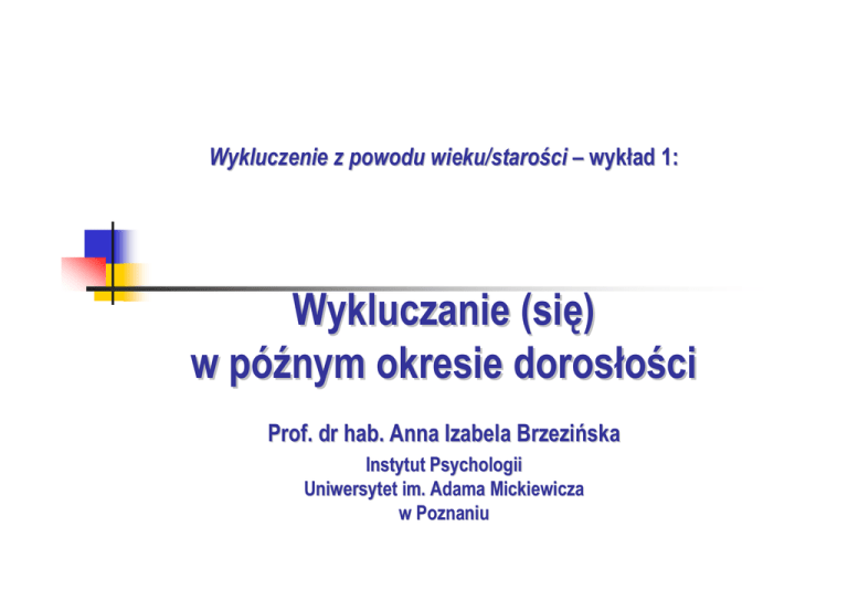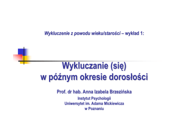 Wykluczenie z powodu wieku/starości – wykład 1: Wykluczanie (się) w późnym okresie dorosłości Prof. dr hab. Anna Izabela Brzezińska Instytut Psychologii Uniwersytet im. Adama Mickiewicza w Poznaniu Dorosłość w cyklu życia człowieka Dzieciństwo do 10/15 lat Dorastanie 10/15 – 20/25 lat Took. ok.80% 80% To naszegożycia życia naszego Dorosłość od 20/25 lat Fazy życia człowieka ERA I Dzieciństwo 00 – 10/15 lat ERA II Dorastanie 10/15 – 20/25 lat TRANSITION 1 TRANSITION 2 Przejście od dzieciństwa do wczesnej fazy adolescencji Przejście od późnej fazy adolescencji do fazy wczesnej dorosłości 10 - 15 lat 20 - 25 lat Era III Dorosłość 20/25 - … lat Fazy dorosłości Wczesna dorosłość 20/25 – 30/35 lat Środkowa dorosłość 30/35 – 60/65 lat TRANSITION 3 TRANSITION 4 Przejście od wczesnej do środkowej fazy dorosłości Przejście od środkowej do późnej fazy dorosłości 30 - 35 lat 60 - 65 lat Późna dorosłość 60/65 - … lat Fazy późnej dorosłości Młodsi starsi 60/65-70/75 lat Starsi starsi 70/75 – 80/85 lat Najstarsi starsi po 80/85 r. ż. TRANSITION 5 TRANSITION 6 Przejście od wczesnego do środkowego okresu późnej dorosłości Przejście od środkowego do późnego okresu późnej dorosłości 70 - 75 lat 80 - 85 lat Okresy przejściowe (sensytywne) i ich rola w rozwoju 10 – 15 lat późne dzieciństwo wczesna adolescencja 20 – 25 lat późna adolescencja wczesna dorosłość 30 – 35 lat wczesna dorosłość środkowa dorosłość 40 – 45 lat początek kryzysu środka życia 50 – 55 lat koniec kryzysu środka życia PRZEŁOM połowy życia 60 – 65 lat środkowa dorosłość młodsi starsi 70 – 75 lat młodsi starsi starsi starsi 80 – 85 lat starsi starsi najstarsi starsi Punkt wyjścia: Ważne jest, by zwracać uwagę na to, jaki obraz późnej dorosłości mają dzieci, młodzież, młodsi dorośli i dorośli w średnim okresie życia. Zwykle nie rozumiemy i nie doceniamy wpływu, jaki ten obraz wywiera na to, jak przeżywamy okres życia, w którym akurat jesteśmy, na poziom naszego optymizmu, na nasze samopoczucie i podejmowane działania. Możliwość I jeżeli ktoś ma „CZARNY OBRAZ” późnej dorosłości, niczego się po tym okresie nie spodziewa, nie jest on dla niego obietnicą, to każdy okres życia, który będzie akurat przeżywał będzie zabarwiony na czarno, ODCIENIEM ROZPACZY. ROZPACZY Możliwość II Jeżeli natomiast późną dorosłość widzi się jako mogącą przynieść NOWE DOŚWIADCZENIA, jeżeli ma się pragnienie przeżycia także w tym okresie czegoś EKSCYTUJĄCEGO, to wtedy ma się POCZUCIE SWOBODY w każdym wcześniejszym okresie życia, umożliwiające doświadczanie tego, co wokół nas w sposób BEZPIECZNY, pełen zaufania do świata oraz akceptowany przez siebie i innych ludzi. Powszechne zdarzenia Zmiana stanu zdrowia, kondycji fizycznej oraz zmiana wyglądu Utrata POCZUCIA PRZYDATNOŚCI i wiążącej się z nim pozycji wśród najbliższych i w otoczeniu Zmiana statusu społecznego i ekonomicznego w związku z przejściem na emeryturę Utrata osób bliskich– partnerów życiowych, rodzeństwa, dzieci, przyjaciół, sąsiadów znajomych Obszary ryzyka OGRANICZENIE AUTONOMII obszar samoobsługi i zaspokajania podstawowych potrzeb w wymiarze ekonomicznym i decydowania o swoich wydatkach w zakresie poruszania się w przestrzeni w zakresie wyboru realizowanego stylu życia i sposobu dbania o jego jakość Nowe zjawiska związane z procesem starzenia się populacji (za: Woźniak, 2001): coraz większa liczba ludzi starych ma coraz starsze dzieci coraz więcej relacji wewnątrzrodzinnych przybiera postać związków typu „stary człowiek - stary człowiek” zmniejszająca się liczba dzieci w rodzinach powoduje też to, że rodzinę tworzy więcej dziadków i pradziadków niż wnuków zwiększa się liczba rodzin o nieznanej dotąd lub bardzo rzadko występującej strukturze – pojawiają się rodziny zrekonstruowane, rodziny 4-5 pokoleniowe, rodziny osób kilkakrotnie rozwiedzionych (kilka babć i dziadków) dzisiejsze pokolenie dziadków i wnuków jest bardzo zróżnicowane, gdyż pierwsze obejmuje osoby w wieku już od 35/40 do nawet 100 lat, zaś wnukami mogą być zarówno w osoby wieku niemowlęcym, jak również emeryci (tzw. „wczesna emerytura”) Podstawowe źródło zagrożenia wykluczeniem „W sensie demograficznym i społecznym współcześni seniorzy są pionierami, bowiem są pierwszym pokoleniem wchodzącym w skład tak bardzo zróżnicowanych strukturalnie rodzin, starzejących się tak, jak cała populacja. Efektem ubocznym tego stanu rzeczy jest jednak brak koncepcji ról dla nowych wariantów członkostwa i konfiguracji międzypokoleniowych w rodzinie” (Woźniak, 2001) Nowe okazje do uczenia się = nowe wyzwania / źródła trudności Transformacja Rozwój cywilizacyjny zmiana tradycyjnego przekazu między pokoleniami: post-figuratywność - ko-figuratywność - prefiguratywność zagrożone poczucie, że osobiste doświadczenia mogą być wartościowe i użyteczne dla innych ludzi częsty brak zainteresowania ze strony młodszych generacji zasobami osób starszych zmiana zapotrzebowania społecznego na mądrość życiową kult młodości i piękna, agresywnie i wszechobecnie podsycany przez media i reklamy częsty brak szacunku dla osób starszych, które nie spełniają kryteriów „medialnych” Kryzys więzi rodzinnych Zagubienie Syndrom społecznego wykluczania ludzi w wieku podeszłym: mechanizm samospełniającego się proroctwa PRZYCZYNY: EFEKTY: wypadanie z ról społecznych niepodejmowanie nowych ról znikają ważne społeczne punkty odniesienia zawężanie pola aktywności Uzależnienie od zewnętrznego etykietowania jestem taki, jak o mnie mówią Podejrzliwość i nieufność wobec innych ludzi Samoetykietowanie jestem niekompetentny społeczny obraz starości jako niekompetencji czyli ludzie starzy są „do niczego” promowani