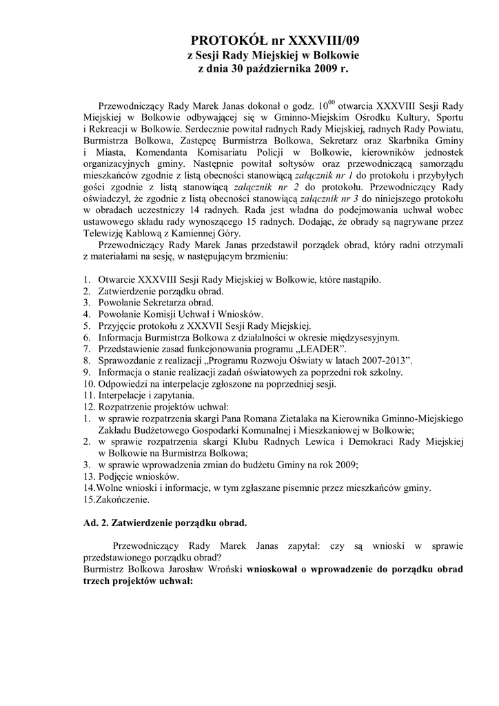 PROTOKÓŁ nr XXXVIII/09 z Sesji Rady Miejskiej w Bolkowie z dnia 30 października 2009 r. Przewodniczący Rady Marek Janas dokonał o godz. 1000 otwarcia XXXVIII Sesji Rady Miejskiej w Bolkowie odbywającej się w Gminno-Miejskim Ośrodku Kultury, Sportu i Rekreacji w Bolkowie. Serdecznie powitał radnych Rady Miejskiej, radnych Rady Powiatu, Burmistrza Bolkowa, Zastępcę Burmistrza Bolkowa, Sekretarz oraz Skarbnika Gminy i Miasta, Komendanta Komisariatu Policji w Bolkowie, kierowników jednostek organizacyjnych gminy. Następnie powitał sołtysów oraz przewodniczącą samorządu mieszkańców zgodnie z listą obecności stanowiącą załącznik nr 1 do protokołu i przybyłych gości zgodnie z listą stanowiącą załącznik nr 2 do protokołu. Przewodniczący Rady oświadczył, że zgodnie z listą obecności stanowiącą załącznik nr 3 do niniejszego protokołu w obradach uczestniczy 14 radnych. Rada jest władna do podejmowania uchwał wobec ustawowego składu rady wynoszącego 15 radnych. Dodając, że obrady są nagrywane przez Telewizję Kablową z Kamiennej Góry. Przewodniczący Rady Marek Janas przedstawił porządek obrad, który radni otrzymali z materiałami na sesję, w następującym brzmieniu: 1. Otwarcie XXXVIII Sesji Rady Miejskiej w Bolkowie, które nastąpiło. 2. Zatwierdzenie porządku obrad. 3. Powołanie Sekretarza obrad. 4. Powołanie Komisji Uchwał i Wniosków. 5. Przyjęcie protokołu z XXXVII Sesji Rady Miejskiej. 6. Informacja Burmistrza Bolkowa z działalności w okresie międzysesyjnym. 7. Przedstawienie zasad funkcjonowania programu „LEADER”. 8. Sprawozdanie z realizacji „Programu Rozwoju Oświaty w latach 2007-2013”. 9. Informacja o stanie realizacji zadań oświatowych za poprzedni rok szkolny. 10. Odpowiedzi na interpelacje zgłoszone na poprzedniej sesji. 11. Interpelacje i zapytania. 12. Rozpatrzenie projektów uchwał: 1. w sprawie rozpatrzenia skargi Pana Romana Zietalaka na Kierownika Gminno-Miejskiego Zakładu Budżetowego Gospodarki Komunalnej i Mieszkaniowej w Bolkowie; 2. w sprawie rozpatrzenia skargi Klubu Radnych Lewica i Demokraci Rady Miejskiej w Bolkowie na Burmistrza Bolkowa; 3. w sprawie wprowadzenia zmian do budżetu Gminy na rok 2009; 13. Podjęcie wniosków. 14.Wolne wnioski i informacje, w tym zgłaszane pisemnie przez mieszkańców gminy. 15.Zakończenie. Ad. 2. Zatwierdzenie porządku obrad. Przewodniczący Rady Marek Janas zapytał: czy są wnioski w sprawie przedstawionego porządku obrad? Burmistrz Bolkowa Jarosław Wroński wnioskował o wprowadzenie do porządku obrad trzech projektów uchwał: 2 - w sprawie zmiany uchwały nr XVI/109/08 Rady Miejskiej w Bolkowie z dnia 1 lutego 2008 r. w sprawie utworzenia rachunku dochodów własnych dla Gimnazjum im. Rycerstwa Polskiego w Bolkowie. Burmistrz poinformował, że wniosek został złożony przez kierownika tej jednostki, żeby rozszerzyć przyjęty przez radę rachunek dochodów własnych, projekt uchwały został przygotowany i przekazany do Biura Rady Miejskiej; - w sprawie zatwierdzenia zmian w statucie Samodzielnego Publicznego Zakładu Opieki Zdrowotnej w Bolkowie. Burmistrz poinformował, że w mijającym tygodniu odbyło się posiedzenie Rady Społecznej SPZOZ na wniosek dyrektora i przyjęto jednogłośnie proponowane zmiany do statutu, które są związane z rozszerzeniem ofert na działalność medycznych i ze składaniem wniosku do Narodowego Funduszu Zdrowia na 2010 r.; - w sprawie deklaracji przystąpienia Gminy Bolków do uczestnictwa w projekcie pt. „Budowa Środkowosudeckiego Regionu Gospodarki Odpadami w oparciu o zakład unieszkodliwiania odpadów w Lubawce” zgłoszony do finansowania w ramach Regionalnego Programu Operacyjnego Województwa Dolnośląskiego na lata 2007-2013, działanie 4.1 „Gospodarka odpadami”. Radny Henryk Baczmański zapytał dlaczego tak późno składane są projekty uchwał, są to ważne tematy, które na komisjach powinny być omawiane, wręczane są przed sesją jak jakieś papiery, nad którymi będzie prowadzone głosowanie oraz wnioskował o wpisanie poradni rehabilitacyjnej w pkt. 4 w statucie SPZOZ, ponieważ w Roztoce funkcjonuje taka poradnia, z której korzysta dużo mieszkańców również z Bolkowa w ramach funduszu zdrowia a Bolków jest większą gminą i takiej poradni nie posiada. Radny Roman Iwuć odczytał w imieniu Klubu Radny Lewica i Demokraci wniosek o wycofanie z porządku obrad projekt uchwały w sprawie rozpatrzenia skargi Klubu Radnych Lewica i Demokraci Rady Miejskiej w Bolkowie na Burmistrza Bolkowa, stanowiącego załącznik nr 4 do niniejszego protokołu. Burmistrz Bolkowa poinformował, że nie są to jakieś papiery tylko projekty uchwał przygotowane przez pracowników merytorycznych, opiniowane przez prawnika. Projekty te zostały złożone abyśmy nie czekali na zbędny układ terminowy i dlatego są zgłaszane na sesję październikową, co jest związane z wieloma czynnikami natury terminowej, finansowej. Odnośnie wniosku w sprawie wprowadzenia do projektu uchwały zapisu dotyczącego poradni rehabilitacyjnej poinformował, że Rada Społeczna SPZOZ analizowała sprawę powołania poradni rehabilitacyjnej, którą dogłębnie wyjaśniła dyrektor SPZOZ, co jest w protokole zapisane. Dodał, że poradnia ta nie może funkcjonować z powodów finansowych, lokalowych i braku aprobaty NFZ, proponował wniosek ten odrzucić. Radny Henryk Baczmański poinformował, że nie zna powodu, dla którego nie można wpisać w statucie prowadzenia tej poradni w SPZOZ i wypowiedział się za wprowadzeniem tego zapisu. Nie widzi żadnych przeszkód, żeby ująć w statucie prowadzenie tej poradni w przyszłości skoro wcześniej w pomieszczeniu SPZOZ prowadzona była prywatna poradnia rehabilitacyjna. Dodał, że niekoniecznie poradnia musi być w budynku SPZOZ, chociaż wolne pomieszczenia są na biura poselskie przeznaczane, a na prowadzenie takiej poradni nie ma. Burmistrz Bolkowa poinform