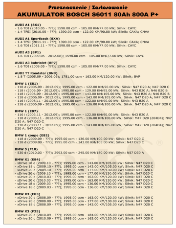 Przeznaczenie / Zastosowanie AKUMULATOR BOSCH S6011 80Ah 800A P+ AUDI A1 (8X1) - 1.6 TDI (2010.05 - ???); 1598.00 ccm - 105.00 KM/77.00 kW; Silnik: CAYC - 1.4 TFSI (2010.05 - ???); 1390.00 ccm - 122.00 KM/90.00 kW; Silnik: CAXA; CNVA AUDI A1 Sportback (8XA) - 1.4 TFSI (2011.11 - ???); 1390.00 ccm - 122.00 KM/90.00 kW; Silnik: CAXA; CNVA - 1.6 TDI (2011.11 - ???); 1598.00 ccm - 105.00 KM/77.00 kW; Silnik: CAYC AUDI A3 (8P1) - 1.6 TDI (2009.05 - 2012.08); 1598.00 ccm - 105.00 KM/77.00 kW; Silnik: CAYC AUDI A3 kabriolet (8P7) - 1.6 TDI (2009.05 - ???); 1598.00 ccm - 105.00 KM/77.00 kW; Silnik: CAYC AUDI TT Roadster (8N9) - 1.8 T (2005.09 - 2006.06); 1781.00 ccm - 163.00 KM/120.00 kW; Silnik: BVP BMW 1 (E81) - 118 d (2006.09 - 2012.09); 1995.00 ccm - 122.00 KM/90.00 kW; Silnik: N47 D20 A; N47 D20 C - 118 i (2006.09 - 2012.09); 1995.00 ccm - 129.00 KM/95.00 kW; Silnik: N43 B20 A; N46 B20 B - 118 i (2006.09 - 2012.09); 1995.00 ccm - 143.00 KM/105.00 kW; Silnik: N43 B20 A; N46 B20 B - 118 d (2006.09 - 2012.09); 1995.00 ccm - 143.00 KM/105.00 kW; Silnik: N47 D20 A; N47 D20 C - 116 i (2008.11 - 2012.09); 1995.00 ccm - 122.00 KM/90.00 kW; Silnik: N43 B20 A - 118 d (2006.09 - 2012.09); 1995.00 ccm - 136.00 KM/100.00 kW; Silnik: N47 D20 A; N47 D20 C BMW 1 (E87) - 116 i (2003.11 - 2012.09); 1995.00 ccm - 122.00 KM/90.00 kW; Silnik: N43 B20 A - 118 d (2003.11 - 2012.09); 1995.00 ccm - 136.00 KM/100.00 kW; Silnik: M47 D20 (204D4); N47 D20 A; N47 D20 C - 118 d (2003.11 - 2012.09); 1995.00 ccm - 143.00 KM/105.00 kW; Silnik: M47 D20 (204D4); N47 D20 A; N47 D20 C BMW 1 coupe (E82) - 118 d (2009.09 - ???); 1995.00 ccm - 136.00 KM/100.00 kW; Silnik: N47 D20 C - 118 d (2009.09 - ???); 1995.00 ccm - 143.00 KM/105.00 kW; Silnik: N47 D20 C BMW 5 (F10) - 530 d (2010.03 - ???); 2993.00 ccm - 245.00 KM/180.00 kW; Silnik: N57 D30 A BMW X1 (E84) - sDrive 18 d (2009.10 - ???); 1995.00 ccm - 143.00 KM/105.00 kW; Silnik: N47 D20 C - xDrive 18 d (2009.10 - ???); 1995.00 ccm - 143.00 KM/105.00 kW; Silnik: N47 D20 C - xDrive 20 d (2009.10 - ???); 1995.00 ccm - 177.00 KM/130.00 kW; Silnik: N47 D20 C - sDrive 20 d (2009.10 - ???); 1995.00 ccm - 177.00 KM/130.00 kW; Silnik: N47 D20 C - xDrive 20 d (2010.03 - ???); 1995.00 ccm - 163.00 KM/120.00 kW; Silnik: N47 D20 C - sDrive 20 d (2010.03 - ???); 1995.00 ccm - 163.00 KM/120.00 kW; Silnik: N47 D20 C - sDrive 18 d (2009.03 - ???); 1995.00 ccm - 136.00 KM/100.00 kW; Silnik: N47 D20 C - xDrive 18 d (2009.03 - ???); 1995.00 ccm - 136.00 KM/100.00 kW; Silnik: N47 D20 C BMW X3 (E83) - xDrive 20 d (2008.09 - ???); 1995.00 ccm - 163.00 KM/120.00 kW; Silnik: N47 D20 C - xDrive 20 d (2008.09 - ???); 1995.00 ccm - 177.00 KM/130.00 kW; Silnik: N47 D20 C - xDrive 18 d (2008.09 - ???); 1995.00 ccm - 143.00 KM/105.00 kW; Silnik: N47 D20 C BMW X3 (F25) - xDrive 20 d (2010.09 - ???); 1995.00 ccm - 184.00 KM/135.00 kW; Silnik: N47 D20 C - xDrive 20 d (2010.09 - ???); 1995.00 ccm - 163.00 KM/120.00 kW; Silnik: N47 D20 C LAND ROVER FREELANDER 2 (FA_) - 2.2 TD4 (2006.10 - ???); 2179.00 ccm - 160.00 KM/118.00 kW; Silnik: 224DT - 2.2 TD4 (2007.01 - ???); 2179.00 ccm - 152.00 KM/112.00 kW; Silnik: 224DT - 2.2 TD4 4x4 (2006.10 - ???); 2179.00 ccm - 156.00 KM/115.00 kW; Silnik: 224DT MERCEDES-BENZ KLASA C (W204) - C 200 CDI (204.007) (2007.01 - ???); OM 646.811 - C 220 CDI (204.008) (2007.01 - ???); - C 250 CDI (204.003) (2008.08 - ???); - C 220 CDI (204.002) (2008.12 - ???); - C 250 CGI (204.047) (2009.07 - ???); - C 180 CGI (204.049) (2007.01 - ???); - C 200 CGI (204.048) (2007.01 - ???); 2148.00 ccm - 136.00 KM/100.00 kW; Silnik: OM 646.812; 2148.00 2143.00 2143.00 1796.00 1796.00 1796.00 ccm ccm ccm ccm ccm ccm - 170.00 204.00 170.00 204.00 156.00 184.00 KM/125.00 KM/150.00 KM/125.00 KM/150.00 KM/115.00 KM/135.00 kW; kW; kW; kW; kW; kW; Silnik: Silnik: Silnik: Silnik: Silnik: Silnik: OM 646.811 OM 651.911 OM 651.911 M 271.860 M 271.820 M 271.820 MERCEDES-BENZ KLASA C T-Model (S204) - C 250 CGI (204.247) (2009.07 - ???); 1796.00 ccm - 204.00 KM/150.00 kW; - C 200 CDI (204.207) (2007.08 - ???); 2148.00 ccm - 136.00 KM/100.00 kW; - C 220 CDI (204.208) (2007.08 - ???); 2148.00 ccm - 170.00 KM/125.00 kW; - C 220 CDI (204.202) (2008.12 - ???); 2143.00 ccm - 170.00 KM/125.00 kW; - C 220 CDI (2007.08 - ???); 2148.00 ccm - 163.00 KM/120.00 kW; Silnik: Silnik: Silnik: Silnik: Silnik: M 271.860 OM 646.811 OM 646.811 OM 651.911 MERCEDES-BENZ KLASA E (W212) - E 250 CGI (212.047, 212.147) (2009.01 - ???); 1796.00 ccm - 204.00 KM/150.00 kW; Silnik: M 271.860 - E 220 CDI (212.002) (2009.01 - ???); 2143.00 ccm - 170.00 KM/125.00 kW; Silnik: OM 651.924 - E 250 CDI (212.003) (2009.01 - ???); 2143.00 ccm - 204.00 KM/150.00 kW; Silnik: OM 651.924 - E 200 CDI (212.005) (2009.01 - ???); 2143.00 ccm - 136.00 KM/100.00 kW; Silnik: OM 651.925 - E 200 CGI (212.048, 212.148) (2009.08 - ???); 1796.00 ccm - 184.00 KM/135.00 kW; Silnik: M 271.860; M 271.820 MERCEDES-BENZ KLASA E coupe (C207) - E 250 CGI (207.347) (2009.01 - ???); 1796.00 - E 250 CDI (207.303) (2009.01 - ???); 2143.00 - E 220 CDI (207.302) (2010.01 - ???); 2143.00 - E 200 CGI (207.348) (2010.01 - ???); 1796.00 M 271.820 MERCEDES-BENZ KLASA E kabriolet (A207) - E 220 CDI (207.402) (2010.01 - ???); 2143.00 - E 250 CDI (207.403) (2010.01 - ???); 2143.00 - E 200 CGI (207.448) (2010.01 - ???); 1796.00 M 271.820 - E 250 CGI (207.447) (2010.01 - ???); 1796.00 MERCEDES-BENZ KLASA E T-Model (S212) - E 200 CDI (212.205) (2009.11 - ???); 2143.00 - E 220 CDI (212.202) (2009.11 - ???); 2143.00 - E 250 CDI (212.203) (2009.11 - ???); 2143.00 - E 200 CGI (212.248) (2009.11 - ???); 1796.00 M 271.820 - E 250 CGI (212.247) (2009.11 - ???); 1796.00 ccm ccm ccm ccm - 204.00 204.00 170.00 184.00 KM/150.00 KM/150.00 KM/125.00 KM/135.00 kW; kW; kW; kW; Silnik: Silnik: Silnik: Silnik: M 271.860 OM 651.911 OM 651.911 M 271.860; ccm - 170.00 KM/125.00 kW; Silnik: OM 651.911 ccm - 204.00 KM/150.00 kW; Silnik: OM 651.911 ccm - 184.00 KM/135.00 kW; Silnik: M 271.860; ccm - 204.00 KM/150.00 kW
