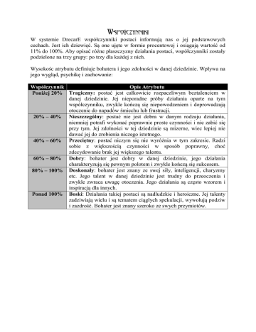 Wspołczynniki W systemie DrecarE współczynniki postaci informują nas o jej podstawowych cechach. Jest ich dziewięć. Są one ujęte w formie procentowej i osiągają wartość od 11% do 100%. Aby opisać różne płaszczyzny działania postaci, współczynniki zostały podzielone na trzy grupy: po trzy dla każdej z nich. Wysokośc atrybutu definiuje bohatera i jego zdolności w danej dziedzinie. Wpływa na jego wygląd, psychikę i zachowanie: Współczynnik Opis Atrybutu Tragiczny: postać jest całkowicie rozpaczliwym beztalenciem w Poniżej 20% danej dziedzinie. Jej nieporadne próby działania oparte na tym współczynniku, zwykle kończą się niepowodzeniem i doprowadzają otoczenie do napadów śmiechu lub frustracji. 20% – 40% Nieszczególny: postać nie jest dobra w danym rodzaju działania, niemniej potrafi wykonać poprawnie proste czynności i nie zabić się przy tym. Jej zdolności w tej dziedzinie są mizerne, wiec lepiej nie dawać jej do zrobienia niczego istotnego. 40% – 60% Przeciętny: postać niczym się nie wyróżnia w tym zakresie. Radzi sobie z większością czynności w sposób poprawny, choć zdecydowanie brak jej większego talentu. 60% – 80% Dobry: bohater jest dobry w danej dziedzinie, jego działania charakteryzują się pewnym polotem i zwykle kończą się sukcesem. 80% – 100% Doskonały: bohater jest znany ze swej siły, inteligencji, charyzmy etc. Jego talent w danej dziedzinie jest trudny do przeoczenia i zwykle zwraca uwagę otoczenia. Jego działania są często wzorem i inspiracją dla innych. Ponad 100% Boski: Działania takiej postaci są nadludzkie i heroiczne. Jej talenty zadziwiają wielu i są tematem ciągłych spekulacji, wywołują podziw i zazdrość. Bohater jest znany szeroko ze swych przymiotów. Wspołczynniki Fizyczne: Określają możliwości fizyczne danej postaci, sprawność jej ciała, a więc także i jego budowę, muskulaturę i sposób poruszania się. Jest to grupa cech najważniejsza dla Wojowników, a także istotna dla Towarzyszy. Reguluje wartość biegłości kontaktowych. Mówi również nieco o wyglądzie postaci, osobnik z dużą siłą będzie odznaczał się solidną, muskularną budową ciała podczas gdy bohater o niskiej wartości tego współczynnika będzie raczej szczupły i wątły. Siła Fizyczna określa także maksymalny udźwig bohatera. Określa się go mnożąc ją przez 5. Oznacza to, że taki ciężar może on podnieść i utrzymać przez jedną rundę. Na co dzień może nosić obciążenie równe co najwyżej połowie wartości S.F. Siła to również wysokość dodatkowych obrażeń (tzw. Mod. Obr.) które postać zadaje walcząc wręcz. Ich liczbę otrzymujemy dzieląc ją przez dziesięć i zaokrąglając w dół. Przykład: Krasnolud Ojorg jest wojownikiem i ma 67 siły. Jego maksymalny udźwig wynosi więc 335 kg, na co dzień zaś może nosić obciążenie równe 33 kg. Ojorg walcząc wręcz zadaje również 6 dodatkowych obrażenia (jego Mod. Obr. Wynosi 6). . ść Określa sprawność ogólną i manualną danego bohatera. Informuje o jego koordynacji ruchowej i ogólnym wysportowaniu. Testowana jest przy skokach, wyczynach akrobatycznych, wspinaczce a również przy działaniach manualnych: opatrywaniu ran, otwieraniu zamków i innych pracach ręcznych. Jej wysokość mówi o wysokości PO, szybkości z jaką postać biega, oraz reguluje wszystkie biegłości. Informuje nas także o Inicjatywie bohatera, a więc szybkości jego działania w walce. Jest bardzo ważna dla Wojowników, Towarzyszy i Techników. ć Informuje nas o żywotności postaci, jej odporności na trudy i niewygody, oraz ogólnym zahartowaniu. Postać z wysoką cechą będzie sprawiała wrażenie żywotnej i aktywnej, podczas gdy bohater o niskiej wartości tego współczynnika, wyda się dość anemiczny i cherlawy. Testuje się ją w przypadku zagrożenia przez choroby i trucizny, a także w czasie wyczerpujących czynności fizycznych (jak np. wspinaczka). Wysoka Odporność chroni także bohatera przed ogłuszeniem, oraz dodatkowymi efektami wynikającymi z użycia magii (np. podpalenia, odmrożenia, petryfikacja) . Wspołczynniki Umysłowe Mówią o wewnętrznym świecie postaci, jej bystrości, wrażliwości, mądrości wewnętrznej oraz odporności psychicznej i harcie ducha. Na planie astralnym zastępują współczynniki fizyczne. Są niezwykle istotne dla Adeptów i Techników, a także dla tych wszystkich, którzy działają w Świecie Snów. Współczynnik ten jest sumą logicznego kojarzenia faktów, szybkiego uczenia się i zdolności zapamiętywania. Wysoka Int. Wskazuje na to, że dany bohater jest całkiem bystry, natomiast postać o niskiej wartości tej cechy, nie będzie zbyt lotna umysłowo, ani zdolna do myślenia abstrakcyjnego. Inni bohaterowie będą zapewne uważać ją za przygłupa. Wiele umiejętności wiedzy, zwłaszcza dotyczącej gromadzenia informacji (jak np. Historia czy Religia), oraz polegających na rozumieniu skomplikowanych teorii i zależności (jak Teoria Magii i Technologia), opiera się właśnie na tej cesze. Jest to więc współczynnik niezwykle istotny, zwłaszcza dla Techników, którzy często korzystają z opartych o niego umiejętności. Na planie Astralnym cecha ta zastępuje Odp. Cecha ta nie mówi niczego wprost, jej działanie objawia się zwykle jako niejasne przeczucia i podejrzenia. Przedstawia wrażliwość duchową, mądrość wewnętrzną, oraz tak zwany „szósty zmysł” bohatera. Ci, którzy posiadają wysoką Intuicję uważani są za mędrców, a ich rady są szanowane. Przeciwnie do nich: osobnicy z niską cechą, będą odbierani jako pozbawieni głębszej wrażliwości i zrozumienia. Jego zdolność do wyczuwania zagrożenia i słuchania swych przeczuć. Opiera się na niej wiele dziedzin wiedzy naturalnej (Zielarstwo czy Natura). Jest także ważną cechą w kontakcie z duchami (bohater z niską Inu. robi na nich zwykle niemiłe wrażen
