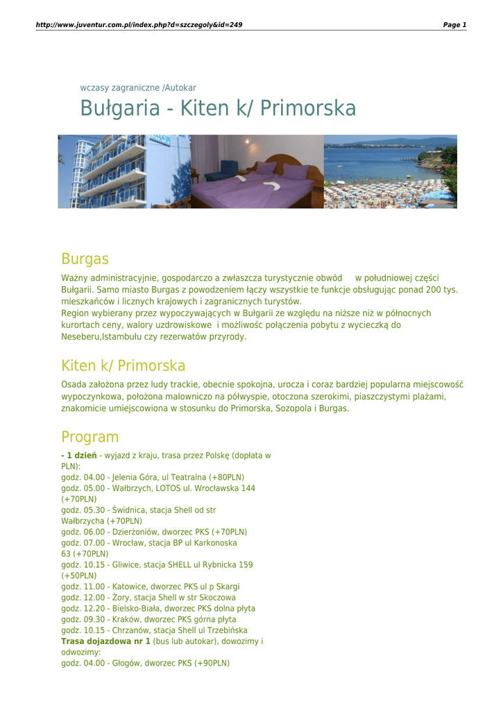 http://www.juventur.com.pl/index.php?d=szczegoly&id=249 Page 1 wczasy zagraniczne /Autokar Bułgaria - Kiten k/ Primorska Burgas Ważny administracyjnie, gospodarczo a zwłaszcza turystycznie obwód w południowej części Bułgarii. Samo miasto Burgas z powodzeniem łączy wszystkie te funkcje obsługując ponad 200 tys. mieszkańców i licznych krajowych i zagranicznych turystów. Region wybierany przez wypoczywających w Bułgarii ze względu na niższe niż w północnych kurortach ceny, walory uzdrowiskowe i możliwośc połączenia pobytu z wycieczką do Neseberu,Istambułu czy rezerwatów przyrody. Kiten k/ Primorska Osada założona przez ludy trackie, obecnie spokojna, urocza i coraz bardziej popularna miejscowość wypoczynkowa, położona malowniczo na półwyspie, otoczona szerokimi, piaszczystymi plażami, znakomicie umiejscowiona w stosunku do Primorska, Sozopola i Burgas. Program - 1 dzień - wyjazd z kraju, trasa przez Polskę (dopłata w PLN): godz. 04.00 - Jelenia Góra, ul Teatralna (+80PLN) godz. 05.00 - Wałbrzych, LOTOS ul. Wrocławska 144 (+70PLN) godz. 05.30 - Świdnica, stacja Shell od str Wałbrzycha (+70PLN) godz. 06.00 - Dzierżoniów, dworzec PKS (+70PLN) godz. 07.00 - Wrocław, stacja BP ul Karkonoska 63 (+70PLN) godz. 10.15 - Gliwice, stacja SHELL ul Rybnicka 159 (+50PLN) godz. 11.00 - Katowice, dworzec PKS ul p Skargi godz. 12.00 - Żory, stacja Shell w str Skoczowa godz. 12.20 - Bielsko-Biała, dworzec PKS dolna płyta godz. 09.30 - Kraków, dworzec PKS górna płyta godz. 10.15 - Chrzanów, stacja Shell ul Trzebińska Trasa dojazdowa nr 1 (bus lub autokar), dowozimy i odwozimy: godz. 04.00 - Głogów, dworzec PKS (+90PLN) http://www.juventur.com.pl/index.php?d=szczegoly&id=249 godz. 04.35 - Polkowice , dworzec PKS (+80PLN) godz. 05.05 - Lubin,dworzec PKP (+80PLN) godz. 05.45 - Legnica, dworzec PKS (+80PLN) Trasa dojazdowa nr 2 (bus lub autokar) godz. 09.00 - Opole, parking Biedronka, ul. 1 Maja (+60PLN) godz. 08.15 - Brzeg, stacja LOTOS ul Starobrzeska 40 (+65PLN) godz. 07.55 - Oława, dworzec PKS (+65PLN) - 2 dzień + 9 dni - przyjazd do Kiten, zakwaterowanie od godz 14,00 kolacja, nocleg, pobyt w Kiten, plażowanie, wypoczynek, wycieczki fakultatywne - 11 dzień - śniadanie, wykwaterowanie o godz 09,00,obiad, wyjazd do kraju w godzinach popołudniowych, po postoju autokaru - 12 dzień - przyjazd do Polski Świadczenia - 9 noclegów (10 dni) - wyżywienie 3 x dziennie (kuchnia polska z elementami kuchni regionalnej), śniadania - bufet, obiady i kolacje - dwudaniowe, wybór z dwóch zestawów, deser, bufet sałatkowy, napoje dodatkowo płatne - opieka pilota i przedstawiciela organizatora - ubezpieczenie KL - do 10.000 Euro i NW do 7.000 PLN Cena nie obejmuje: -ubezpieczenia od kosztów rezygnacji z imprezy i kosztów przerwania imprezy turystycznej - opłaty klimatycznej płatnej w hotelu: dorośli 2 LEWA/os./dzień, dzieci 12-18 lat 1,50 LEWA/os./dzień, dzieci 0-12 lat 1 LEWA/os./dzień, -serwisu plażowego , napojów do obiadów i kolacji. Zakwaterowanie - Hotel Kiten Palace*** Hotel położony niedaleko od centrum, 100 m od morza, 400 m od plaży północnej i 600 m od plaży południowej, wybudowany w roku 2006, pokoje 2,3,4-osobowe z łazienkami, TVSat, lodówka, klimatyzacja indywidualnie sterowana, balkon, basen, bar. Transport - Autokar Czechy, Słowacja, Węgry, Serbia. Dla osób dorosłych możliwy przejazd na podstawie dowodu osobistego,Osoby niepełnoletnie paszport lub dowód tymczasowy. Wymagany paszport dla uczestników wyjazdu fakultatywnego do Istambułu. Wycieczki fakultatywne Page 2 http://www.juventur.com.pl/index.php?d=szczegoly&id=249 Page 3 Na życzenie i koszt klienta, organizowane w trakcie pobytu: - wycieczka do Neseberu i Sozopolu autokarem (60 lewa/os.) - wycieczka do Ropotamo i Sozopolu autokarem (48 lewa/os.) - rejs statkiem i plażowanie na " Rajskiej Plaży" w rezerwacie Ropotamo(52 lewa/os.) - wycieczka do Istambułu, dwudniowa (70 euro ) - Wioska Bułgarska (55 lewa/os.) * Ceny wycieczek mogą ulec zmianie. Wycieczki realizowane są przez miejscowego touroperatora przy minimum 20 uczestnikach. nr grupy termin osoba dorosła w pok 2 os trzecia osoba w pokoju czwarta osoba w pokoju dziecko <6-12> lat * BGB-01/16 05.06-14.06.16 SPRZED. SPRZED. SPRZED. SPRZED. SPRZED. BGB-02/16 13.06-24.06.16 SPRZED. SPRZED. SPRZED. SPRZED. SPRZED. BGB-03/16 22.06-03.07.16 SPRZED. SPRZED. SPRZED. SPRZED. SPRZED. BGB-04/16 01.07-12.07.16 SPRZED. SPRZED. SPRZED. SPRZED. SPRZED. BGB-05/16 10.07-21.07.16 SPRZED. SPRZED. SPRZED. SPRZED. SPRZED. BGB-06/16 19.07-30.07.16 SPRZED. SPRZED. SPRZED. SPRZED. SPRZED. BGB-07/16 28.07-08.08.16 SPRZED. SPRZED. SPRZED. SPRZED. SPRZED. BGB-08/16 06.08-17.08.16 SPRZED. SPRZED. SPRZED. SPRZED. SPRZED. BGB-09/16 15.08-26.08.16 SPRZED. SPRZED. SPRZED. SPRZED. SPRZED. BGB-10/16 24.08-04.09.16 SPRZED. SPRZED. SPRZED. SPRZED. SPRZED. BGB-11/16 02.09-13.09.16 SPRZED. SPRZED. SPRZED. SPRZED. SPRZED. BGB-12/16 11.09-22.09.16 SPRZED. SPRZED. SPRZED. SPRZED. SPRZED. * łóżko dostawne przy dwóch osobach pełnopłatnych z 1/2 wyżywienia. (Roczniki 2004- 2010). Dopłata do pełnego wyżywienia +150 PLN - dzieci do lat 6 (rocznik 2010 i młodszy) - bez świadczeń stała cena 529 PLN, 1/2 wyżywienia + 180 PLN - własny dojazd cena niższa o 380 PLN/osoby, zakwaterowanie dzień później od godz 16 do godz 09,00 dzień wcześniej. - dopłata do pokoju 1 osobowego 350 PLN - opłata klimatyczna płatna w hotelu dorosli = 2 lewa/dobę, dzieci 12-18 lat = 1.50 lewa, dzieci 0-12 lat =1 lewa, Promocje: 30% zaliczki wpłaconej do 31.03.2016 - zniżka 200 PLN/pokój, ilość miejsc w promocji ograniczona IMPREZA ORGANIZOWANA WSPÓLNIE Z ZAPRZYJAŹNIONYM BIUREM PODRÓŻY