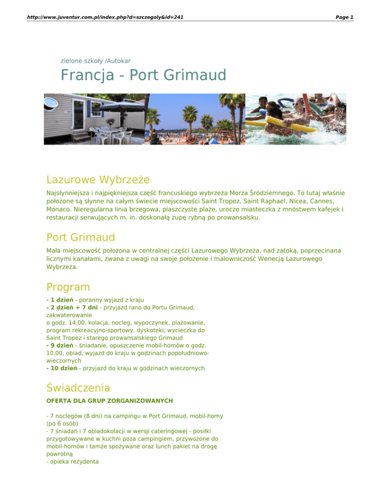 http://www.juventur.com.pl/index.php?d=szczegoly&id=241 Page 1 zielone szkoły /Autokar Francja - Port Grimaud Lazurowe Wybrzeże Najsłynniejsza i najpiękniejsza część francuskiego wybrzeża Morza Śródziemnego. To tutaj właśnie położone są słynne na całym świecie miejscowości Saint Tropez, Saint Raphael, Nicea, Cannes, Monaco. Nieregularna linia brzegowa, piaszczyste plaże, urocze miasteczka z mnóstwem kafejek i restauracji serwujących m. in. doskonałą zupę rybną po prowansalsku. Port Grimaud Mała miejscowość położona w centralnej części Lazurowego Wybrzeża, nad zatoką, poprzecinana licznymi kanałami, zwana z uwagi na swoje położenie i malowniczość Wenecją Lazurowego Wybrzeża. Program - 1 dzień - poranny wyjazd z kraju - 2 dzień + 7 dni - przyjazd rano do Portu Grimaud, zakwaterowanie o godz. 14.00, kolacja, nocleg, wypoczynek, plażowanie, program rekreacyjno-sportowy, dyskoteki, wycieczka do Saint Tropez i starego prowansalskiego Grimaud - 9 dzień - śniadanie, opuszczenie mobil-homów o godz. 10.00, obiad, wyjazd do kraju w godzinach popołudniowowieczornych - 10 dzień - przyjazd do kraju w godzinach wieczornych Świadczenia OFERTA DLA GRUP ZORGANIZOWANYCH - 7 noclegów (8 dni) na campingu w Port Grimaud, mobil-homy (po 6 osób) - 7 śniadań i 7 obiadokolacji w wersji cateringowej - posiłki przygotowywane w kuchni poza campingiem, przywożone do mobil-homów i tamże spożywane oraz lunch pakiet na drogę powrotną - opieka rezydenta http://www.juventur.com.pl/index.php?d=szczegoly&id=241 Page 2 - francuska opieka medyczna - program turystyczny w cenie imprezy - ubezpieczenie od kosztów leczenia (KL do 10.000 Euro) i następstw nieszczęśliwych wypadków (NNW do 7.000 PLN) Zakwaterowanie - Camping Les Prairies de la Mer ***** w Port Grimaud k/Saint Tropez, mobilhomy Pięciogwiazdkowy camping przylegający bezpośrednio do morza, piaszczysta plaża. Na campingu restauracje, bary, klubdyskoteka, występy zespołów na żywo, sklepy, telefony, pralnia, wypożyczalnia rowerów, możliwość korzystania z nart wodnych, windsurfingu, spadochronu, bezpłatne korty tenisowe (4), piłki nożnej i siatkówki plażowej. Mobil-homy 4/6-osobowe (ok. 28 m2), z dwiema wydzielonymi sypialniami, (w jednej łóżko podwójne, w drugiej dwa pojedyncze) oraz miejscami do spania w salonie, z kuchenką ciepłą i zimną wodą, WC, prysznicem, lodówką, naczyniami, sztućcami, garnkami, kocami, poduszkami. Uwaga: 1. Wejście do mobil-homu od godz. 14.00 w dniu przyjazdu, opuszczenie do godz. 10.00 w dniu wyjazdu. 2. Należy zabrać ze sobą pościel. Transport - Autokar - autokar lux (klimatyzacja, WC, barek, video) - przejazd przez Czechy, (Niemcy), Austrię, Włochy Wycieczki fakultatywne Na życzenie i koszt klienta organizowane w trakcie pobytu: - Monaco, Monte Carlo, Cannes, perfumeria w Eze (30 Euro) - wycieczka do Wielkiego Kanionu du Verdon (25 Euro) + koszt wynajęcia łódek - wycieczka do Arles, Avignon i Pont du Gard (35 Euro) nr grupy termin cena ZS-01/17 28.04-07.05.17 1 290,- ZAREZERWUJ ZS-02/17 19.05-28.05.17 1 290,- ZAREZERWUJ ZS-03/17 26.05-04.06.17 1 290,- ZAREZERWUJ ZS-04/17 02.06-11.06.17 1 290,- ZAREZERWUJ ZS-05/17 09.06-18.06.17 1 290,- ZAREZERWUJ ZS-06/17 08.09-17.09.17 1 290,- ZAREZERWUJ ZS-07/17 15.09-24.09.17 1 290,- ZAREZERWUJ http://www.juventur.com.pl/index.php?d=szczegoly&id=241 ZS-08/17 22.09-01.10.17 Page 3 1 290,- ZAREZERWUJ 1) Uczestnicy otrzymują wysprzątane mobil-homy i są zobowiązani w takim samym stanie oddać je po turnusie. 2) Organizator pobiera kaucję 50 Euro/mobil-home, zwracaną po turnusie w przypadku: a) braku zniszczeń w mobil-homie b) oddania wysprzątanego mobil-homu. 3) Sprzedaż tylko całych grup. 4) Dopłata na Turystyczny Fundusz Gwarancyjny - 10 PLN/os.