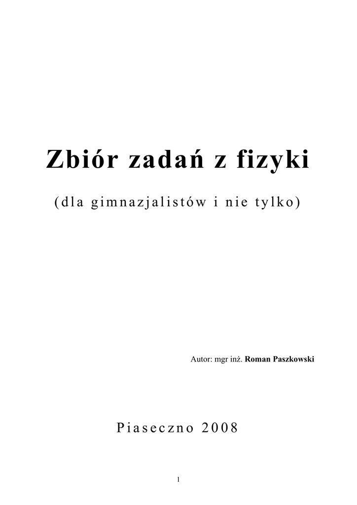 Zbiór zadań z fizyki (dla gimnazjalistów i nie tylko) Autor: mgr inż. Roman Paszkowski Piaseczno 2008 1 Zbiór zadań z fizyki. Autor: mgr inż. Roman Paszkowski Wszelkie prawa zastrzeżone . ( to opracowanie będzie uzupełniane i poprawiane ) Wstęp. W fizyce mamy wiele wielkości fizycznych. Te, które są związane z kierunkiem i zwrotem działania, nazywamy wielkościami wektorowymi np: prędkość, siła, przyspieszenie, oraz niezwiązane z kierunkiem działania, tak zwane skalarne: praca, moc, masa, gęstość. Dlatego w fizyce, rozwiązując zadania tekstowe należy zawsze zilustrować treść zadania, (rysunek nie musi być dziełem artystycznym) narysować oś kierunkową, lub układ współrzędnych, zaznaczyć wszystkie dane z treści zadania, a także szukane wielkości ze znakiem zapytania. Dzięki osi kierunkowej lub układowi współrzędnych, zawsze będziemy wiedzieli, czy dana wielkość fizyczna jest dodatnia (zwrot wektora danej wielkości jest zgodny ze zwrotem osi), czy ujemna (zwrot wektora danej wielkości fizycznej skierowany jest w stronę przeciwną, do zwrotu osi). Jednoznacznie określimy zwrot i znak znalezionego rozwiązania, danego zadania. Ułatwi nam to przede wszystkim napisanie równań, które doprowadzą do rozwiązania zadania. Patrząc na rysunek, na którym narysujemy wektory, o których jest mowa w treści zadania, opiszemy je symbolami literowymi ( każda wielkość fizyczna ma swój przyjęty symbol literowy: prędkość v, droga S, przyspieszenie a, moc P, praca W itd.) i przystępujemy do napisania równań.. Przy wielkościach szukanych możemy postawić znak zapytania. Wszystkie wielkości fizyczne mają swoją wartość, którą wyrażamy w liczbach i danych jednostkach. Aby nie było pomyłek w rozwiązaniach, należy wszystkie wielkości fizyczne przedstawiać w jednostkach Układu SI, bo wszystkie wzory są tak skonstruowane, że ten warunek musi być spełniony. Zwróćmy uwagę, aby nie było tych samych nazw wielkości fizycznych, dla różnych wartości. Aby nie było wątpliwości, czy dana litera jest symbolem literowym danej wielkości fizycznej, czy jednostką, zaleca się pisanie jednostek w nawiasie kwadratowym. Zmniejsza to również ryzyko popełnienia błędu przy upraszczaniu liczb, z niestarannie napisanymi jednostkami. Mam nadzieję, że to opracowanie pomoże młodzieży zrozumieć fizykę, poznać metody rozwiązywania zadań i poczuć przyjemność w obcowaniu z tym przedmiotem. Nie wierzcie tym, którzy powtarzają: „fizyka jest trudna”, bo to stwierdzenie wytwarza w Was dystans, do tego przedmiotu. Tylko systematyczna praca daje wspaniałe efekty. 2 Spis treści: Str. Wstęp ……………………………………………….…….………… .. 2 1. Przeliczanie jednostek……………………………………..……….. 4 2. Dodawanie sił………………………………………………………….. 6 3. Moment siły………………………………………………………..…… 9 4. Ruch jednostajny………………………………………………….…… 12 4.1. Prędkość średnia w ruchu jednostajnym……………………….… 17 5. Ruch jednostajnie przyspieszony, bez prędkości początkowej….… 18 6. Rzuty w polu grawitacyjnym……………………………………….… 22 7. Pęd masy……………………………………………………………… 26 8. Dynamika punktu materialnego……………………………………… 30 9. Praca…………………………………………………………………… 32 10. Tarcie……………………………………………………………………35 11. Energia mechaniczna………………………………………………… 37 12. Gęstość materii……………………………………………….…………41 13. Hydrostatyka……………………………………………………………44 14. Ciepło……………………………………………………………………50 15. Elektrostatyka………………………………………………………… 55 16. Prąd elektryczny stały………………………………………………… 59 17. Magnetyzm…………………………………………………………… 67 18. Prąd przemienny……………………………………………………… 67 19. Drgania i fale mechaniczne…………………………………………… 68 20. Fale elektromagnetyczne……………………………………………… 71 21. Optyka………………………………………………………………… 72 22. Fizyka jądrowa………………………………………………………… 74 23. Skala, podziałka..................... ………………………………………..…76 24. Sprężystość ciał…………………………………………………………..78 25. Przemiany energii………………………………………………………..80 26. Porównanie ruchu postępowego z obrotowym………………………...82 27. Odpowiedzi do zadań……………………………………………………83 3 1. Przeliczanie jednostek. Kto nie ma wprawy w przeliczaniu jednostek, przelicza najpierw na podstawową jednostkę w Układzie SI, a następnie na żądaną. teragigamegakilohektodekadecycentymilimikronanopikofemto- 1012 T 9 10 G 106 M 3 10 k 102 h 10 da 1 10-1 d 10-2 c 10-3 m 10-6 μ 10-9 n -12 10 p 10-15 f Przykład 1. Przelicz jednostki: 345 [mm] = ? [cm] Pamiętaj o podstawowej zasadzie: ile razy nowa jednostka jest większa, tyle razy liczba przy niej stojąca jest mniejsza. I odwrotnie. 345[mm] = 345⋅10-3[m] = 345⋅10-3 ⋅102[cm] = 345⋅10-1[cm] = 34,5[cm] Objaśnienie: Współczynnik 10-3 wynika z tego, że metr, jest tysiąc razy większy od milimetra, więc liczba musi być tysiąc razy mniejsza. Dzielimy przez tysiąc, lub mnożymy przez jedną tysięcz