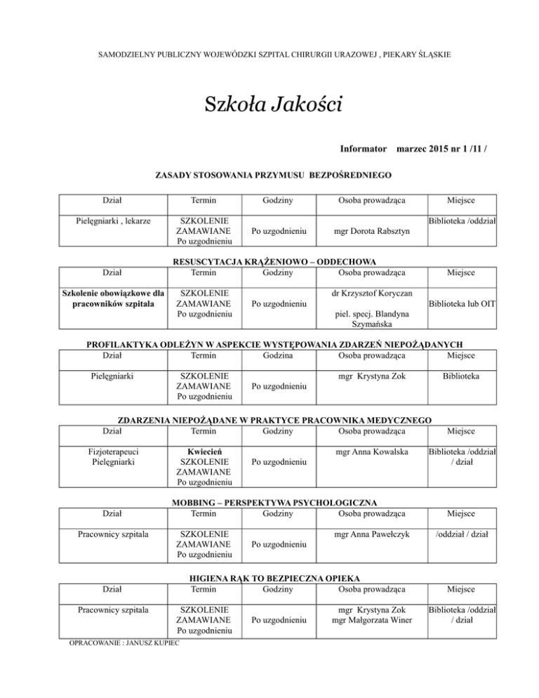 SAMODZIELNY PUBLICZNY WOJEWÓDZKI SZPITAL CHIRURGII URAZOWEJ , PIEKARY ŚLĄSKIE Szkoła Jakości Informator marzec 2015 nr 1 /11 / ZASADY STOSOWANIA PRZYMUSU BEZPOŚREDNIEGO Dział Termin Godziny Osoba prowadząca Pielęgniarki , lekarze SZKOLENIE ZAMAWIANE Po uzgodnieniu Po uzgodnieniu mgr Dorota Rabsztyn Dział Szkolenie obowiązkowe dla pracowników szpitala Miejsce Biblioteka /oddział RESUSCYTACJA KRĄśENIOWO – ODDECHOWA Termin Godziny Osoba prowadząca SZKOLENIE ZAMAWIANE Po uzgodnieniu Miejsce dr Krzysztof Koryczan Biblioteka lub OIT Po uzgodnieniu piel. specj. Blandyna Szymańska PROFILAKTYKA ODLEśYN W ASPEKCIE WYSTĘPOWANIA ZDARZEŃ NIEPOśĄDANYCH Dział Termin Godzina Osoba prowadząca Miejsce Pielęgniarki SZKOLENIE ZAMAWIANE Po uzgodnieniu mgr Krystyna Zok Biblioteka Po uzgodnieniu ZDARZENIA NIEPOśĄDANE W PRAKTYCE PRACOWNIKA MEDYCZNEGO Dział Termin Godziny Osoba prowadząca Fizjoterapeuci Pielęgniarki Dział Pracownicy szpitala Kwiecień SZKOLENIE ZAMAWIANE Po uzgodnieniu MOBBING – PERSPEKTYWA PSYCHOLOGICZNA Termin Godziny Osoba prowadząca SZKOLENIE ZAMAWIANE Po uzgodnieniu mgr Anna Pawełczyk SZKOLENIE ZAMAWIANE Po uzgodnieniu OPRACOWANIE : JANUSZ KUPIEC Biblioteka /oddział / dział Miejsce /oddział / dział Po uzgodnieniu HIGIENA RĄK TO BEZPIECZNA OPIEKA Termin Godziny Osoba prowadząca Dział Pracownicy szpitala mgr Anna Kowalska Po uzgodnieniu Miejsce Po uzgodnieniu mgr Krystyna Zok mgr Małgorzata Winer Miejsce Biblioteka /oddział / dział