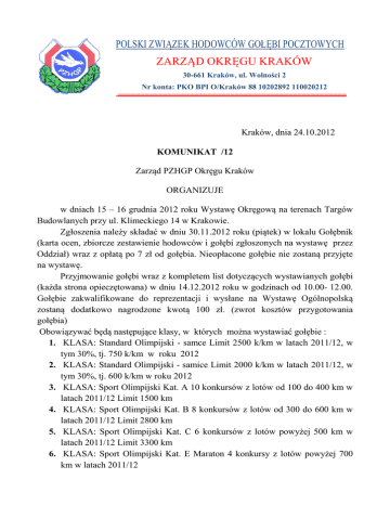 POLSKI ZWIĄZEK HODOWCÓW GOŁĘBI POCZTOWYCH ZARZĄD OKRĘGU KRAKÓW 30-661 Kraków, ul. Wolności 2 Nr konta: PKO BPI O/Kraków 88 10202892 110020212 =================================================== Kraków, dnia 24.10.2012 KOMUNIKAT /12 Zarząd PZHGP Okręgu Kraków ORGANIZUJE w dniach 15 – 16 grudnia 2012 roku Wystawę Okręgową na terenach Targów Budowlanych przy ul. Klimeckiego 14 w Krakowie. Zgłoszenia należy składać w dniu 30.11.2012 roku (piątek) w lokalu Gołębnik (karta ocen, zbiorcze zestawienie hodowców i gołębi zgłoszonych na wystawę przez Oddział) wraz z opłatą po 7 zł od gołębia. Nieopłacone gołębie nie zostaną przyjęte na wystawę. Przyjmowanie gołębi wraz z kompletem list dotyczących wystawianych gołębi (każda strona opieczętowana) w dniu 14.12.2012 roku w godzinach od 10.00- 12.00. Gołębie zakwalifikowane do reprezentacji i wysłane na Wystawę Ogólnopolską zostaną dodatkowo nagrodzone kwotą 100 zł. (zwrot kosztów przygotowania gołębia) Obowiązywać będą następujące klasy, w których można wystawiać gołębie : 1. KLASA: Standard Olimpijski - samce Limit 2500 k/km w latach 2011/12, w tym 30%, tj. 750 k/km w roku 2012 2. KLASA: Standard Olimpijski - samice Limit 2000 k/km w latach 2011/12, w tym 30%, tj. 600 k/km w roku 2012 3. KLASA: Sport Olimpijski Kat. A 10 konkursów z lotów od 100 do 400 km w latach 2011/12 Limit 1500 km 4. KLASA: Sport Olimpijski Kat. B 8 konkursów z lotów od 300 do 600 km w latach 2011/12 Limit 2800 km 5. KLASA: Sport Olimpijski Kat. C 6 konkursów z lotów powyżej 500 km w latach 2011/12 Limit 3300 km 6. KLASA: Sport Olimpijski Kat. E Maraton 4 konkursy z lotów powyżej 700 km w latach 2011/12 POLSKI ZWIĄZEK HODOWCÓW GOŁĘBI POCZTOWYCH ZARZĄD OKRĘGU KRAKÓW 30-661 Kraków, ul. Wolności 2 Nr konta: PKO BPI O/Kraków 88 10202892 110020212 =================================================== 7. KLASA: Sport Olimpijski Kat. D 11 konkursów w latach 2011/12: w lotach 100-400 km 3-5 konk., 300-600 km 2-6 konk., powyżej 500 km 1-3 konk. Limit 3500 km 8. .KLASA; F –Młode 3 konkursy w roku od 100 km 9. .KLASA; G- Roczne 5 konkursów w roku od 100 km 10..KLASA; H- Dorosłe 6 konkursów w roku od 300 km 11. KLASA: Sport Wyczyn suma k/km w latach 2011/12 12. KLASA: Wyczyn - samce k/km w roku 2012 Limit 3000 km 13. KLASA: Wyczyn - samice k/km w roku 2012 Limit 2500 km 14. KLASA: Sport Okręgowy Kat. A 5 konkursów w lotach 100-400 km w roku 2012 Limit 750 km 15. KLASA: Sport Okręgowy Kat. B 4 konkursy w lotach 300-600 km w roku 2012 Limit 1400 km 16. KLASA: Sport Okręgowy Kat. C 3 konkursy w lotach powyżej 500 km w roku 2012 Limit 1650 km 17. KLASA: Maraton 2 konkursy w roku 2012 w lotach powyżej 700 km. 18.KLASA: Roczne - samce k/km w roku 2012 Limit 1800 km 19. KLASA: Roczne - samice k/km w roku 2012 Limit 1500 km 20. KLASA: Młode Standard - samce 2 konkursy w 2012 21. KLASA: Młode Standard - samice 2 konkursy w 2012 22. KLASA: Standard Okręgowy - samce w latach 2011/12 Limit 1500 k/km 23. KLASA: Standard Okręgowy - samice w latach 2011/12 Limit 1000 k/km 24. KLASA: Weteran k/km z całego życia gołębia minimum 15000 k/km, w tym przynajmniej jeden konkurs w 2012 r. 25. KLASA: Weteranki k/km z całego życia gołębia minimum 15000 k/km, w tym przynajmniej jeden konkurs w 2012 r. UWAGA; W klasach 1.2,21,22,23,24, ocena standard. W klasach 3,4,5,6,7,8,9,10,14,15,16,17,18, liczy się coefficient, W klasach 11,12,13,19,20, liczą się k/km. POLSKI ZWIĄZEK HODOWCÓW GOŁĘBI POCZTOWYCH ZARZĄD OKRĘGU KRAKÓW 30-661 Kraków, ul. Wolności 2 Nr konta: PKO BPI O/Kraków 88 10202892 110020212 =================================================== Obowiązują listy sekcyjne, oddziałowe, rejonowe, okręgowe – z jakich korzystały Oddziały. Pomiędzy Oddziałami wystawiającymi gołębie zostanie przeprowadzony Konkurs. Pucharami zostaną nagrodzone 3- Oddziały z największą ilością punktów w podstawowych klasach olimpijskich wg punktacji 1-miejsce 3 punkty, 2-miejsce 2 punkty, 3-miejsce 1 punkt. Nagrody ufundowane przez Prezesa d/l Zwiedzanie wystawy: SOBOTA: 9.00 – 20.00, NIEDZIELA: 8.00 – 15.00, W sobotę o godzinie 10.00 nastąpi uroczyste Otwarcie Wystawy oraz o godz. 12.00 wręczenie pucharów Mistrzom i Przodownikom Regionu IV oraz wręczenie pucharów Mistrzom Okręgu Oficjalna strona Okręgu Kraków www.pzhgp-krakow.pl ZA ZARZĄD OKRĘGU v/ce Prezes Okręgu ds. Lotowych Stanisław Obieżyński