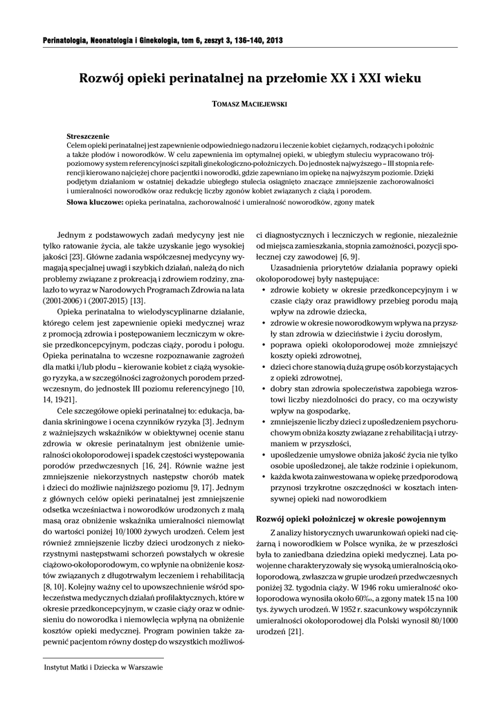Perinatologia, Neonatologia i Ginekologia, tom 6, zeszyt 3, 136-140, 2013 Rozwój opieki perinatalnej na przełomie XX i XXI wieku TOMASZ MACIEJEWSKI Streszczenie Celem opieki perinatalnej jest zapewnienie odpowiedniego nadzoru i leczenie kobiet ciężarnych, rodzących i położnic a także płodów i noworodków. W celu zapewnienia im optymalnej opieki, w ubiegłym stuleciu wypracowano trójpoziomowy system referencyjności szpitali ginekologiczno-położniczych. Do jednostek najwyższego – III stopnia referencji kierowano najciężej chore pacjentki i noworodki, gdzie zapewniano im opiekę na najwyższym poziomie. Dzięki podjętym działaniom w ostatniej dekadzie ubiegłego stulecia osiągnięto znaczące zmniejszenie zachorowalności i umieralności noworodków oraz redukcję liczby zgonów kobiet związanych z ciążą i porodem. Słowa kluczowe: opieka perinatalna, zachorowalność i umieralność noworodków, zgony matek Jednym z podstawowych zadań medycyny jest nie tylko ratowanie życia, ale także uzyskanie jego wysokiej jakości [23]. Główne zadania współczesnej medycyny wymagają specjalnej uwagi i szybkich działań, należą do nich problemy związane z prokreacją i zdrowiem rodziny, znalazło to wyraz w Narodowych Programach Zdrowia na lata (2001-2006) i (2007-2015) [13]. Opieka perinatalna to wielodyscyplinarne działanie, którego celem jest zapewnienie opieki medycznej wraz z promocją zdrowia i postępowaniem leczniczym w okresie przedkoncepcyjnym, podczas ciąży, porodu i połogu. Opieka perinatalna to wczesne rozpoznawanie zagrożeń dla matki i/lub płodu – kierowanie kobiet z ciążą wysokiego ryzyka, a w szczególności zagrożonych porodem przedwczesnym, do jednostek III poziomu referencyjnego [10, 14, 19-21]. Cele szczegółowe opieki perinatalnej to: edukacja, badania skriningowe i ocena czynników ryzyka [3]. Jednym z ważniejszych wskaźników w obiektywnej ocenie stanu zdrowia w okresie perinatalnym jest obniżenie umieralności okołoporodowej i spadek częstości występowania porodów przedwczesnych [16, 24]. Równie ważne jest zmniejszenie niekorzystnych następstw chorób matek i dzieci do możliwie najniższego poziomu [9, 17]. Jednym z głównych celów opieki perinatalnej jest zmniejszenie odsetka wcześniactwa i noworodków urodzonych z małą masą oraz obniżenie wskaźnika umieralności niemowląt do wartości poniżej 10/1000 żywych urodzeń. Celem jest również zmniejszenie liczby dzieci urodzonych z niekorzystnymi następstwami schorzeń powstałych w okresie ciążowo-okołoporodowym, co wpłynie na obniżenie kosztów związanych z długotrwałym leczeniem i rehabilitacją [8, 10]. Kolejny ważny cel to upowszechnienie wśród społeczeństwa medycznych działań profilaktycznych, które w okresie przedkoncepcyjnym, w czasie ciąży oraz w odniesieniu do noworodka i niemowlęcia wpłyną na obniżenie kosztów opieki medycznej. Program powinien także zapewnić pacjentom równy dostęp do wszystkich możliwośInstytut Matki i Dziecka w Warszawie ci diagnostycznych i leczniczych w regionie, niezależnie od miejsca zamieszkania, stopnia zamożności, pozycji społecznej czy zawodowej [6, 9]. Uzasadnienia priorytetów działania poprawy opieki okołoporodowej były następujące: • zdrowie kobiety w okresie przedkoncepcyjnym i w czasie ciąży oraz prawidłowy przebieg porodu mają wpływ na zdrowie dziecka, • zdrowie w okresie noworodkowym wpływa na przyszły stan zdrowia w dzieciństwie i życiu dorosłym, • poprawa opieki okołoporodowej może zmniejszyć koszty opieki zdrowotnej, • dzieci chore stanowią dużą grupę osób korzystających z opieki zdrowotnej, • dobry stan zdrowia społeczeństwa zapobiega wzrostowi liczby niezdolności do pracy, co ma oczywisty wpływ na gospodarkę, • zmniejszenie liczby dzieci z upośledzeniem psychoruchowym obniża koszty związane z rehabilitacją i utrzymaniem w przyszłości, • upośledzenie umysłowe obniża jakość życia nie tylko osobie upośledzonej, ale także rodzinie i opiekunom, • każda kwota zainwestowana w opiekę przedporodową przynosi trzykrotne oszczędności w kosztach intensywnej opieki nad noworodkiem Rozwój opieki położniczej w okresie powojennym Z analizy historycznych uwarunkowań opieki nad ciężarną i noworodkiem w Polsce wynika, że w przeszłości była to zaniedbana dziedzina opieki medycznej. Lata powojenne charakteryzowały się wysoką umieralnością okołoporodową, zwłaszcza w grupie urodzeń przedwczesnych poniżej 32. tygodnia ciąży. W 1946 roku umieralność okołoporodowa wynosiła około 60‰, a zgony matek 15 na 100 tys. żywych urodzeń. W 1952 r. szacunkowy współczynnik umieralności okołoporodowej dla Polski wynosił 80/1000 urodzeń [21]. Rozwój opieki perinatalnej na przełomie XX i XXI wieku Niepokojące wskaźniki umieralności przyczyniły się do powstania w 1953 roku Departamentu Matki i Dziecka w Ministerstwie Zdrowia i Opieki Społecznej, którego zadaniem była organizacja pionu opieki nad kobietami w ciąży i dziećmi w kraju. Powołano konsultanta krajowego oraz konsultantów wojewódzkich w zakresie położnictwa i ginekologii. W tym samym roku na naradzie krajowej ginekologów i pediatrów w Poznaniu po raz pierwszy w historii położnictwa i pediatrii odbyło się pierwsze wspólne posiedzenie urazowe – dokonano szczegółowej analizy kilku przypadków zgonów noworodków, a także zalecono szczegółową analizę wszystkich zgonów matek w okresie ciąży porodu i połogu. Pośród przyczyn zgonów okołoporodowych noworodków określono, że wcześniactwo i hipotrofia płodu są głównymi czynnikami strat położniczych. Zalecono także niezwłoczne zgłaszanie zgonów matek do krajowego nadzoru w dziedzinie położnictwa i ginekologii [22]. Dalszy rozwój położnictwa zaznaczył się powstaniem nowego kierunku – medycyny perinatalnej. Perinatologia, jako nauka i wiedza praktyczna rozwinę